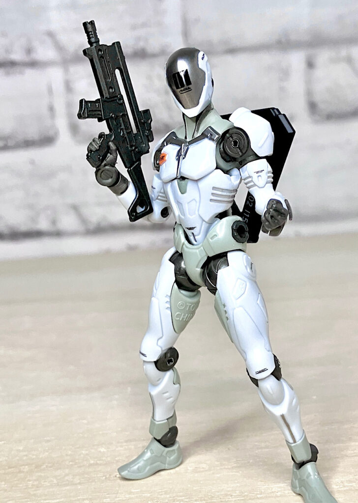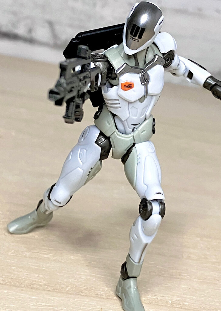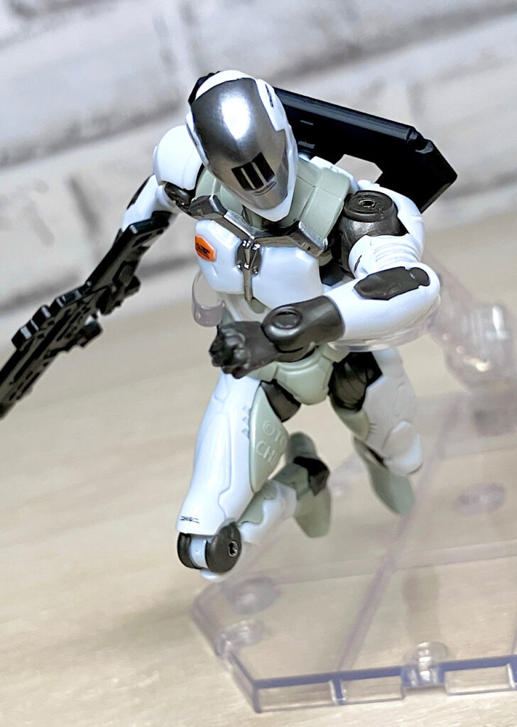 【アップ】頭部も無機質なフルバイザー型のヘルメット。シルバーに光っているのはやっぱりミクロマンの系譜であることを物語っているのでしょうか?そして顔の「01」は、記念すべき第1弾フィギュアであることのメタネタかもしれません。