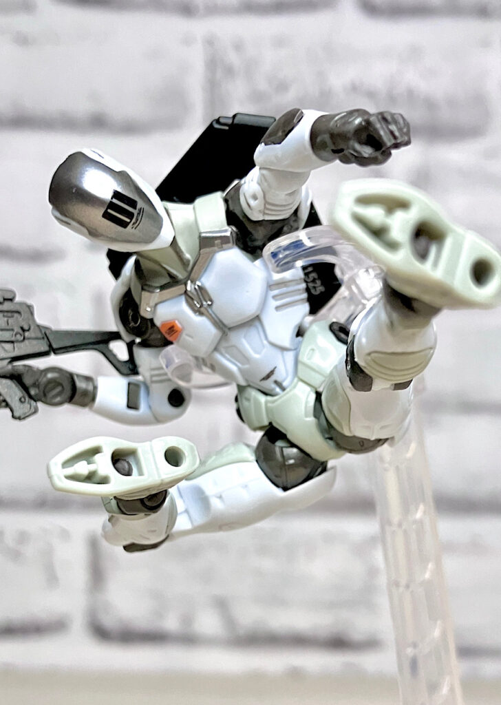 【可動】ここはもちろん最大のウリになる部分でしょう。特にこのフリゲートはほぼ素体なシルエットですし、グリグリ動かすことができます。ただし肩アーマーがボディと干渉して可動域を狭めているのが気になります。しかも他のパーツに引っかかって外れてしまうこともしばしば。