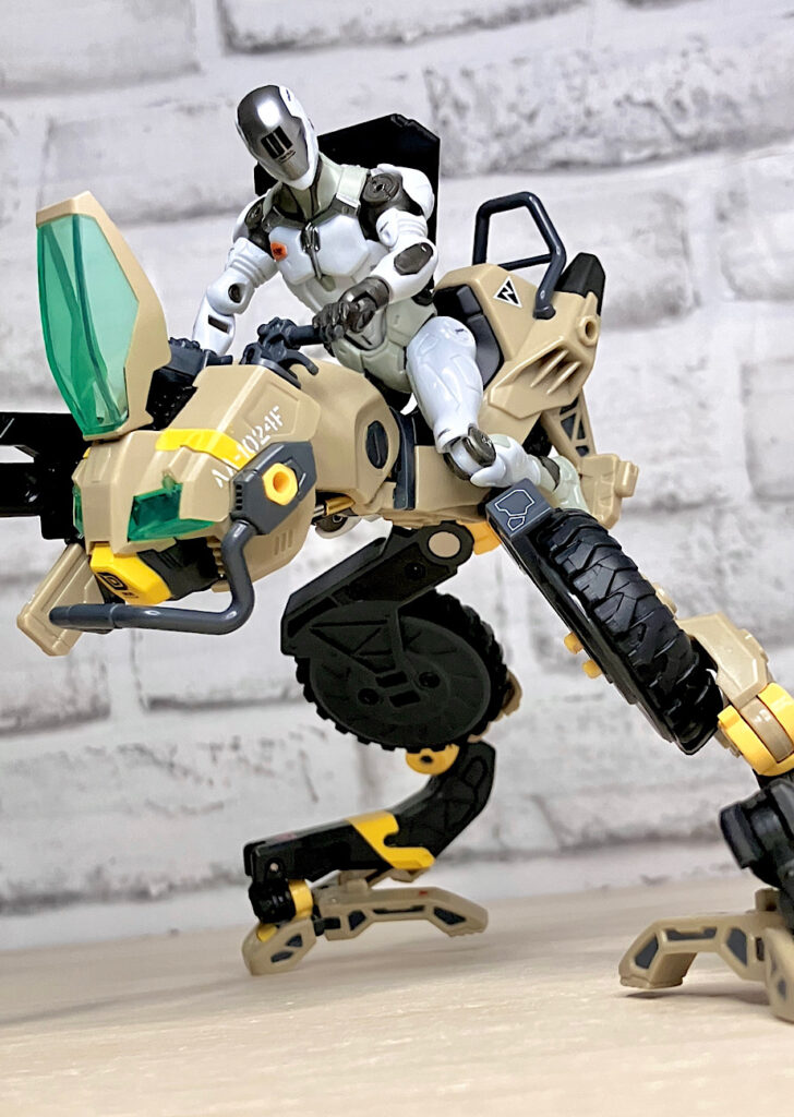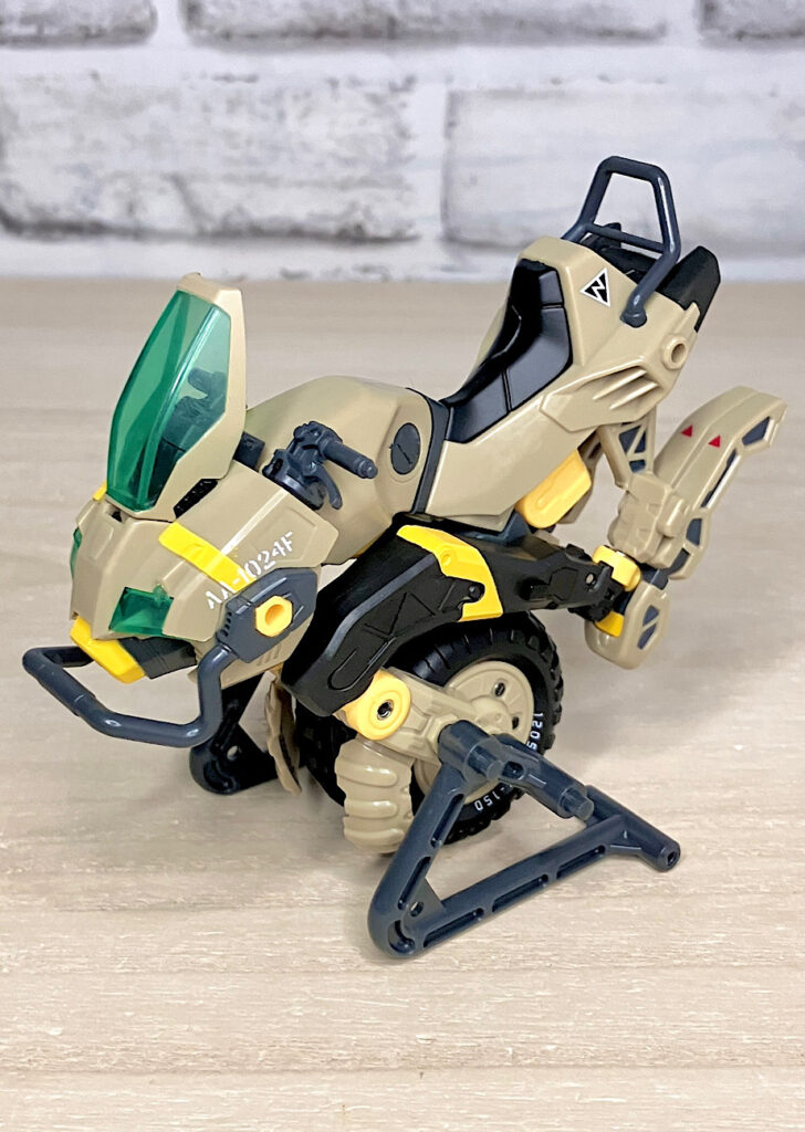【コンバットシフト】さてこのカヴァス、バイク状態の「ビークルシフト」から、半ロボットな「コンバットシフト」に変形が可能。下部のパーツを伸ばして脚部にし、フロント部を持ち上げる感じ。まあ感覚的にはSWのウォーカーですね。