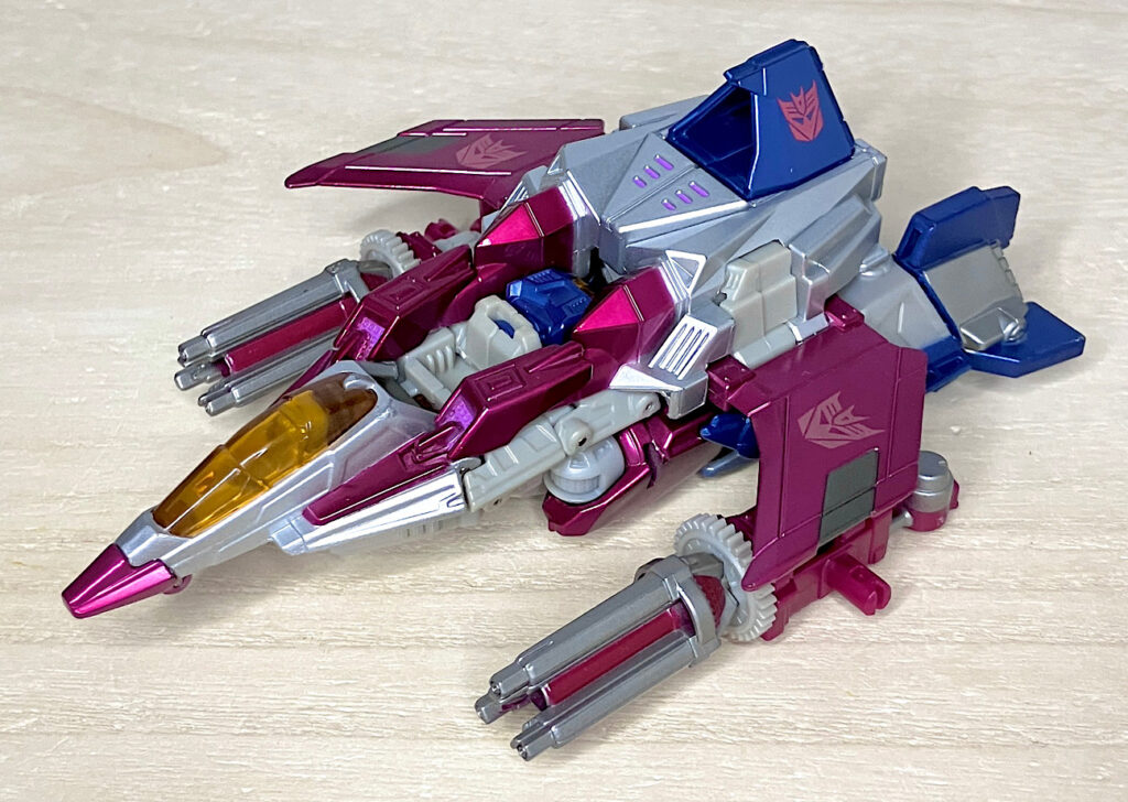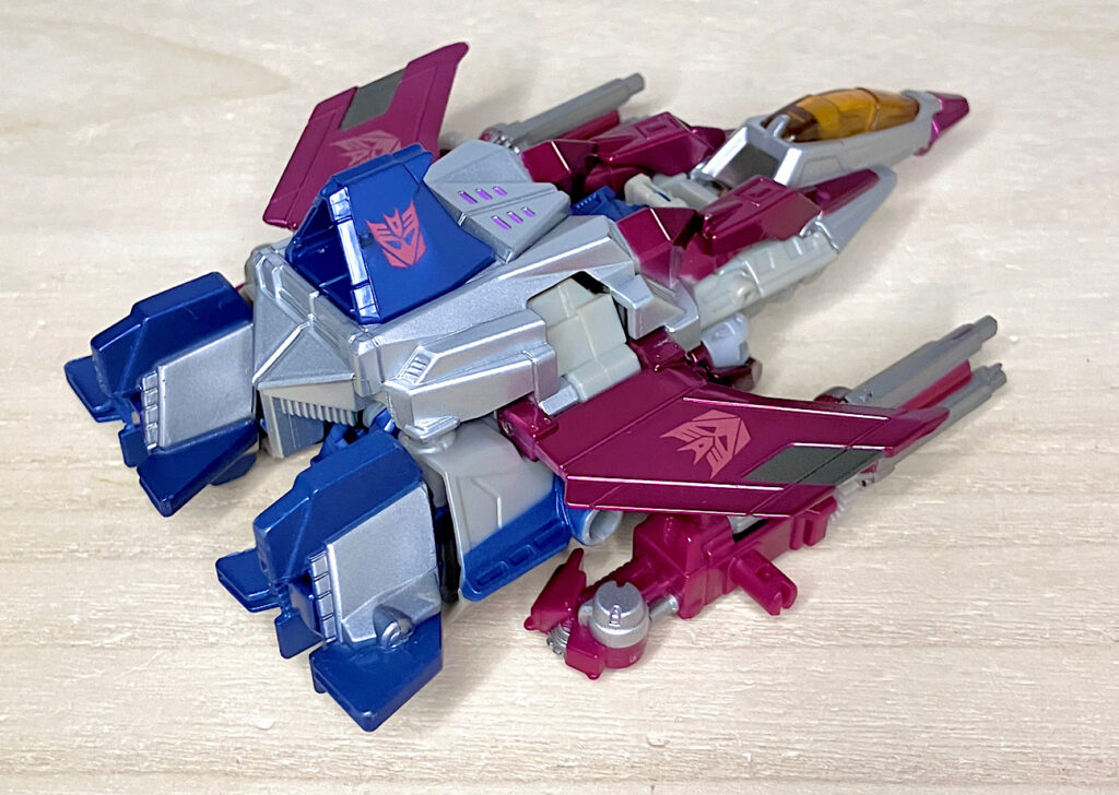 【ビークルモード】サイバトロンSFジェットに変形。なんかウィングが小さくてジェット機っぽくないし、全体的にディフォルメされている印象。ウィングは劇中でももう少し大きかったんじゃないかな?