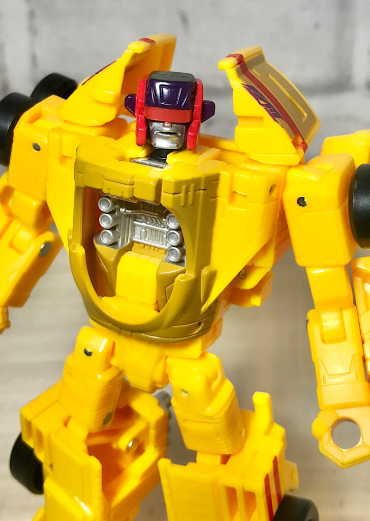 ロボットモード。良いハコ具合ですねぇ。車から変形したことがすぐわかる各種パーツも素敵です。あと特筆したいのが色。全身ほぼ黄色の成形色1色なのですが、黄色の色合いやプラの厚みのせいか、意外と安っぽさが無いんですよね。