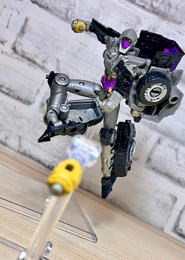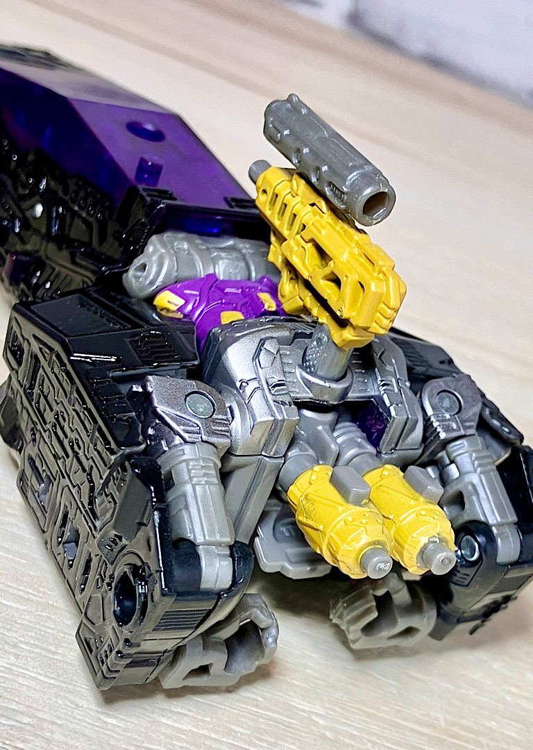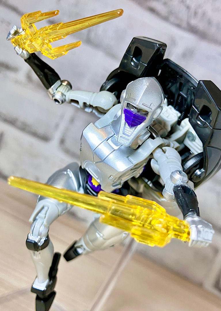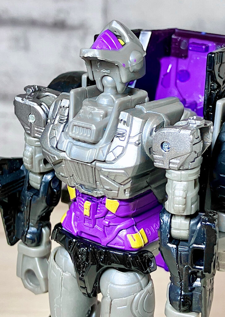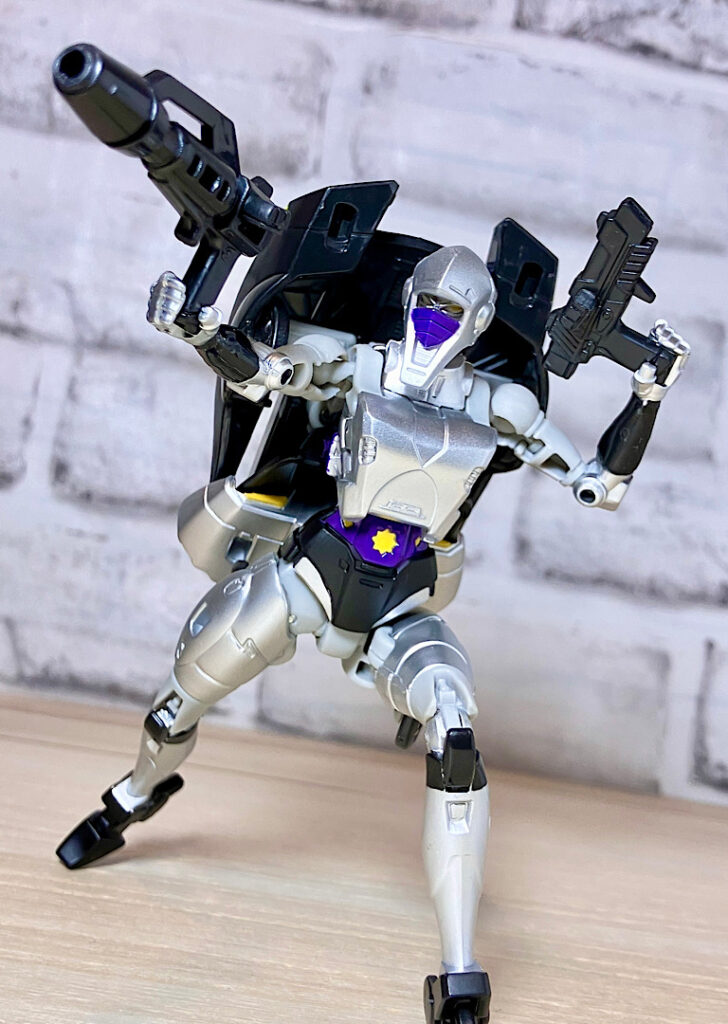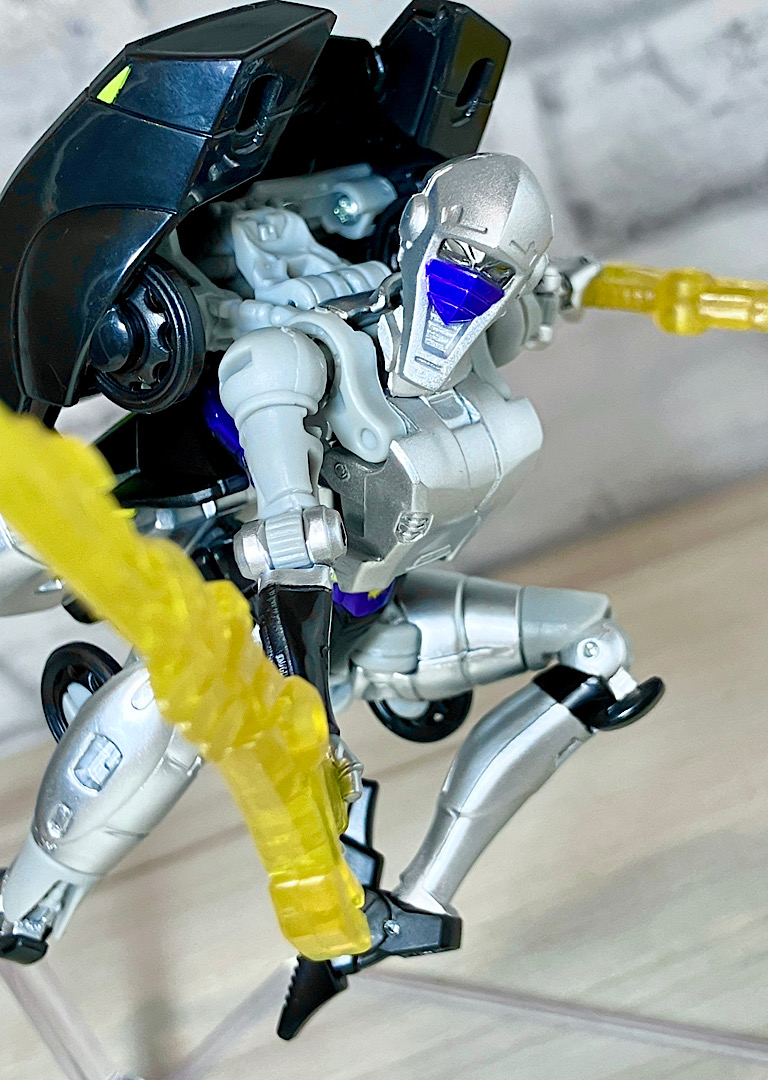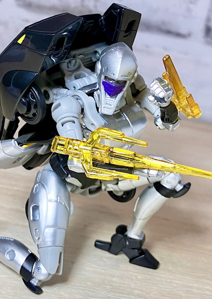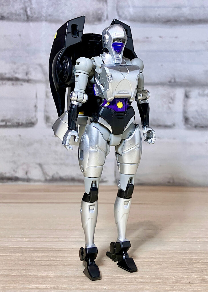 【変形】バックパックからビークルのガワを伸ばしてかぶせる半ガワ変形。それでもボディがビークルの一部を構成したりと工夫が見られます。難易度は簡単な方ですが、個人的にはそんなに楽しい変形ではありません。