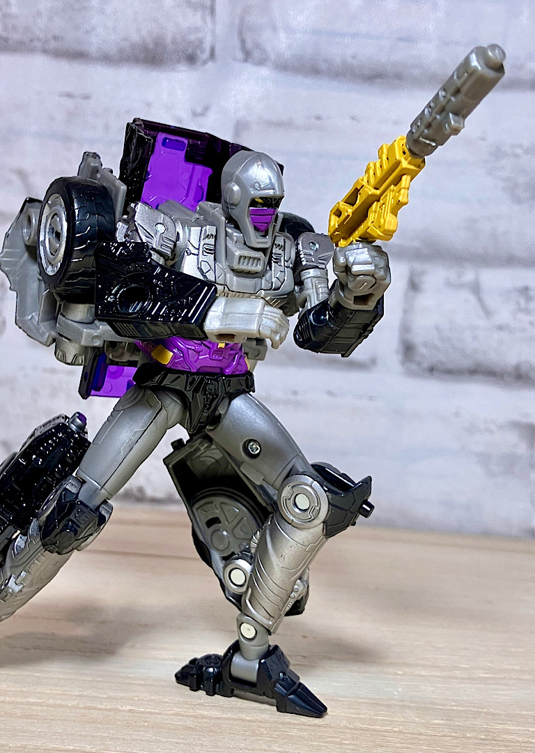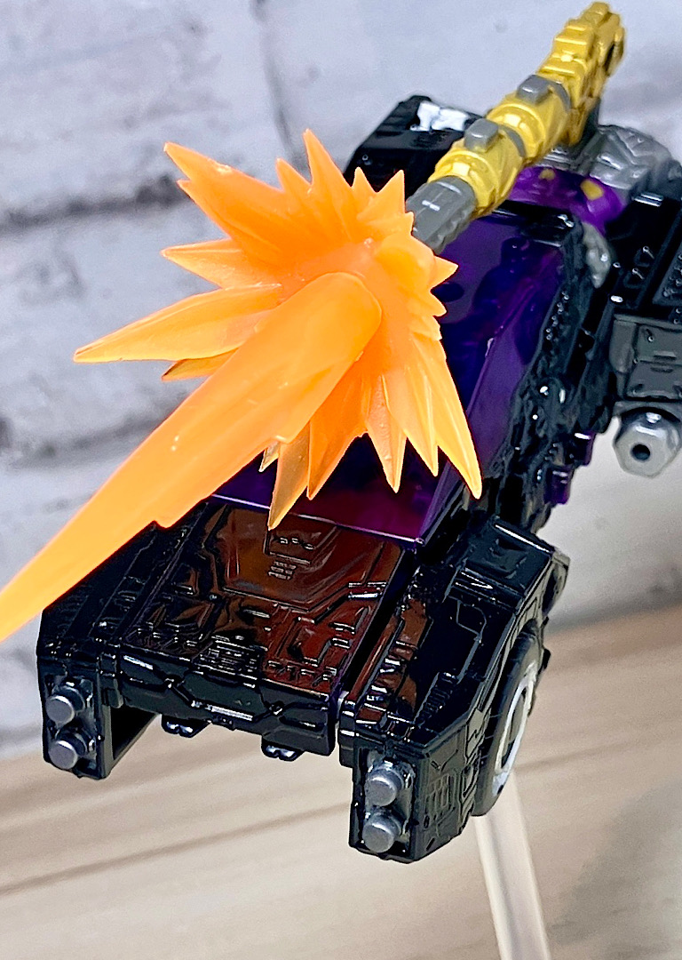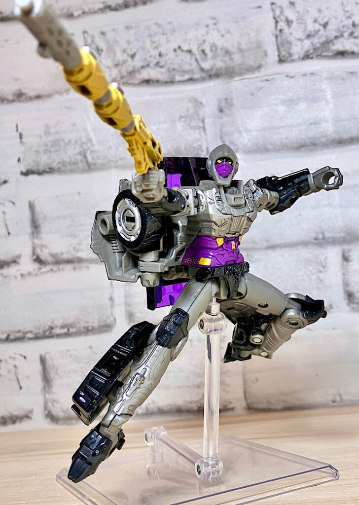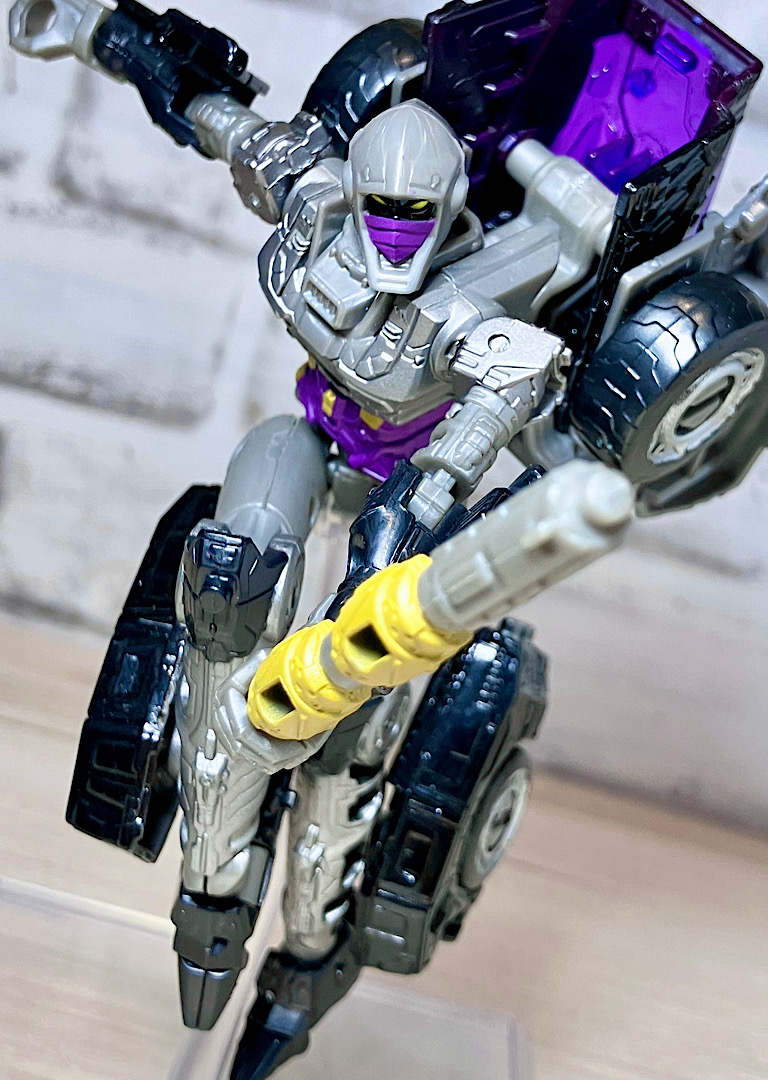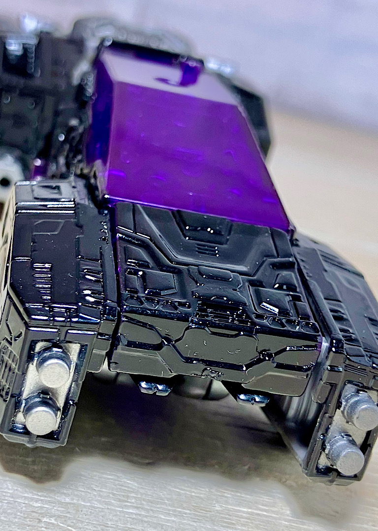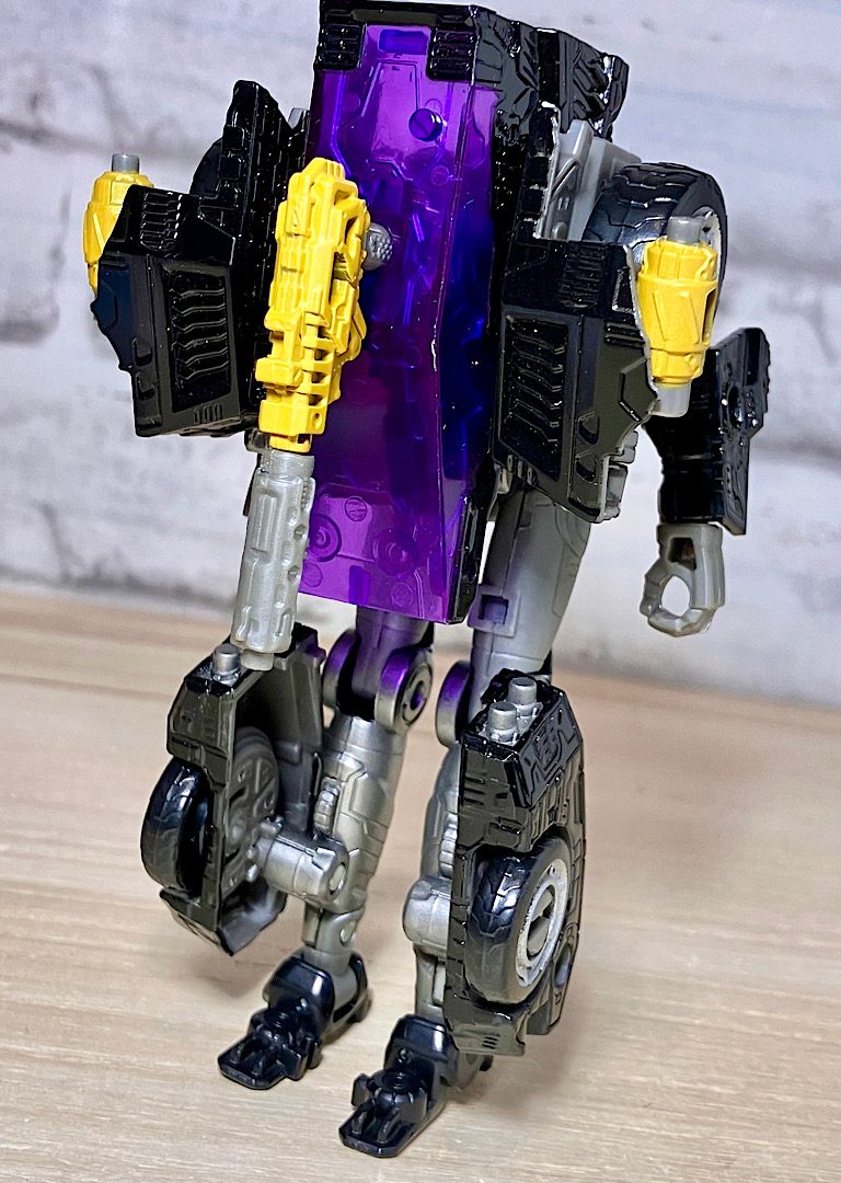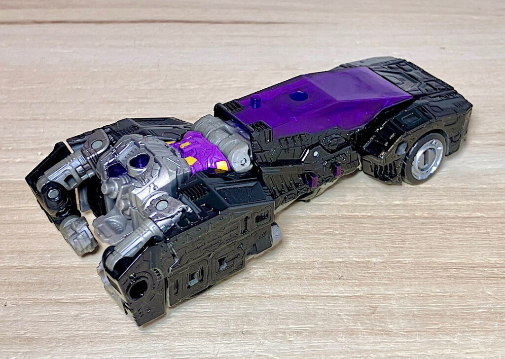 【変形】バックパックからビークルのガワを伸ばしてかぶせる半ガワ変形。それでもボディがビークルの一部を構成したりと工夫が見られます。難易度は簡単な方ですが、個人的にはそんなに楽しい変形ではありません。