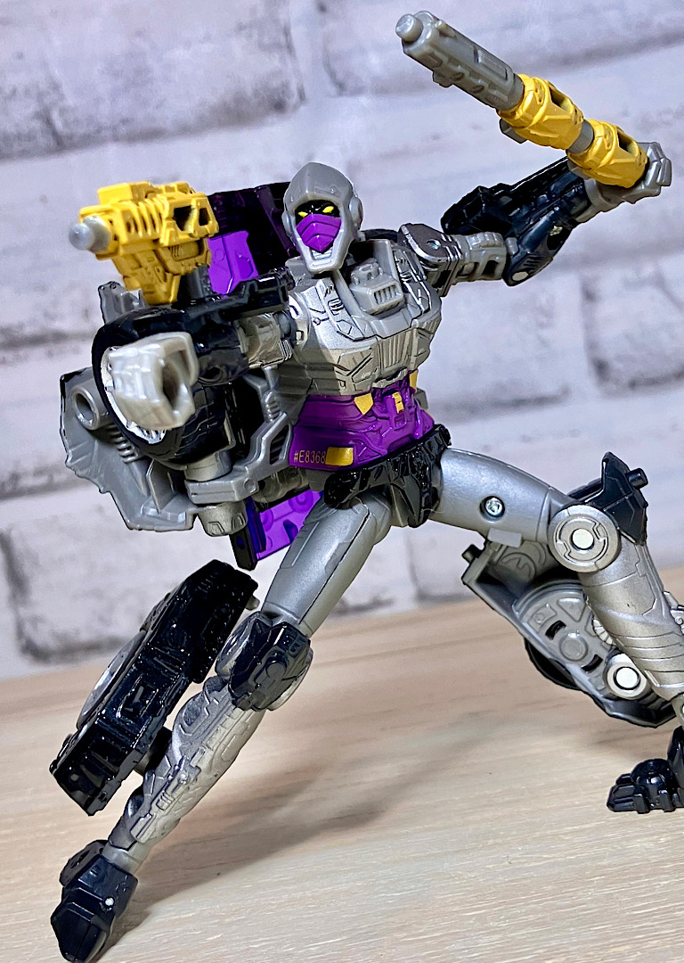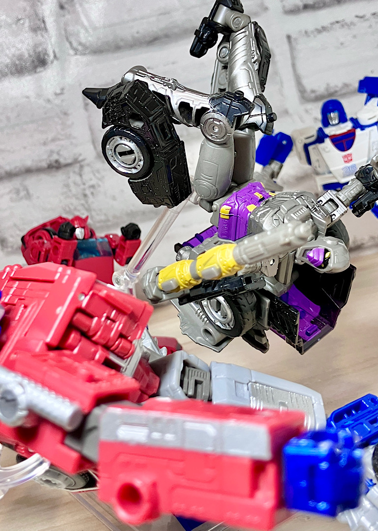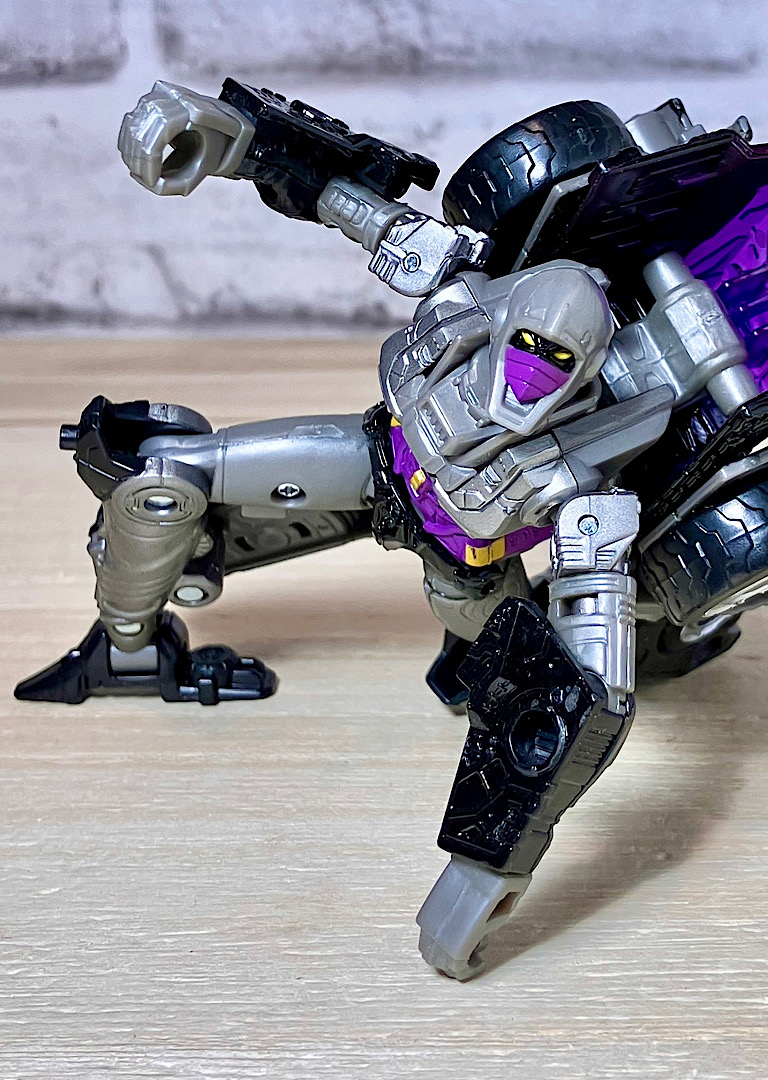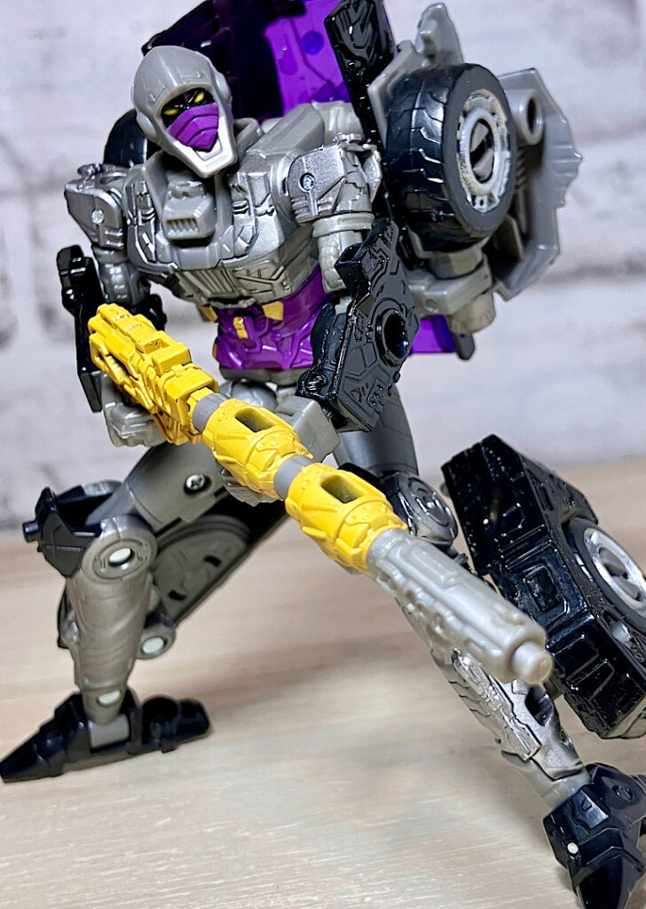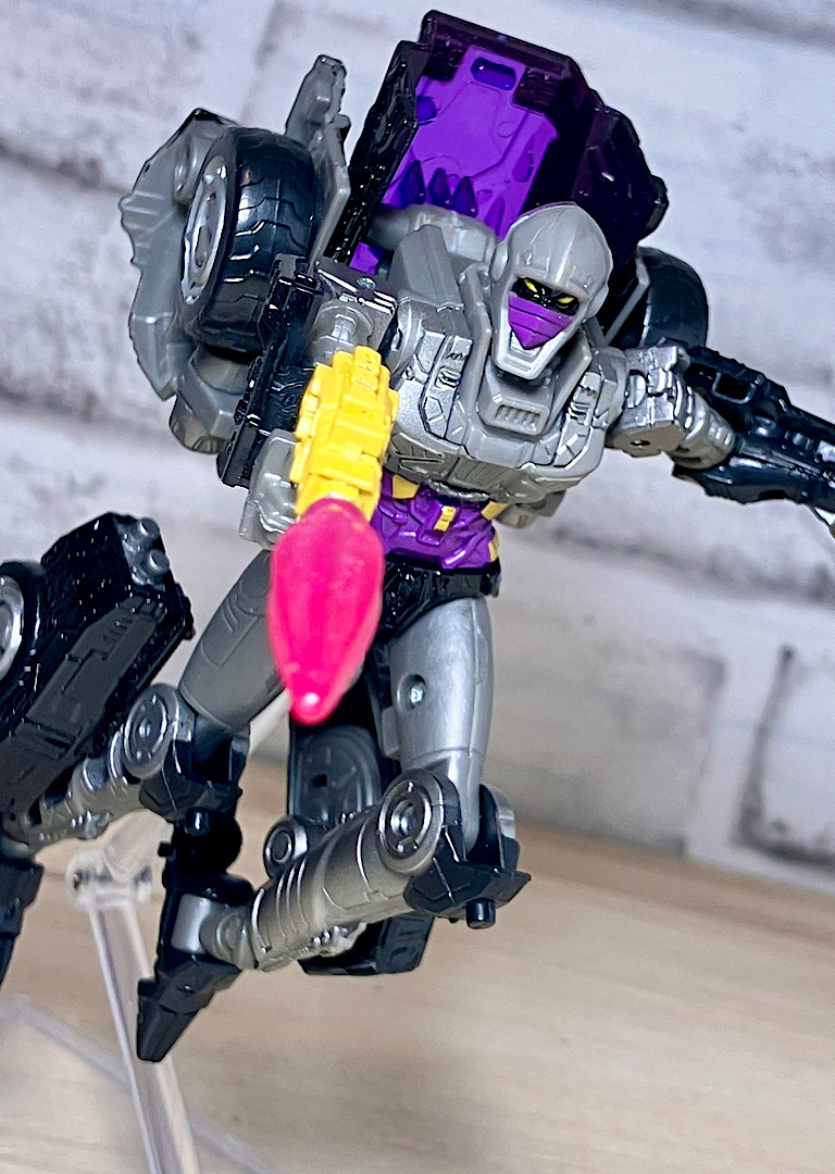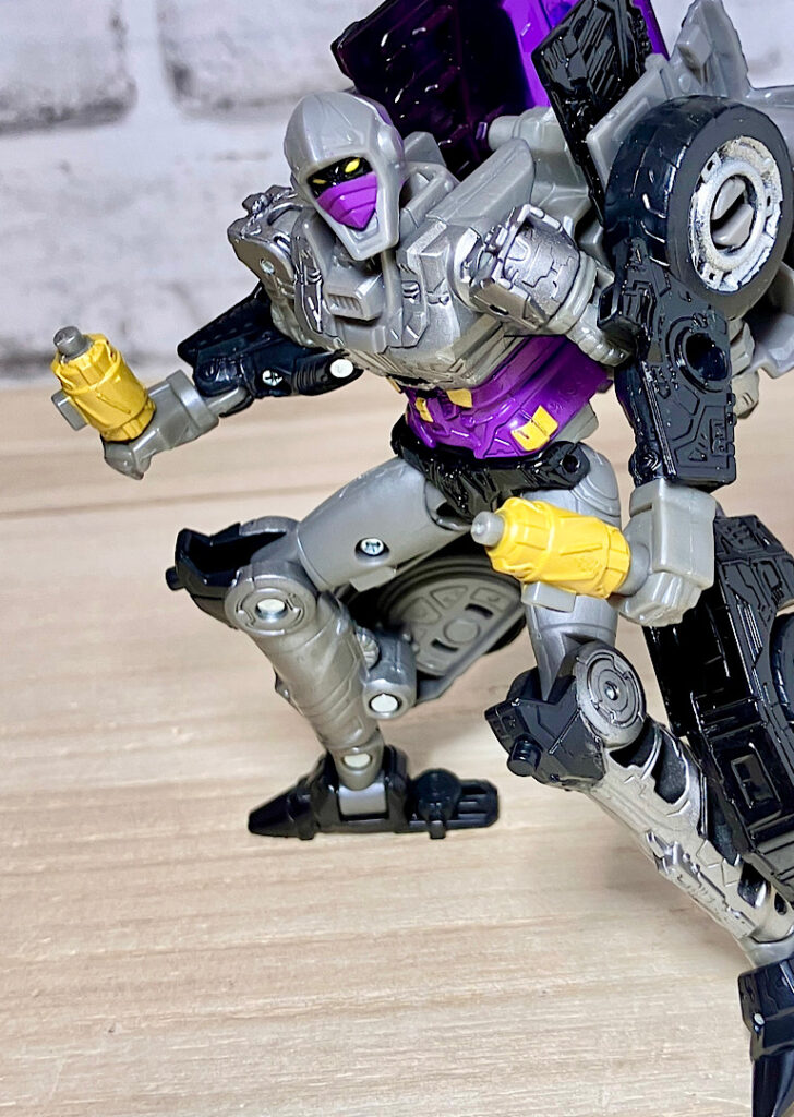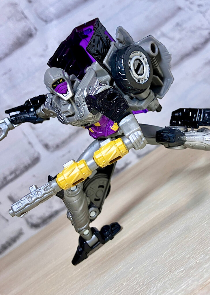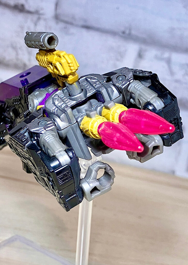 【変形】バックパックからビークルのガワを伸ばしてかぶせる半ガワ変形。それでもボディがビークルの一部を構成したりと工夫が見られます。難易度は簡単な方ですが、個人的にはそんなに楽しい変形ではありません。