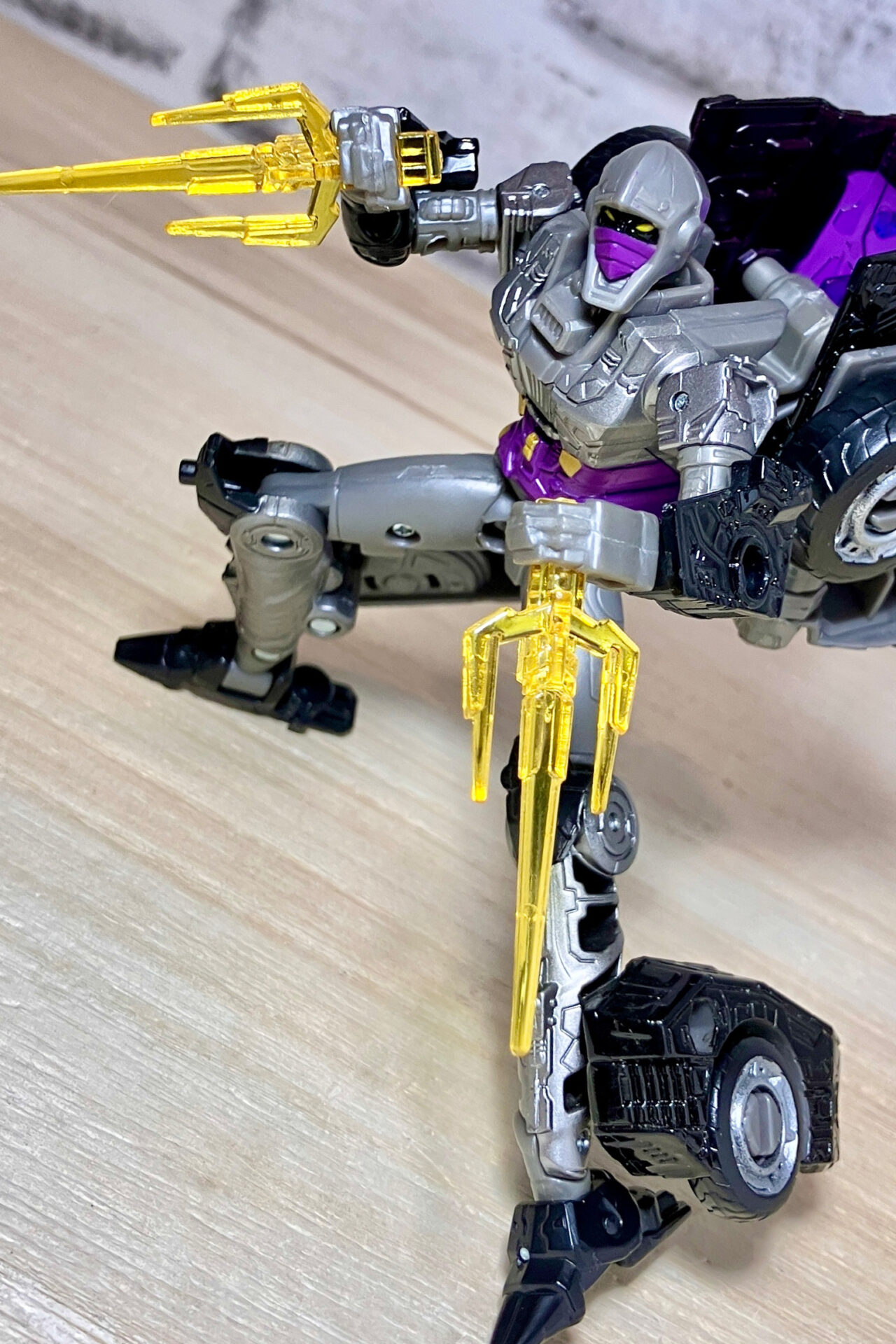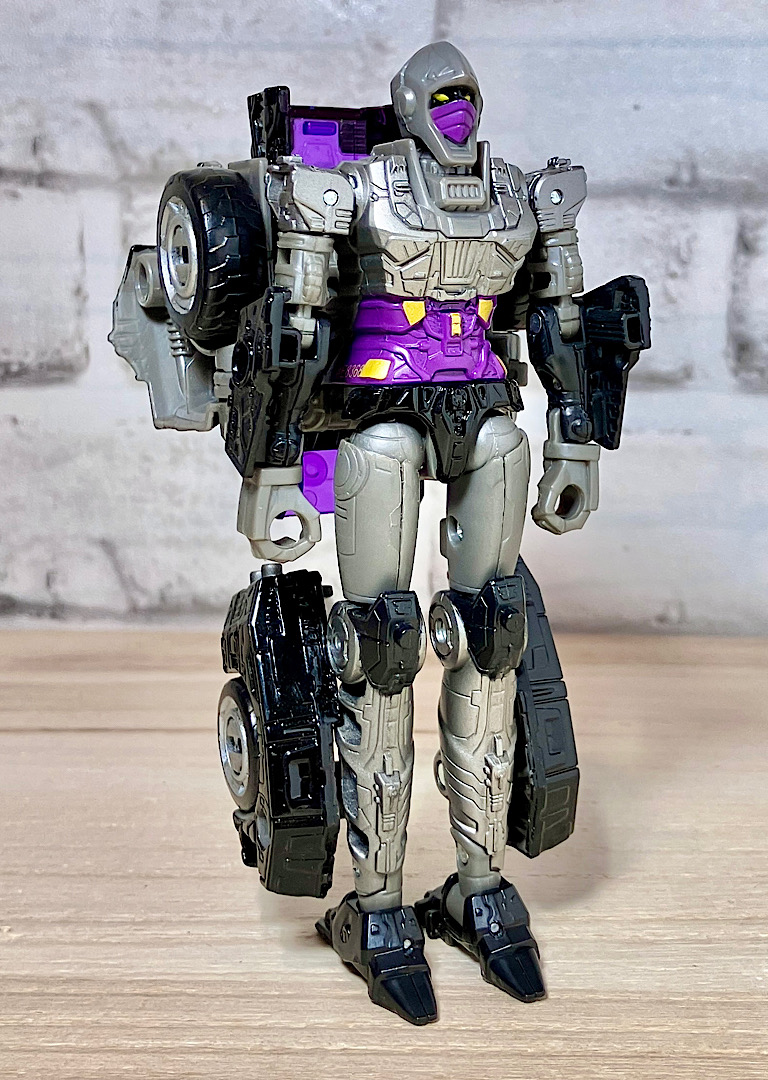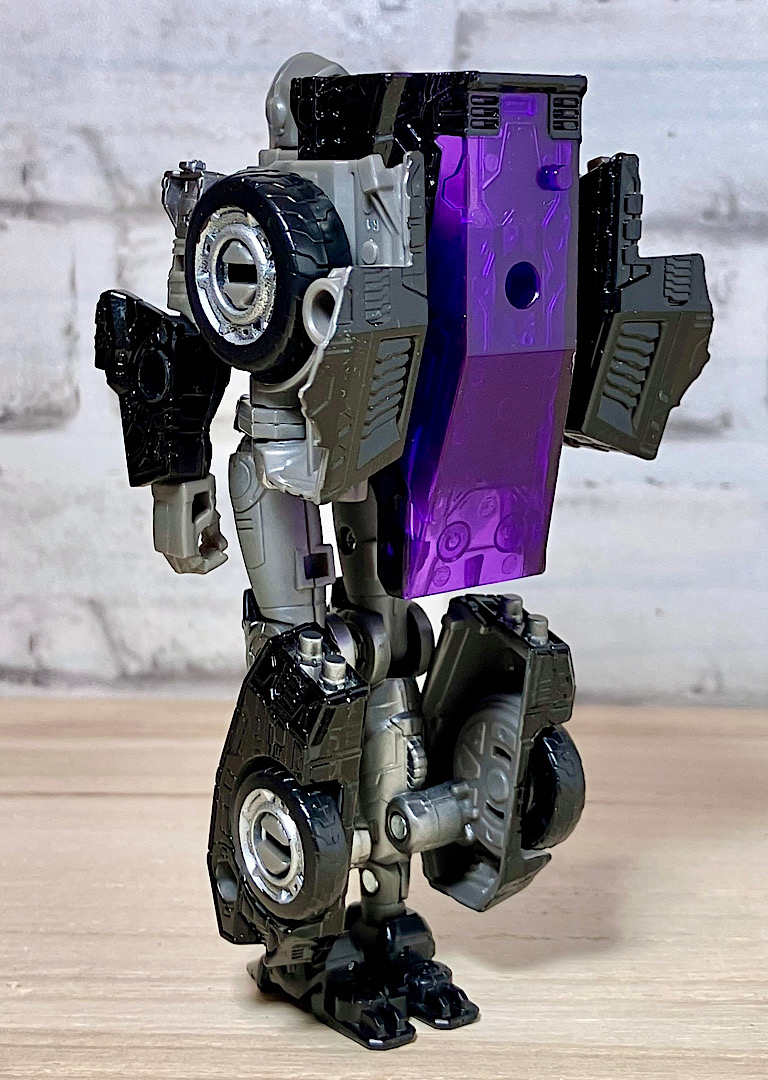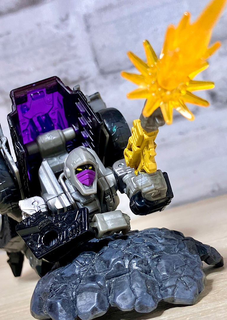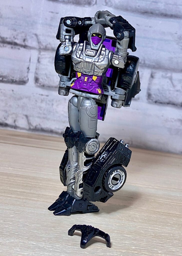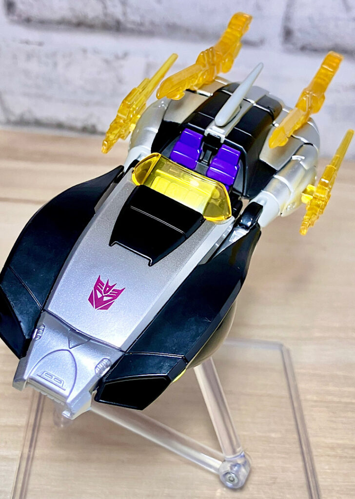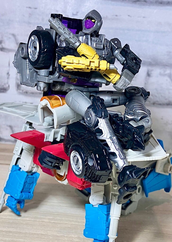 【変形】バックパックからビークルのガワを伸ばしてかぶせる半ガワ変形。それでもボディがビークルの一部を構成したりと工夫が見られます。難易度は簡単な方ですが、個人的にはそんなに楽しい変形ではありません。