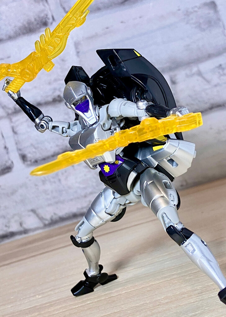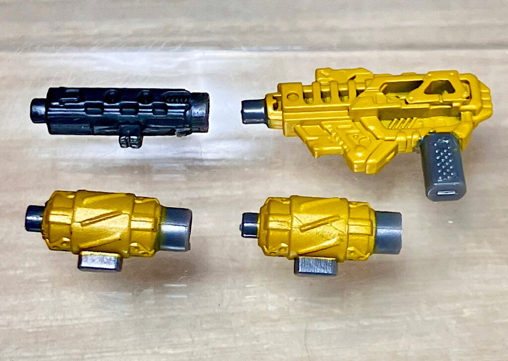 大小のブラスターがひとつずつ、イエロークリアの剣とサイが2つずつ付属。本体が小さめだからか、やたら豪華なんですよね。