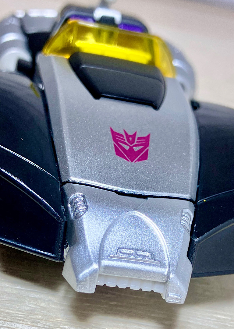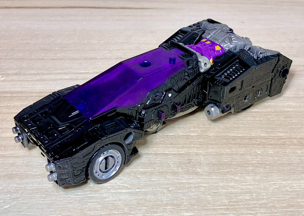 【ビークルモード】サイバトロンSFカーに変形。シージの前年POTPでリリースされたムーンレーサー型を踏襲しつつもほとんどのパーツが新規で、何といっても情報量感マシマシのモールドが特徴です。