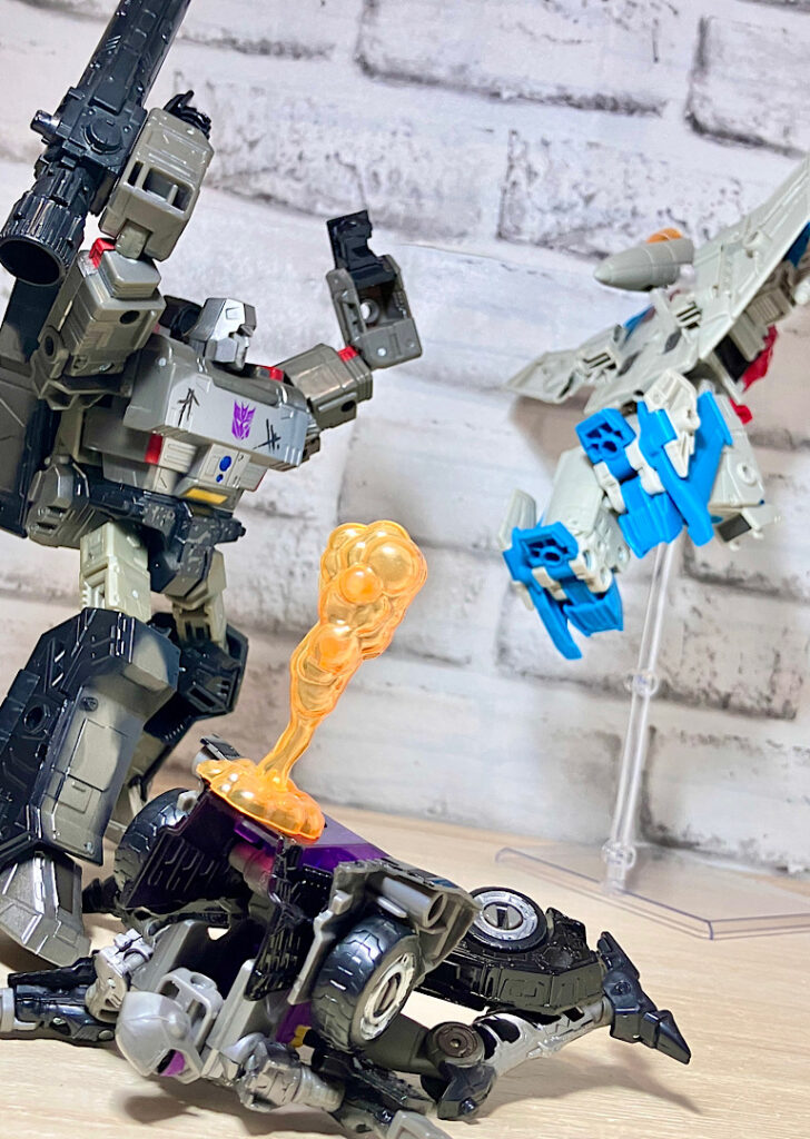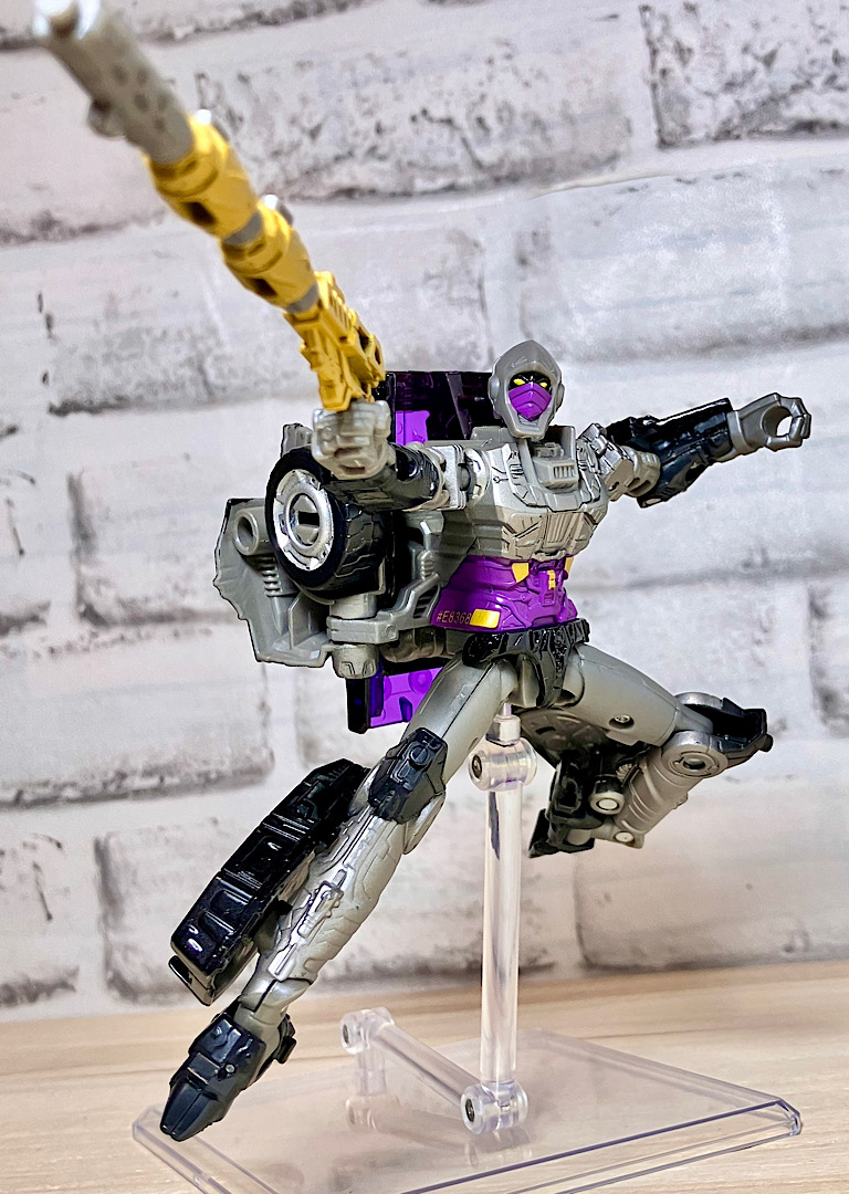 【可動】この型は可動がいまいちで、変形の時には腰回転があるのにロボモードでは固定されていて回せないというよくわからない仕様だったりします。