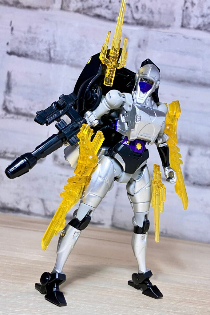 【ロボットモード】元のアーシーの特徴でとてもフェミニンな体型。頭部もヘルメット部分が大きく造形されていてシージ版とはまた違った印象を持っていますね。