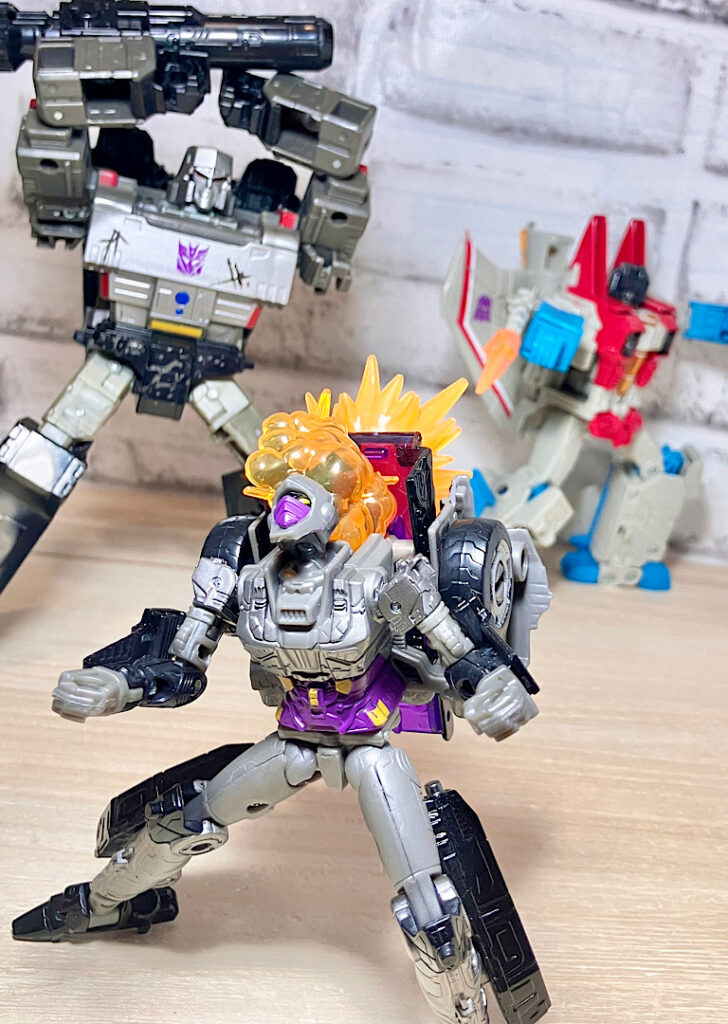 【パッケージ】G1アニメのゲストキャラ。フジヤマ博士(和名ハマダ博士)の手で作られたクノイチロボットですが性能は異常に高く、オートボットたちを翻弄しました。最後はあろうことかスタースクリームの嫉妬による不意打ちで機能停止。その話の流れを含めて印象深いネタキャラです。本来TFでは無いのですが、国内展開のレジェンズにてアーシーのリデコで立体化されて以来、ちょくちょく商品化されるようになりました。