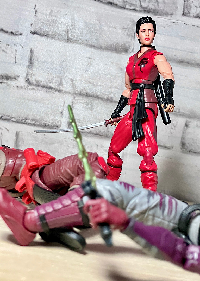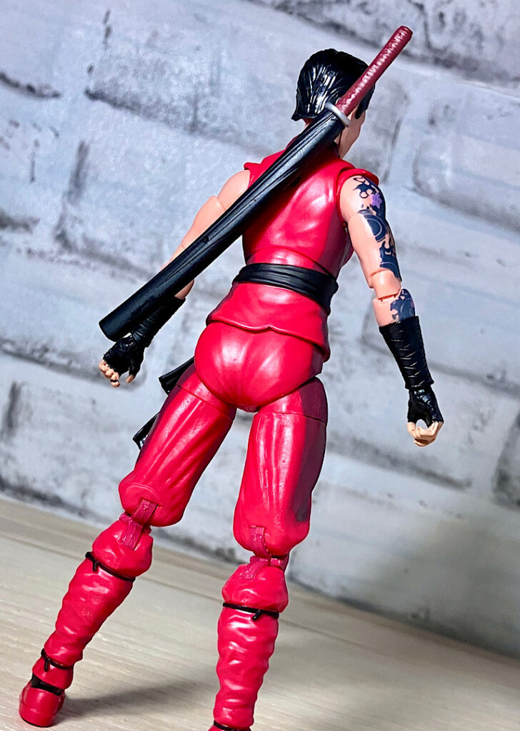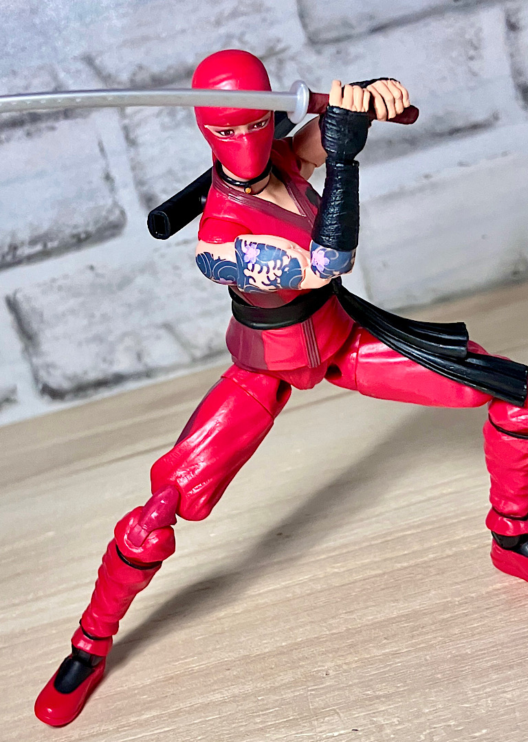 【フロント&リア】珍しい「女性忍者」枠のキャラなので、デザイン自体はシンプルなニンジャ。スネークアイズの黒、ストームシャドーの白に次ぐカラーとして赤になったんでしょうか。もちろん「忍ぶ」気はありませんw