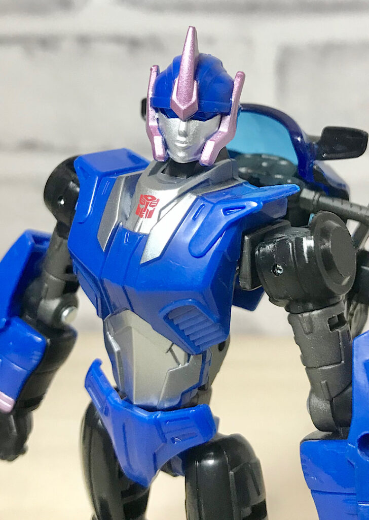 【フロント&リア(ロボ)】バイクから変形するプライムアーシー。特に背中にそのまま付いているカウルがいかにもでイイですね。女性型なので細身ではありますが、元のプライム版よりは各パーツがゴツめで中性的なデザインになっています。