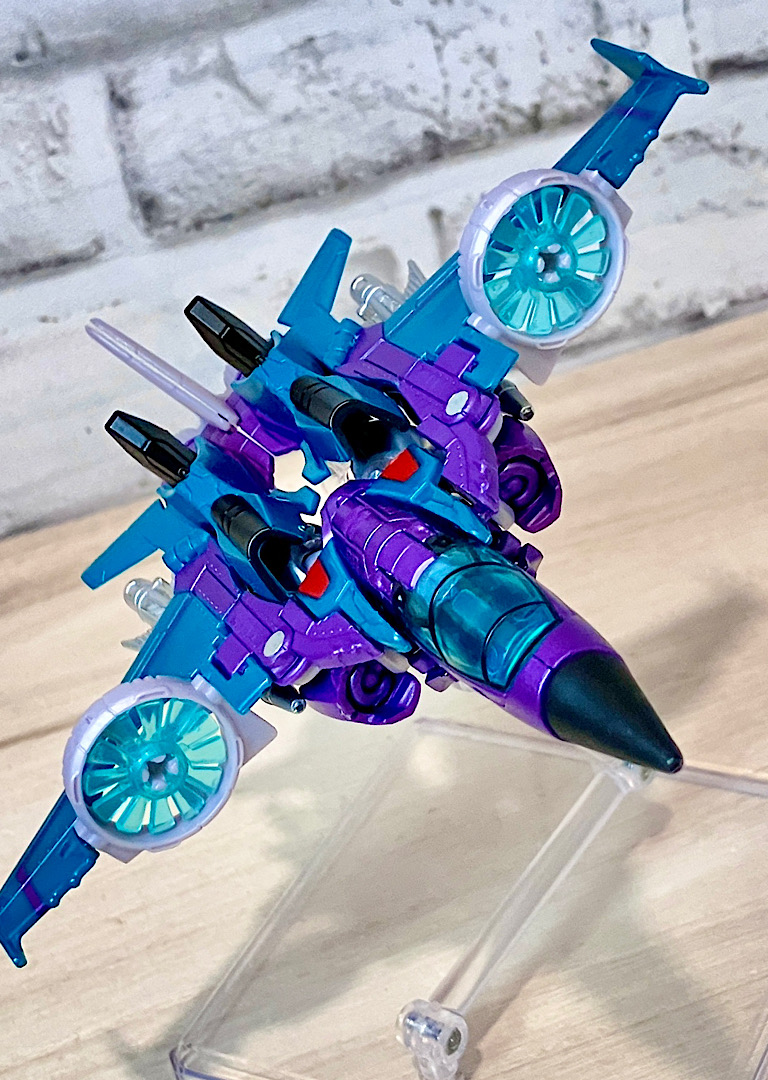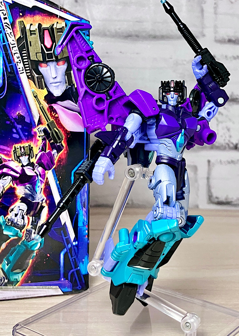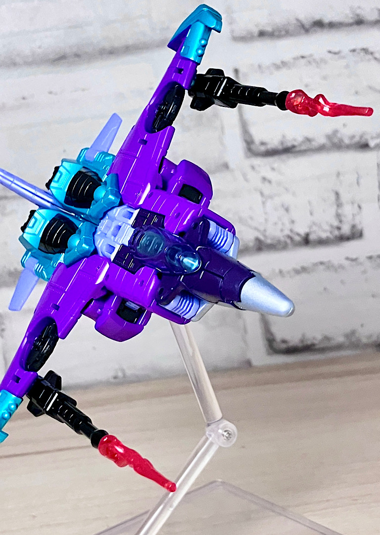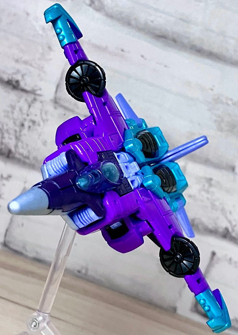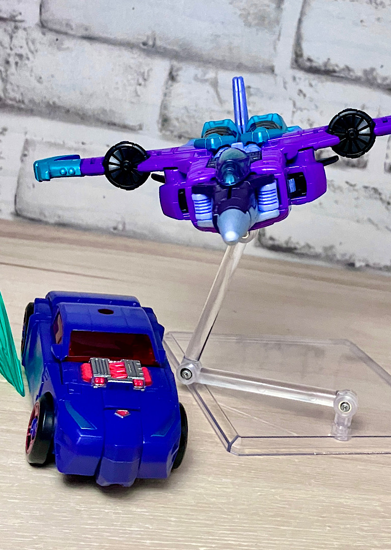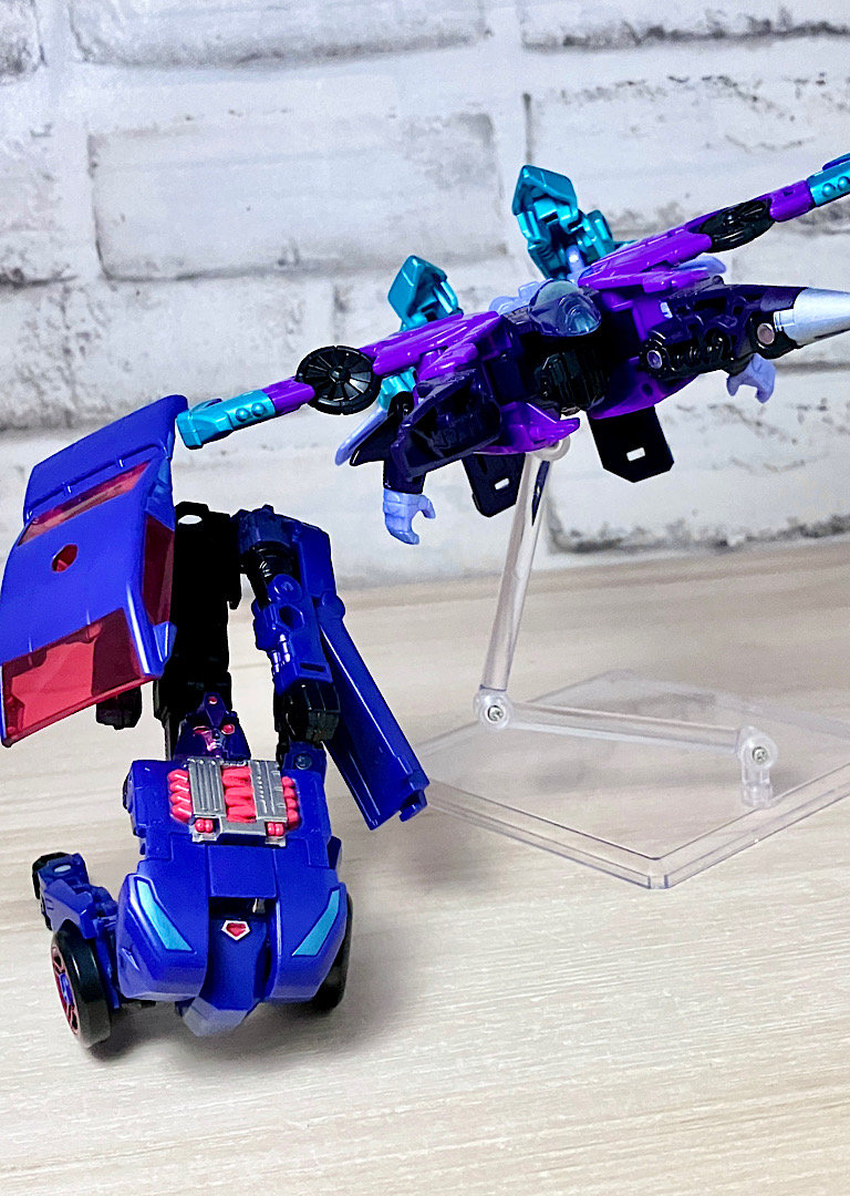 【パッケージ】アニメイテッドでスタースクリームのクローンとして初登場した女性型シーカー。キャラが立っていたためかその後アニメでよく拾われるようになり、今回レガシー化したのは「サイバーバース」に登場したスリップストリームです。CVではバンブルビーたちを執拗に追跡していたのが印象的。特に序盤はメインヴィランとして活躍していました。