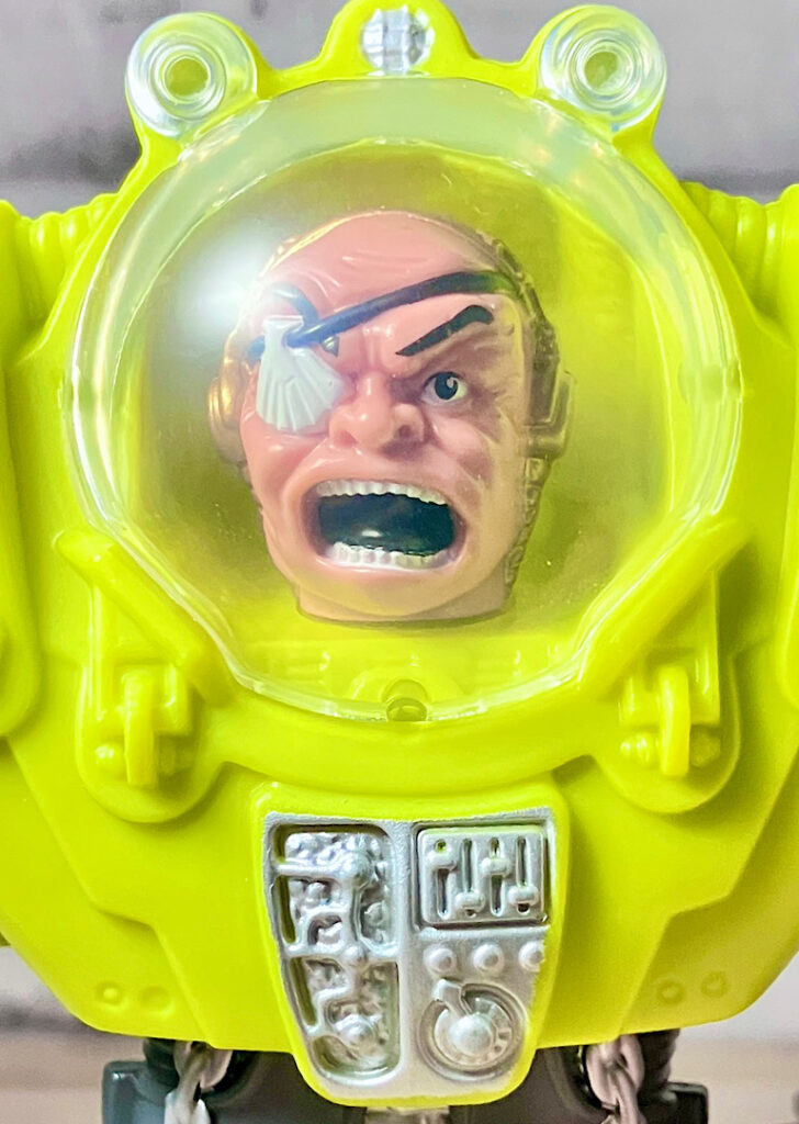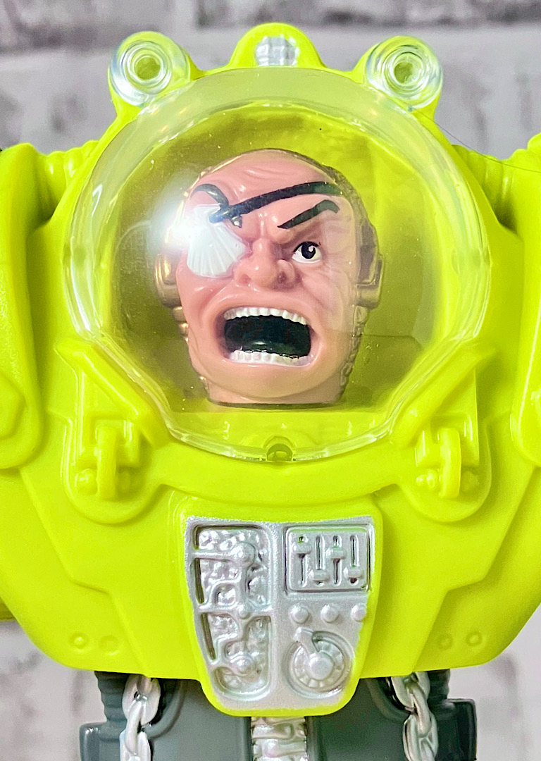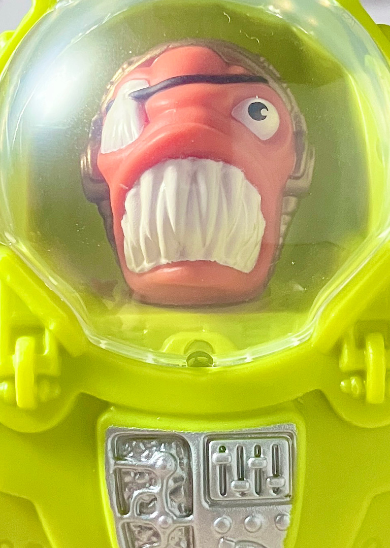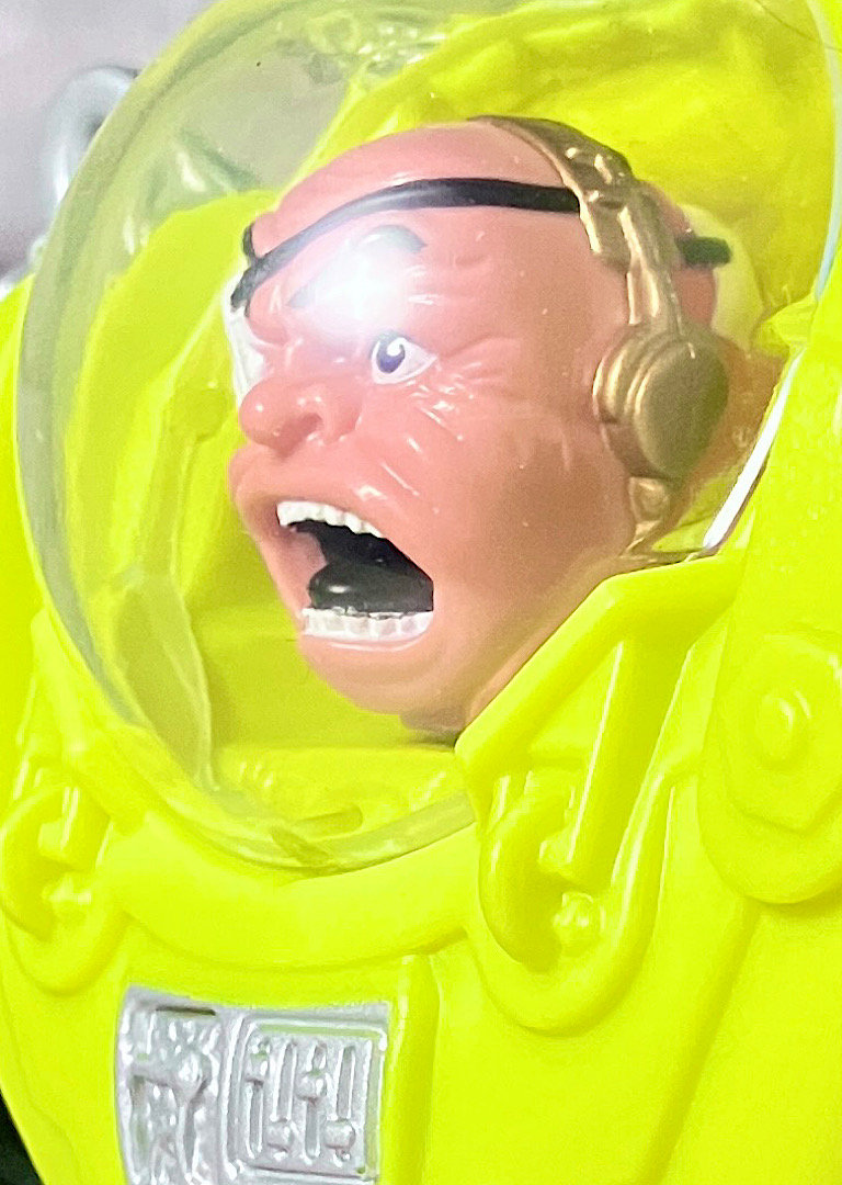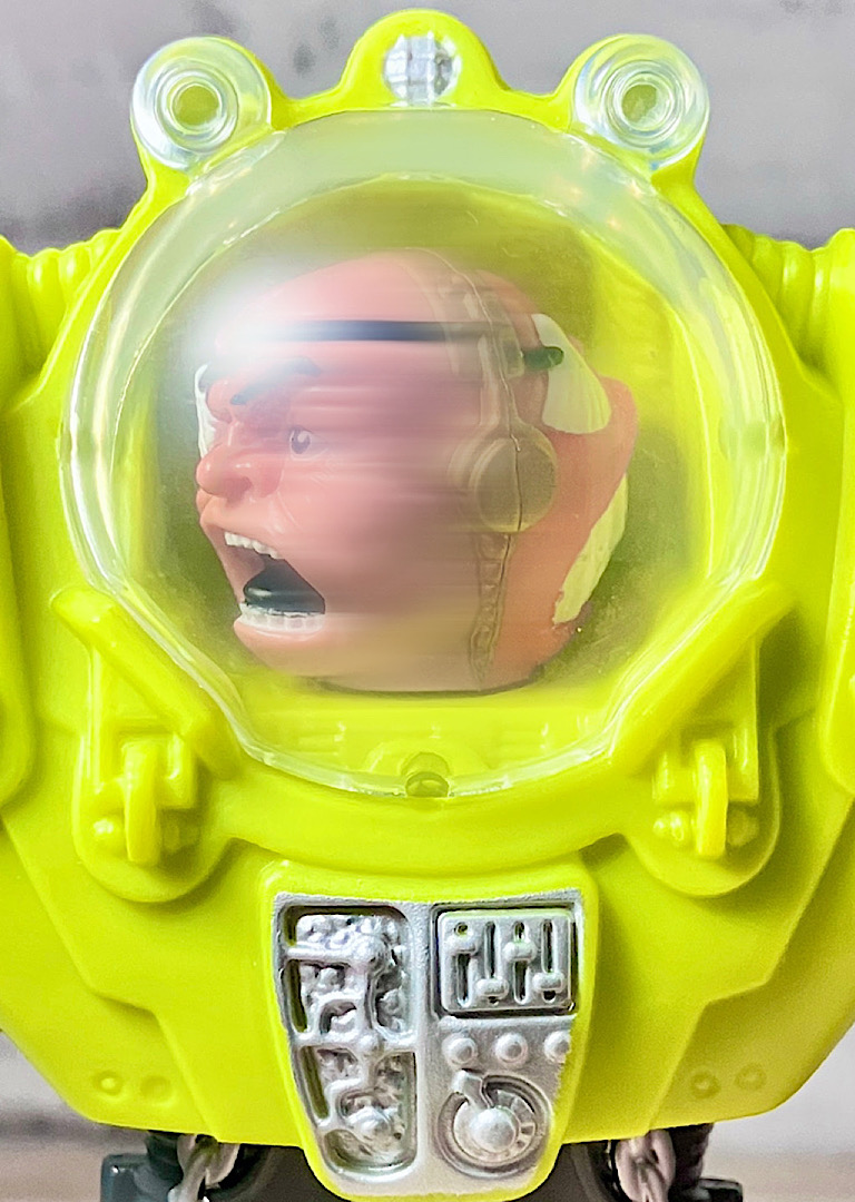 【アップ】頭部は透明カプセルに覆われています(テカるので撮影が難しい…)。日本の子供はたぶんあまり欲しがらない叫び顔のオッサンで、アイパッチが貝殻になっているのがオシャレw