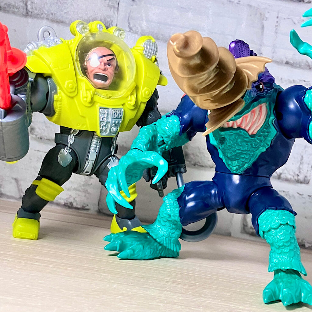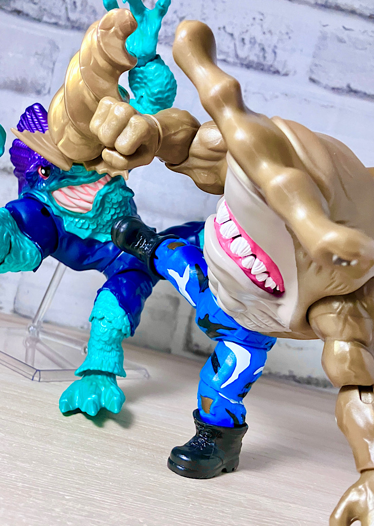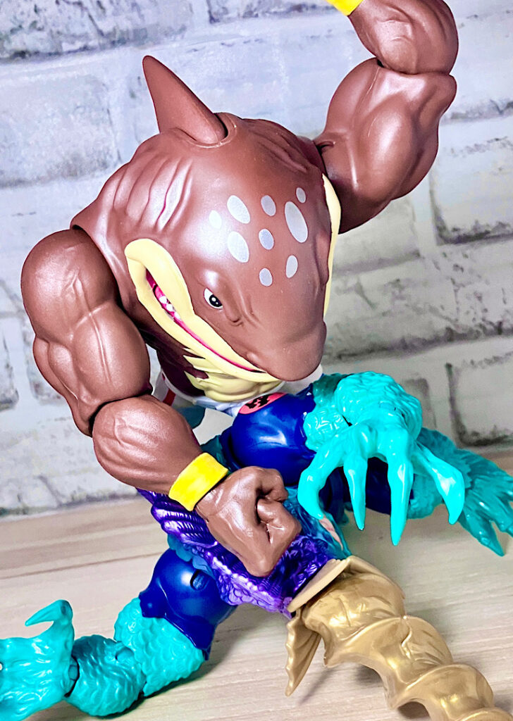 【パッケージ】1994年から3年ほど展開されたマテルのフィギュアシリーズ「STREET SHARKS」。ワンギミックを備えたムキムキフィギュアはMOTUを彷彿とさせつつ、水棲生物モチーフやビークル展開などはタートルズっぽさもあり、まさにアメリカン王道キッズ向けアクションフィギュアといった感じ。アニメもヒットしたみたいですね。