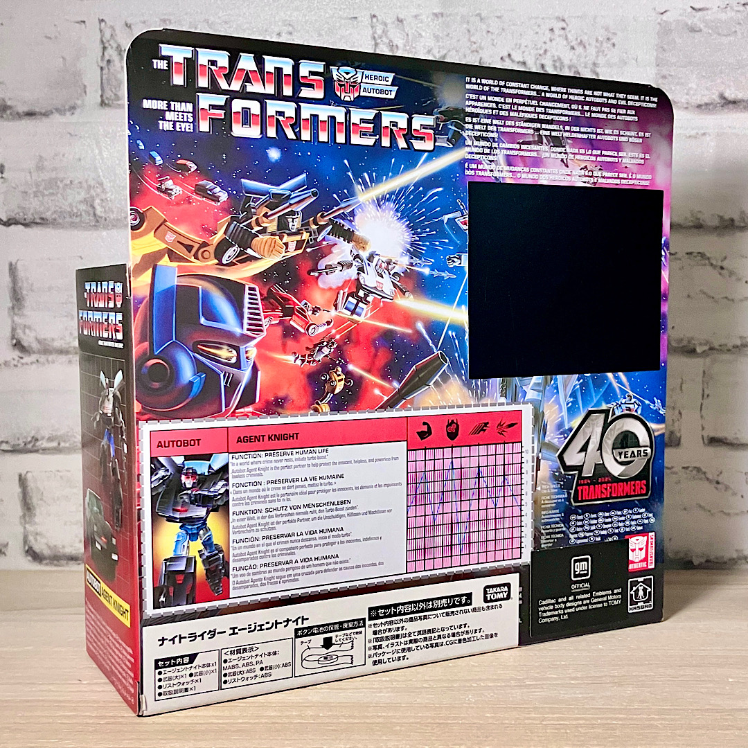 【パッケージ】往年のG1ビンテージトイ風パッケージで、エージェントナイトのイラストもなんとなくG1風。裏面にはテックスペックのチャートまであって細部まで凝っています。