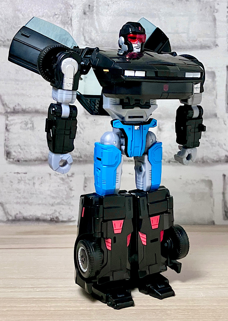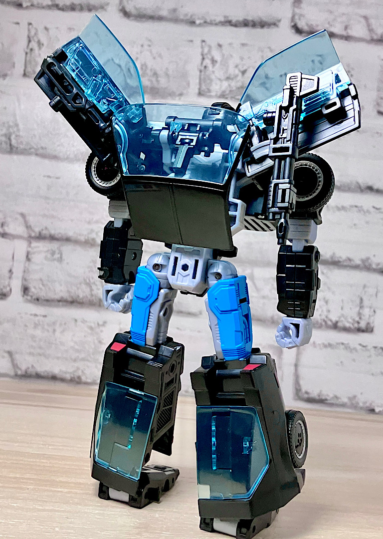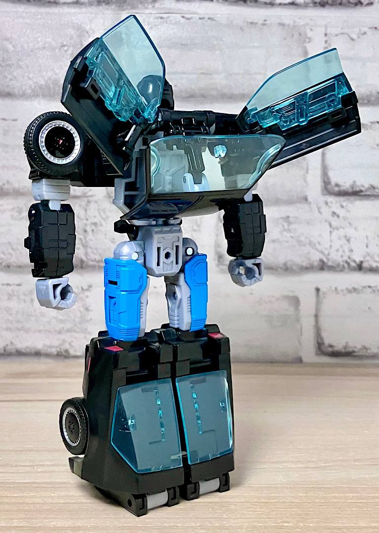 【ロボットモード】シンプルな変形行程を経て完成したのはやはり(TF的に)シンプルなシルエットのカーロボット。ボンネット胸、ドア羽、リア部の脚という王道なスタイルです。パーツはそんなに詰まっているわけではなくて軽めな感じ。