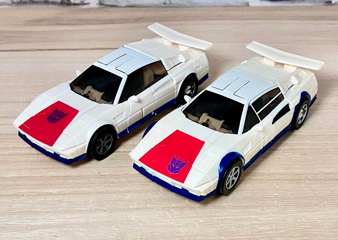 単品版(右)との比較。頭部変更のほか、塗装パターンも変えられ、G1トイのシールを模した模様まで再現されてますね。