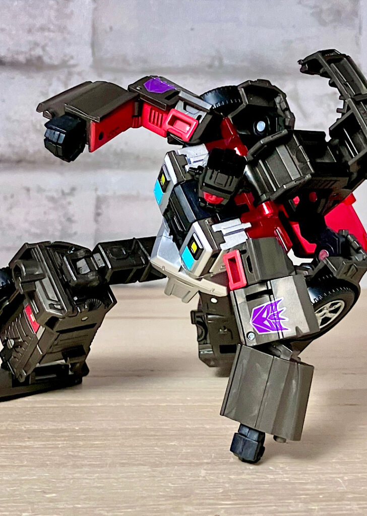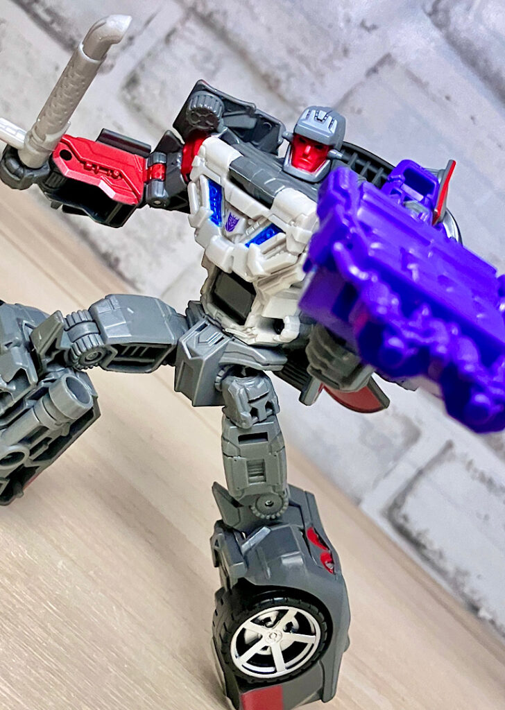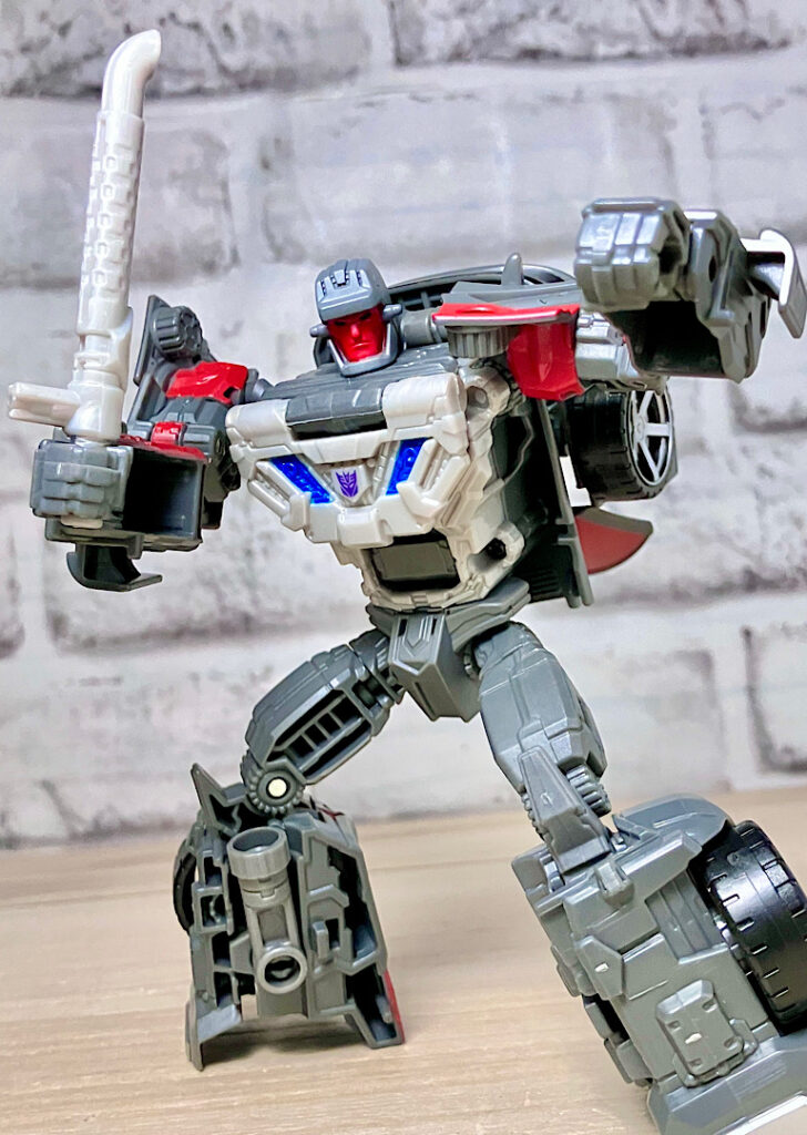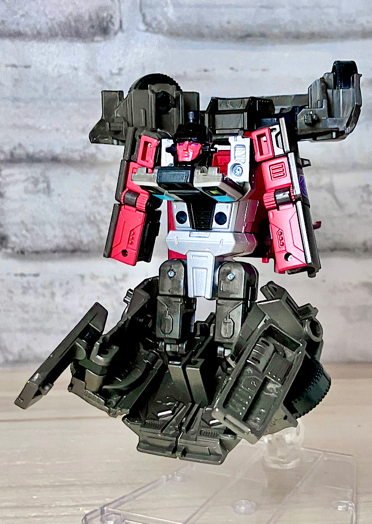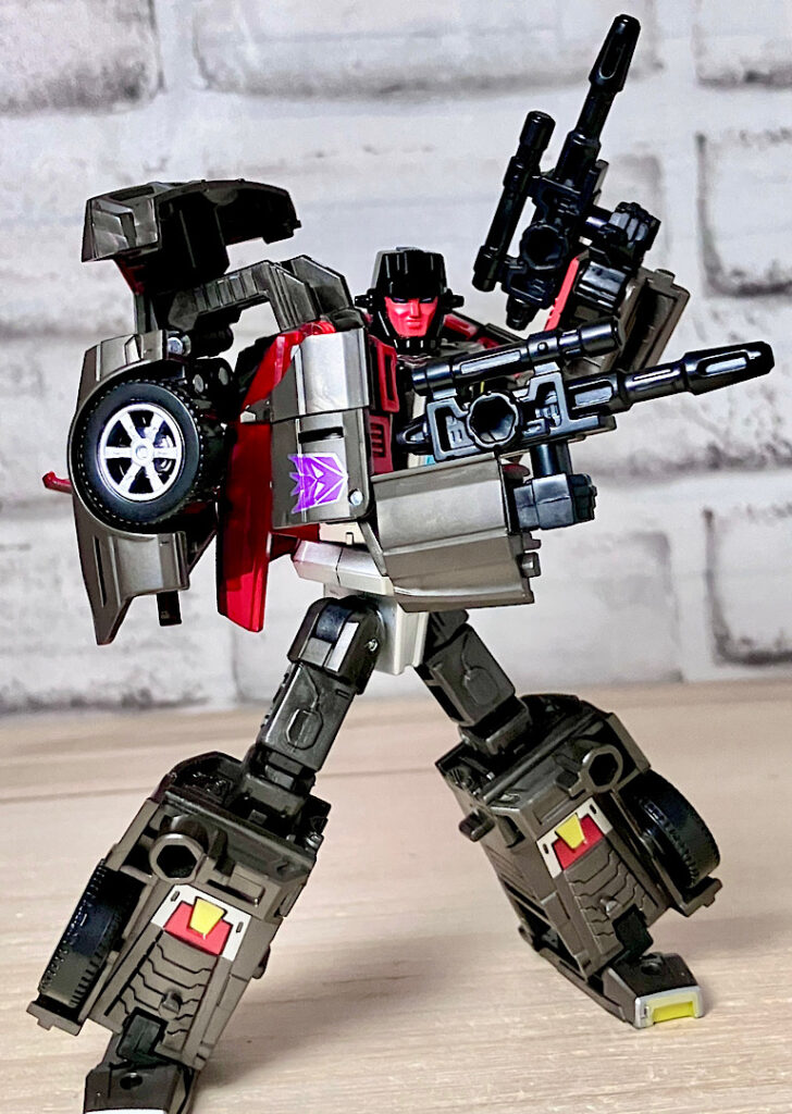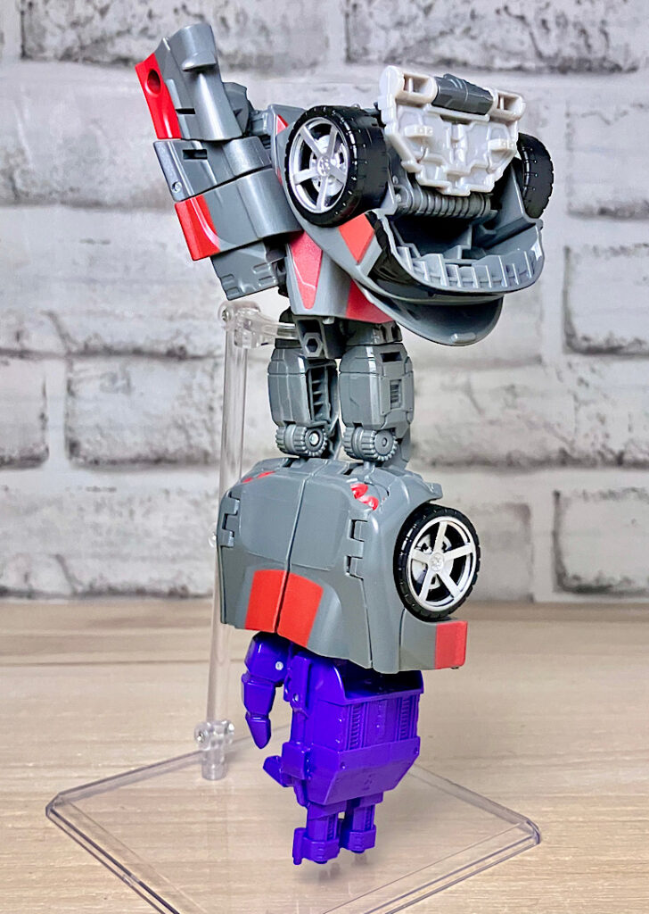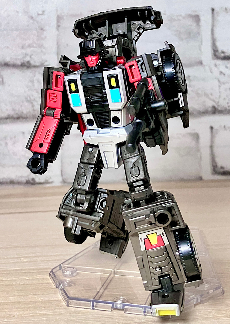 【ロボットモード】仲間のスタンティコンですら一緒に走りたくないほどの狂ったドライバー。レガシー単体版のリカラーアイテムで、全体的にブラック度合いがアップ。バックパックになっているボンネットが謎の分割をしているのが気になりますが、前から見た姿は概ねアニメやG1トイに準拠しています。