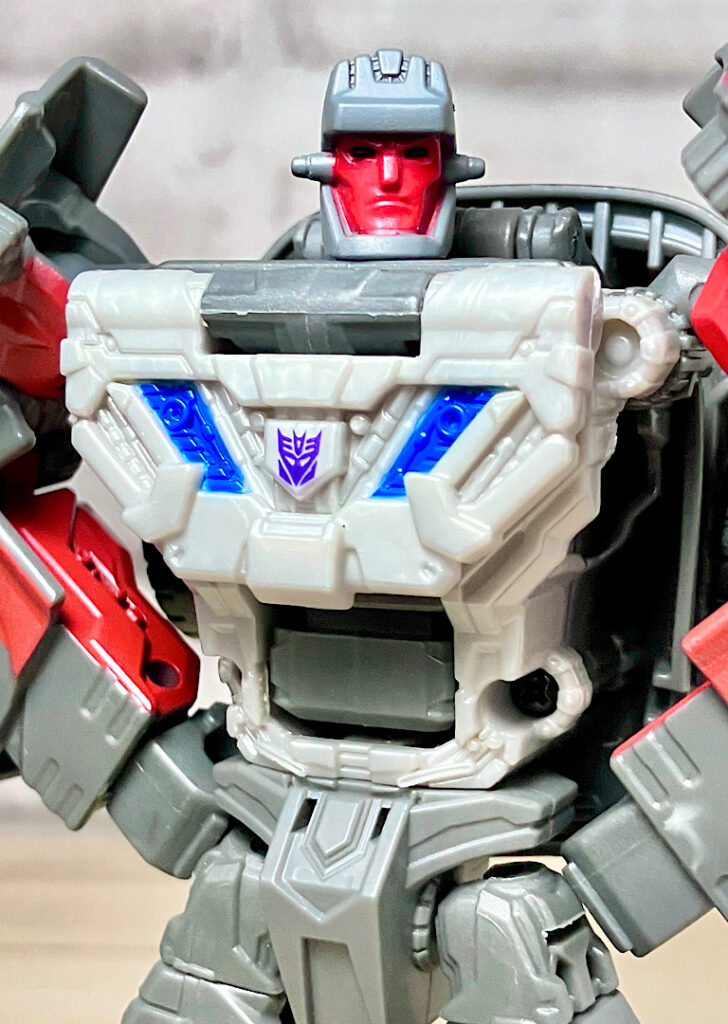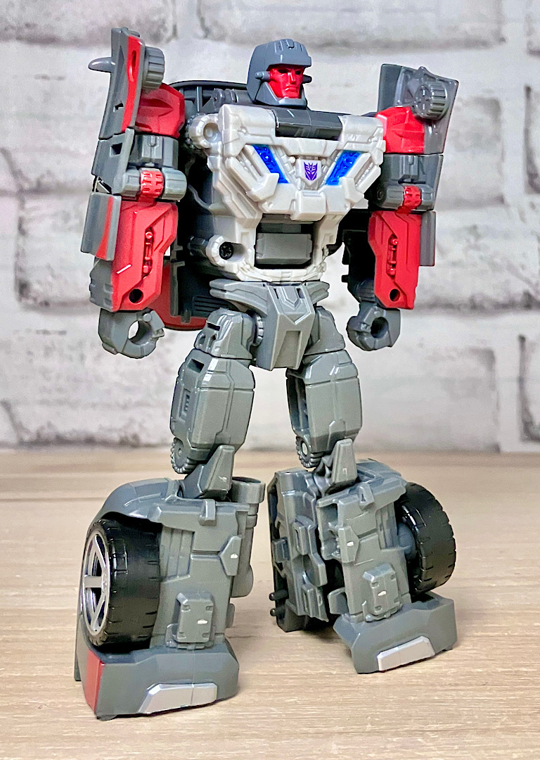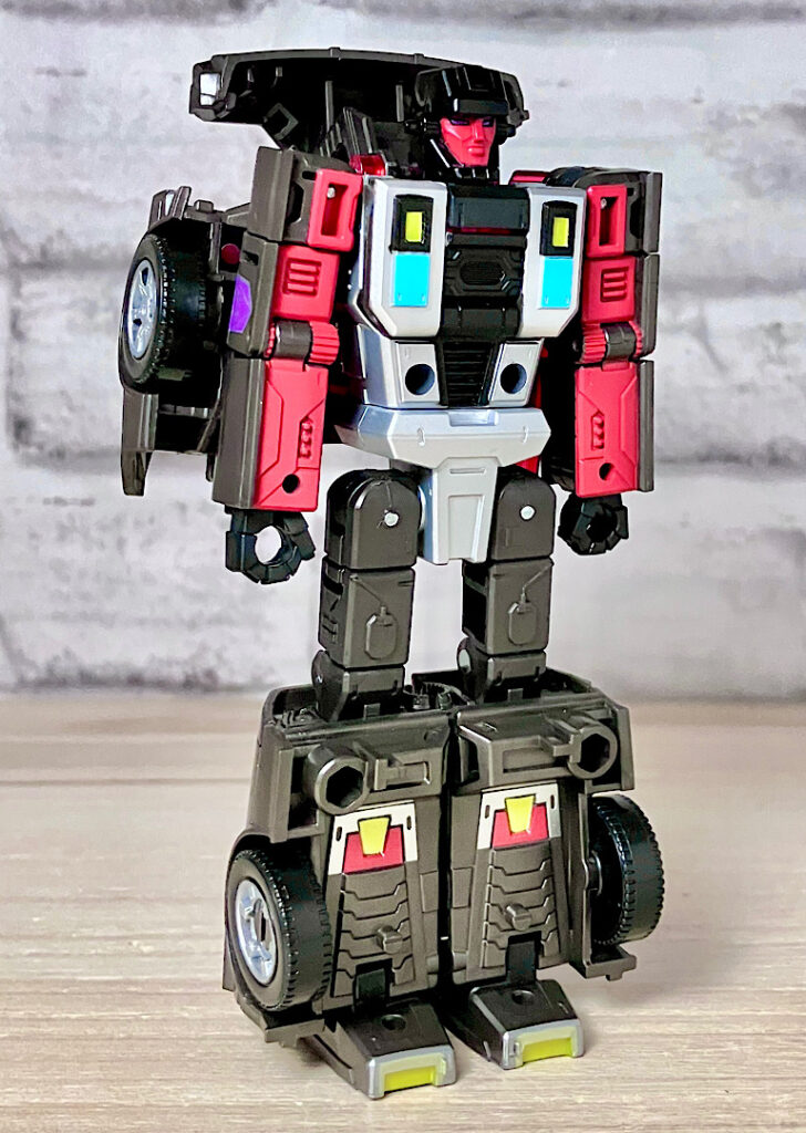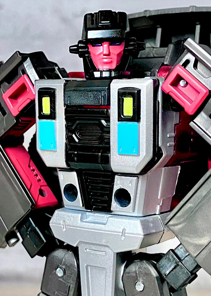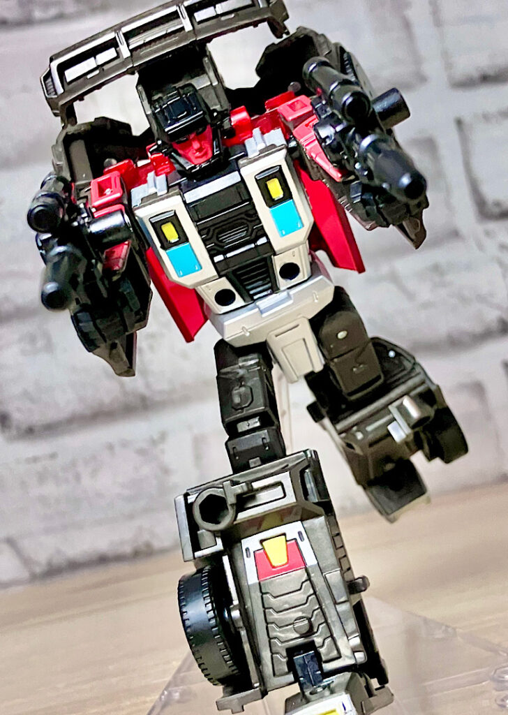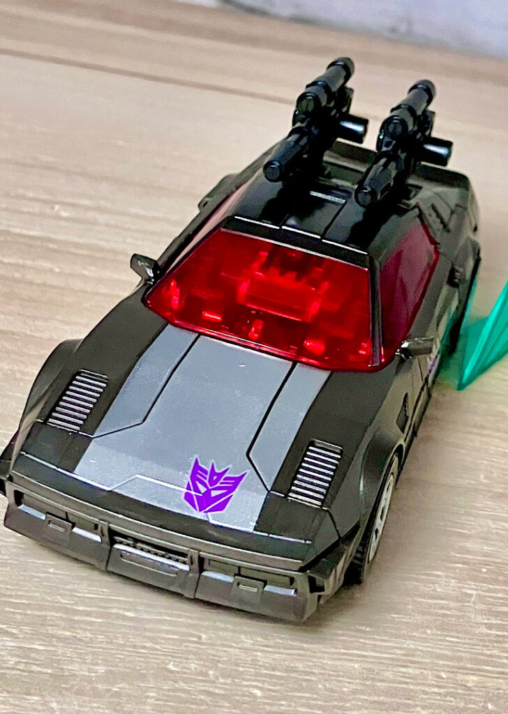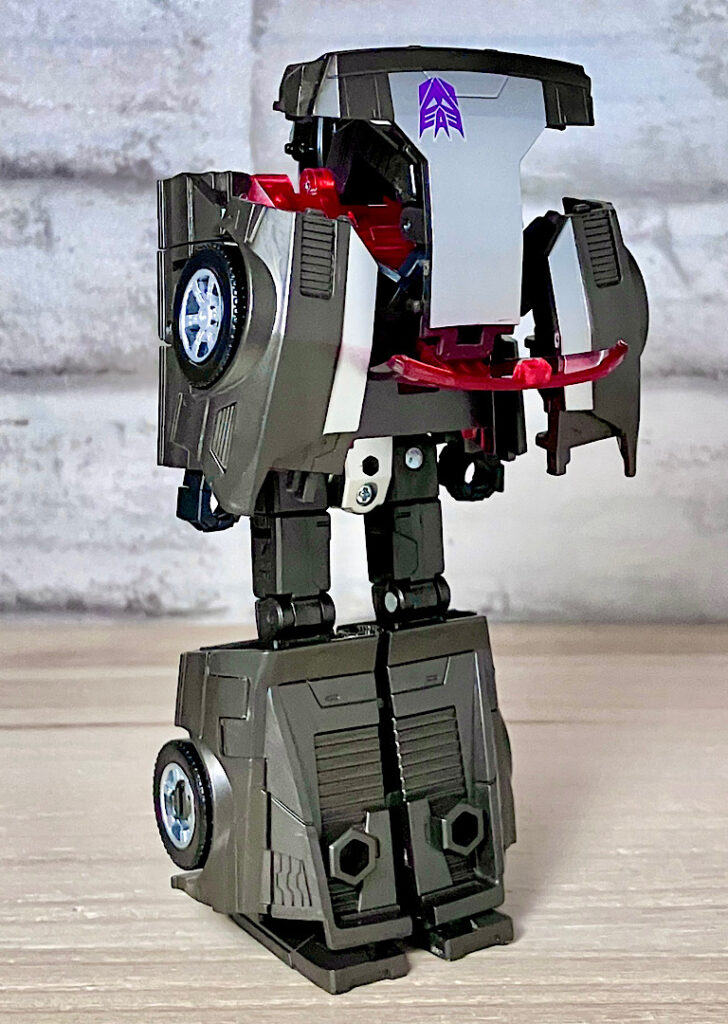 【ロボットモード】仲間のスタンティコンですら一緒に走りたくないほどの狂ったドライバー。レガシー単体版のリカラーアイテムで、全体的にブラック度合いがアップ。バックパックになっているボンネットが謎の分割をしているのが気になりますが、前から見た姿は概ねアニメやG1トイに準拠しています。