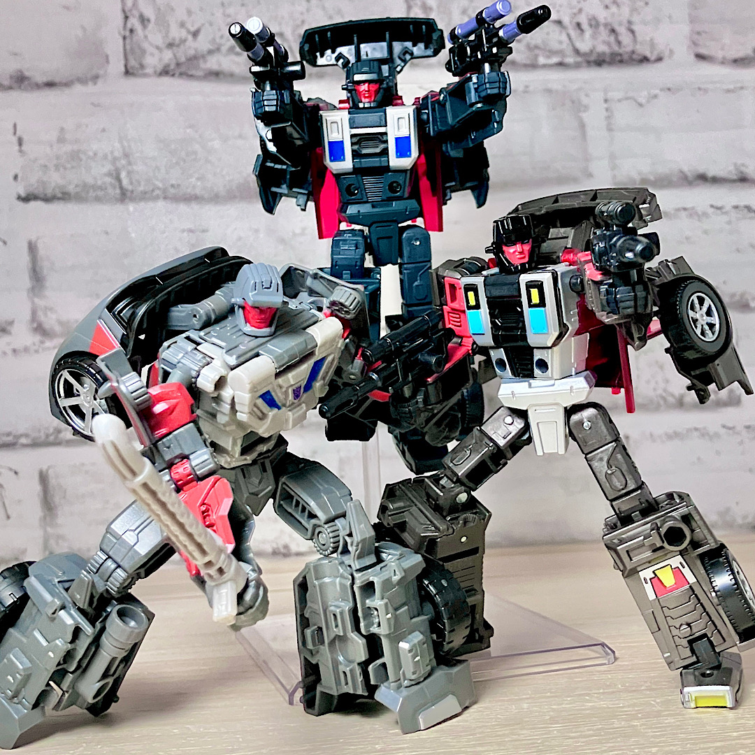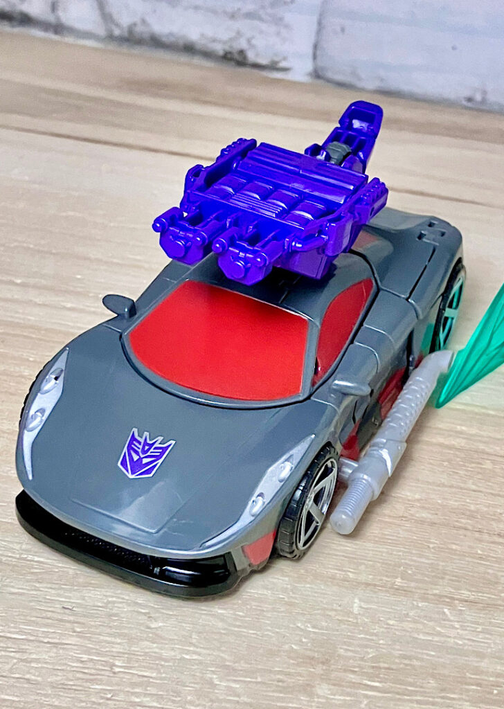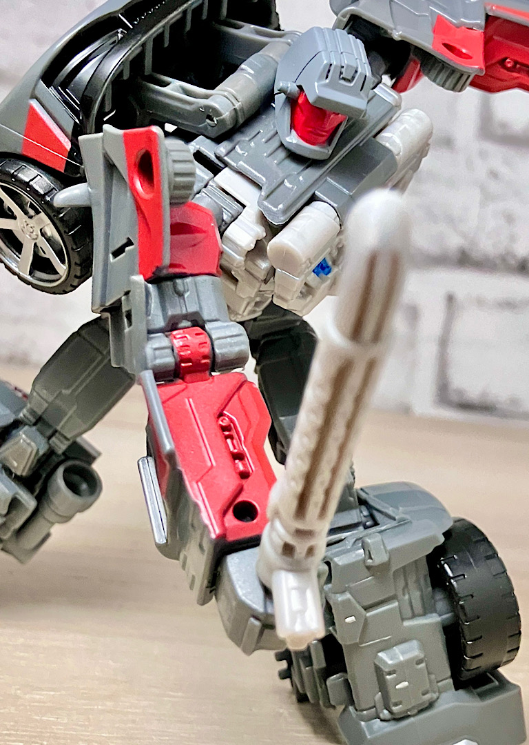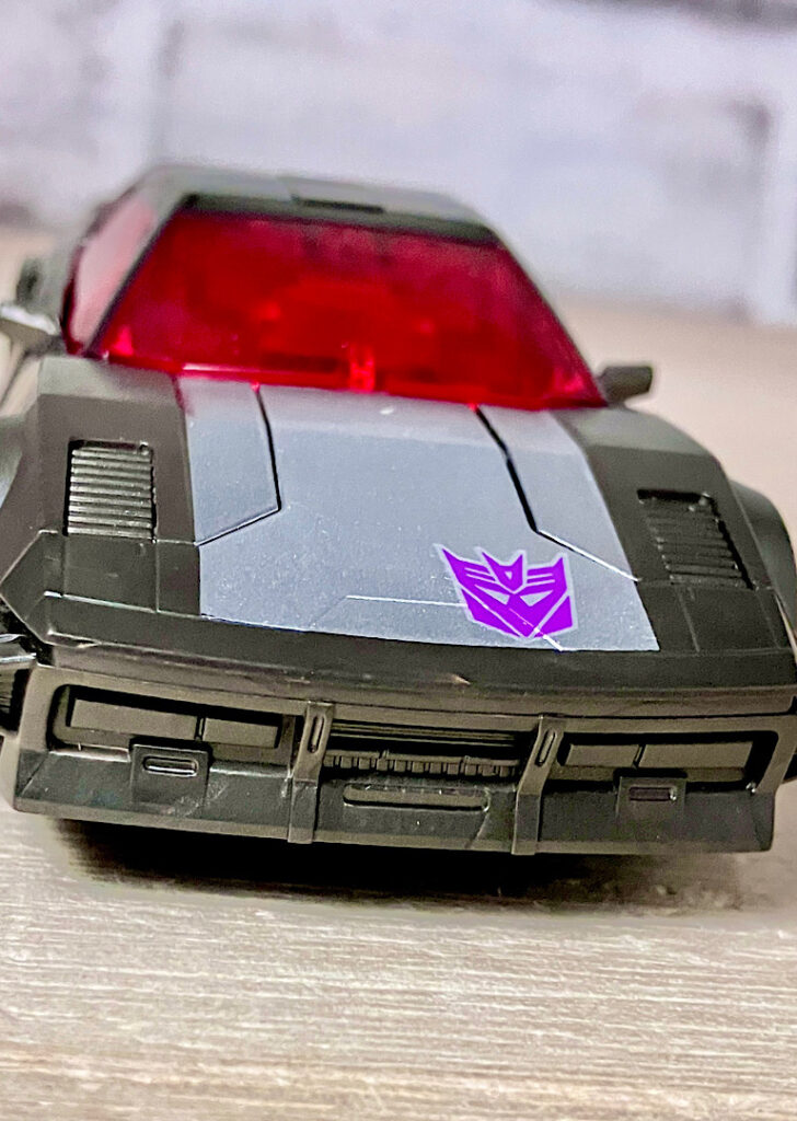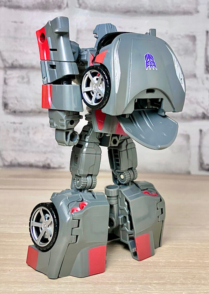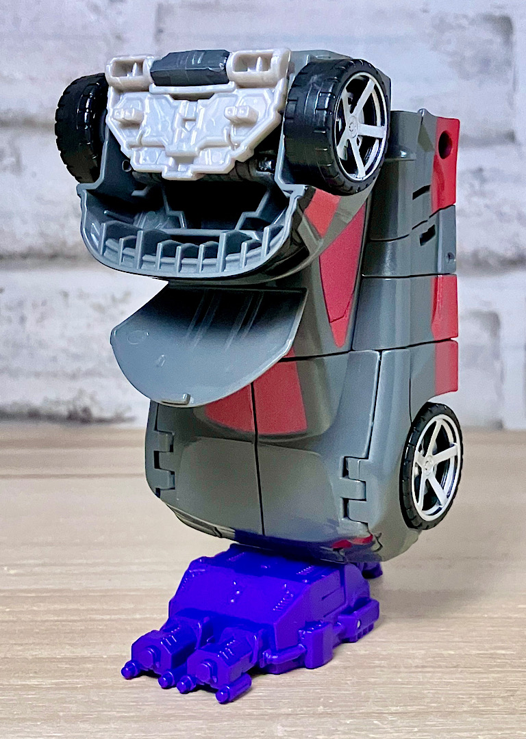 【ロボットモード】仲間のスタンティコンですら一緒に走りたくないほどの狂ったドライバー。レガシー単体版のリカラーアイテムで、全体的にブラック度合いがアップ。バックパックになっているボンネットが謎の分割をしているのが気になりますが、前から見た姿は概ねアニメやG1トイに準拠しています。