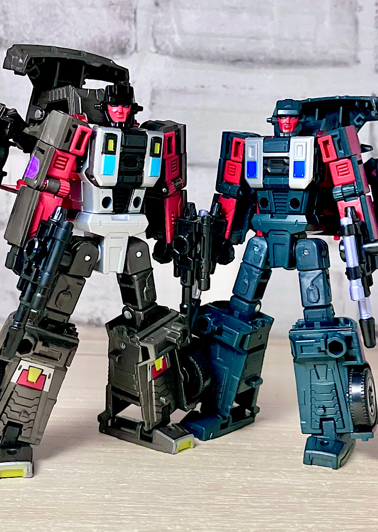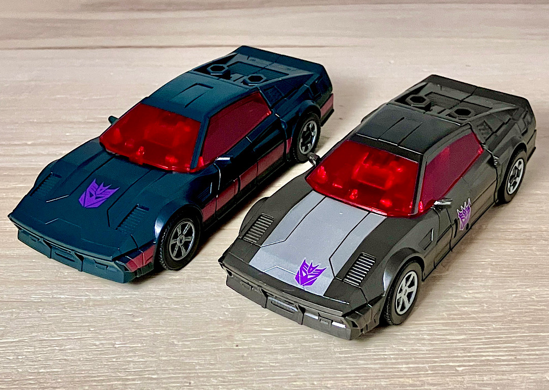単品版(右)との比較。単品版はやや緑がかったグレーで、セット版はほぼ真っ黒です。その他塗装パターンも変えられ、G1トイのシールを模した模様まで再現されてますね。