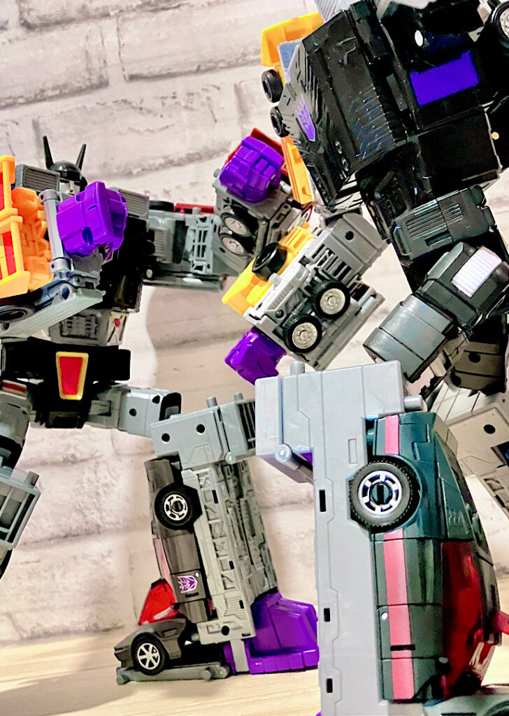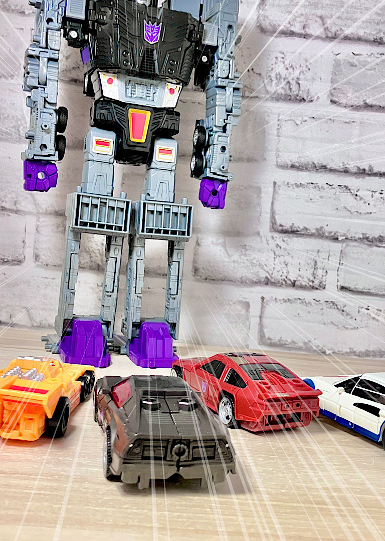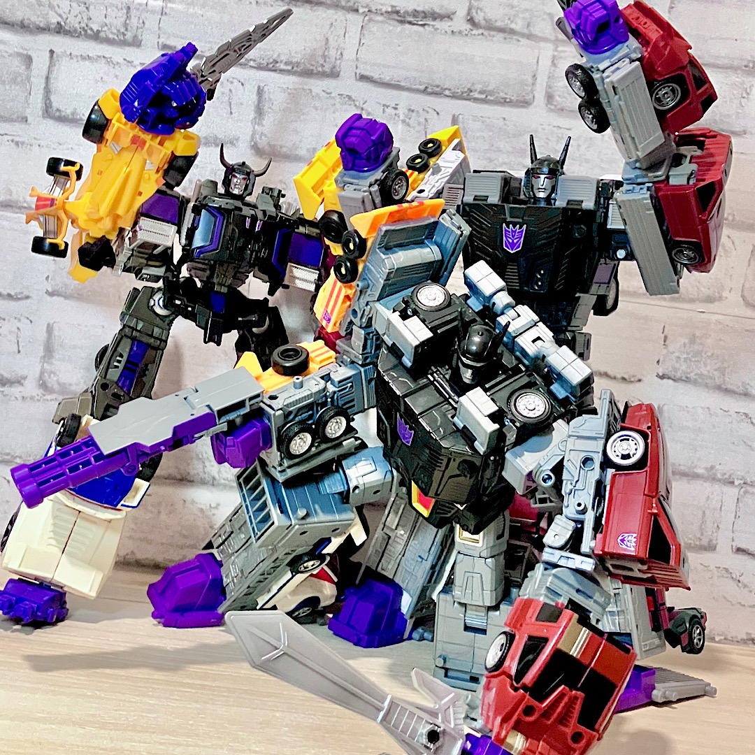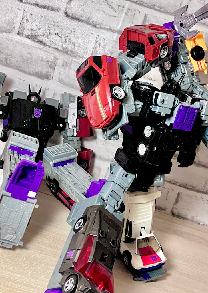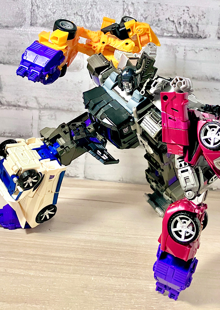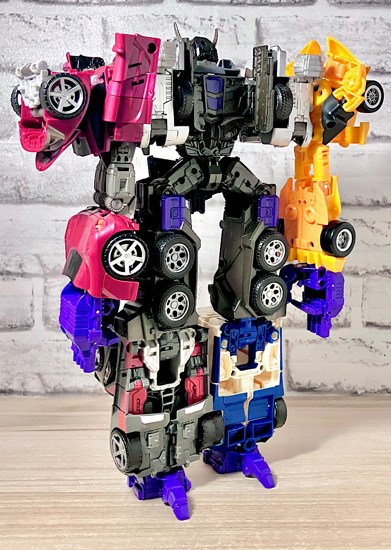 いきなり合体!UW/CWメナゾールは、5体のロボをそれぞれ合体モードに変形させ、モーターマスターの胴体に残り4体を手足として接続していくオーソドックスなTF5体合体スタイルです。
