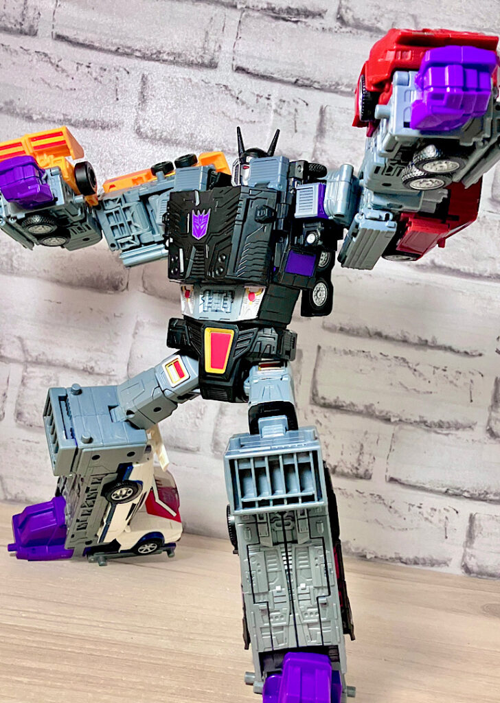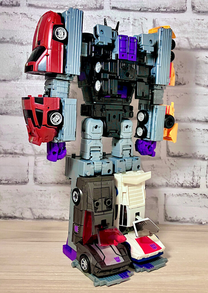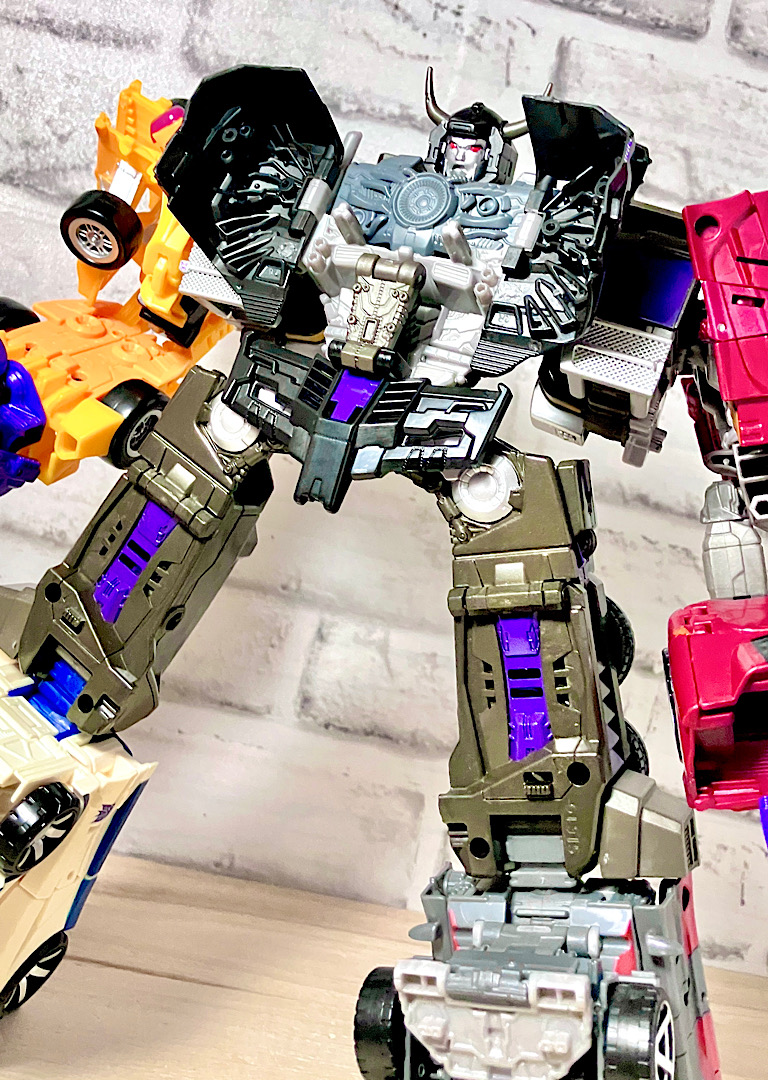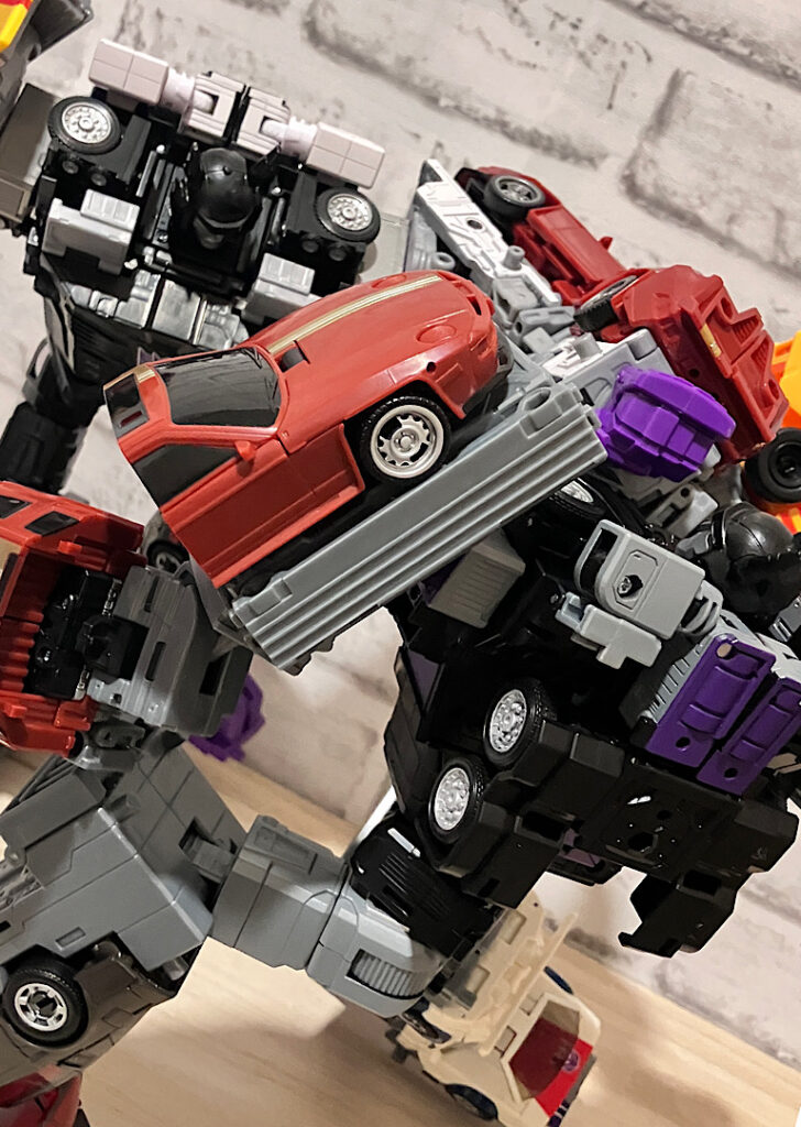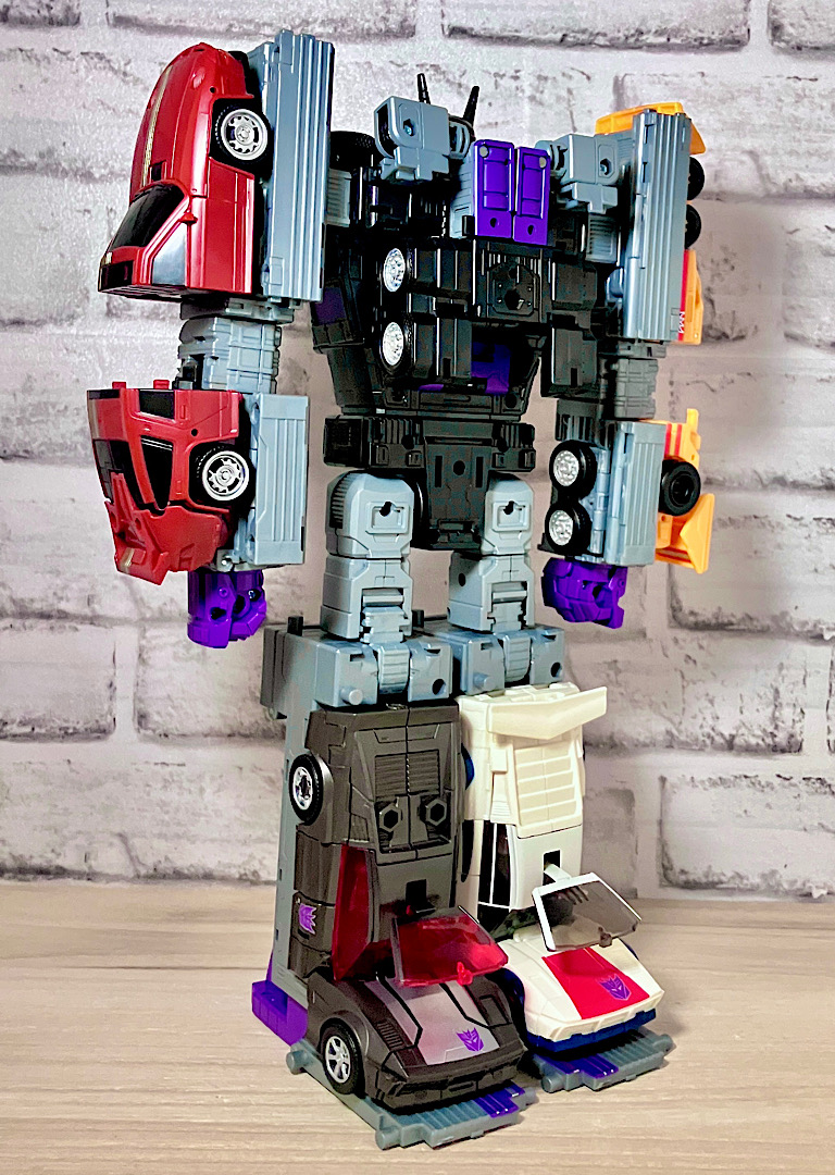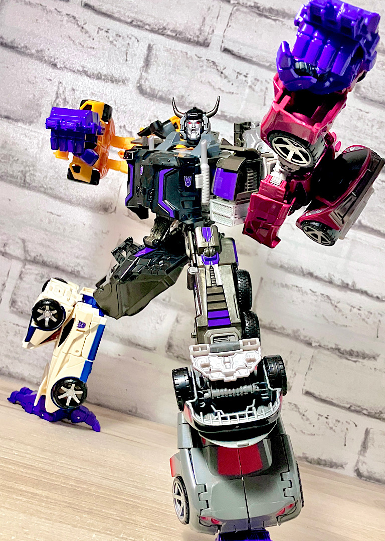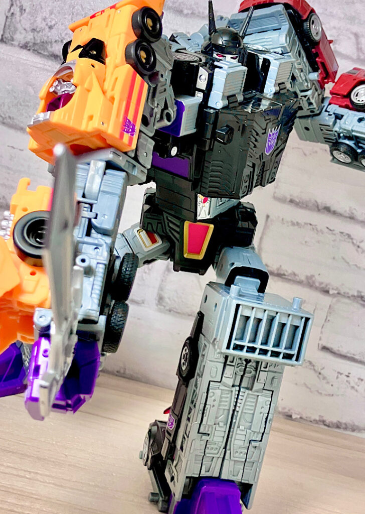 いきなり合体!UW/CWメナゾールは、5体のロボをそれぞれ合体モードに変形させ、モーターマスターの胴体に残り4体を手足として接続していくオーソドックスなTF5体合体スタイルです。