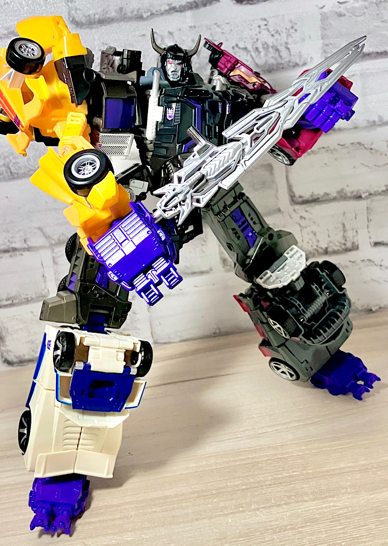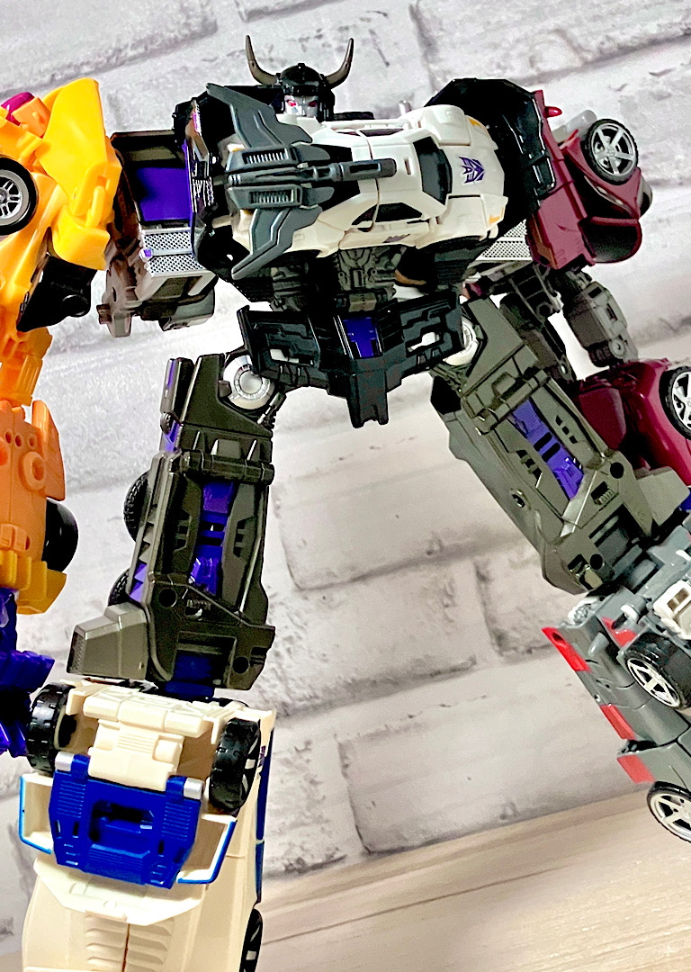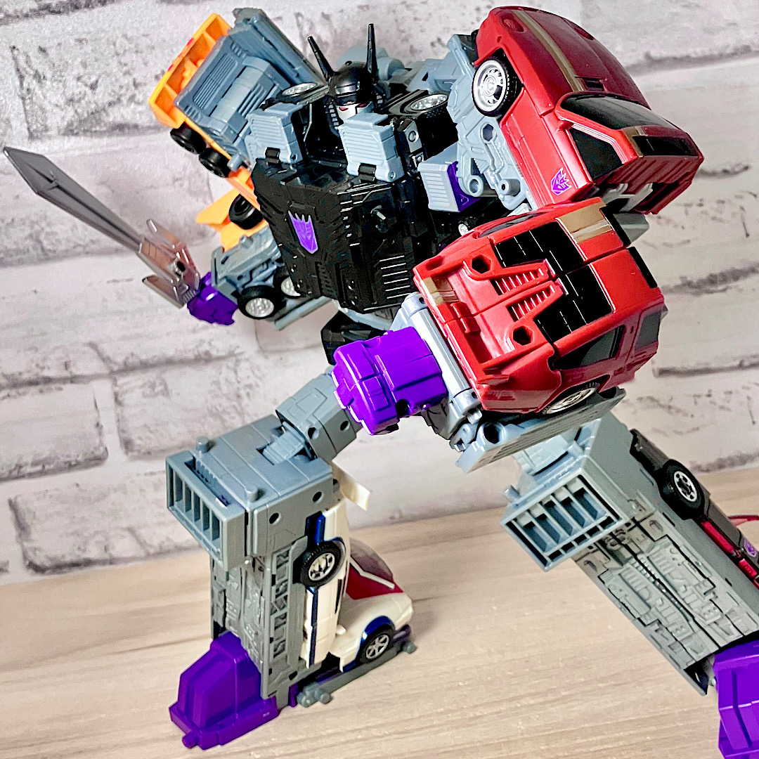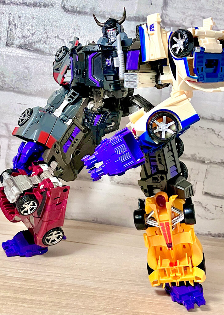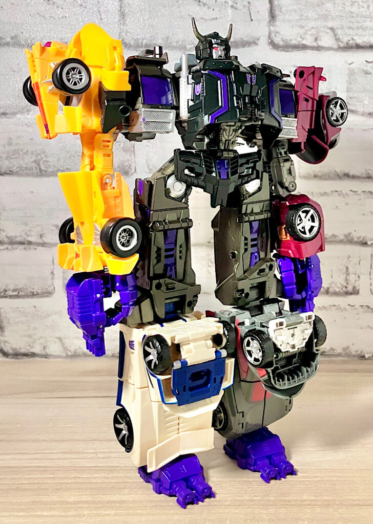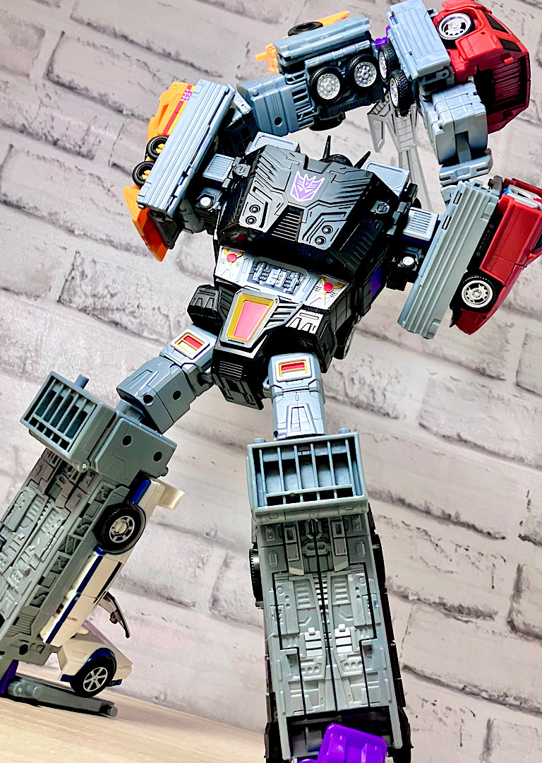 いきなり合体!UW/CWメナゾールは、5体のロボをそれぞれ合体モードに変形させ、モーターマスターの胴体に残り4体を手足として接続していくオーソドックスなTF5体合体スタイルです。
