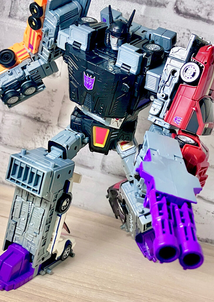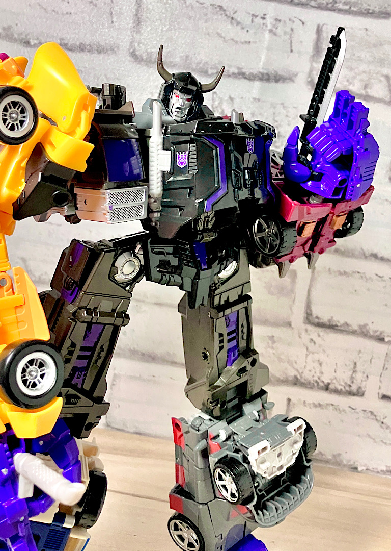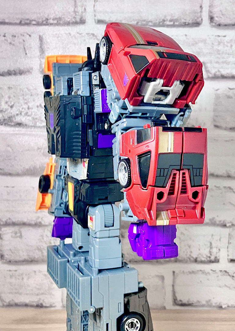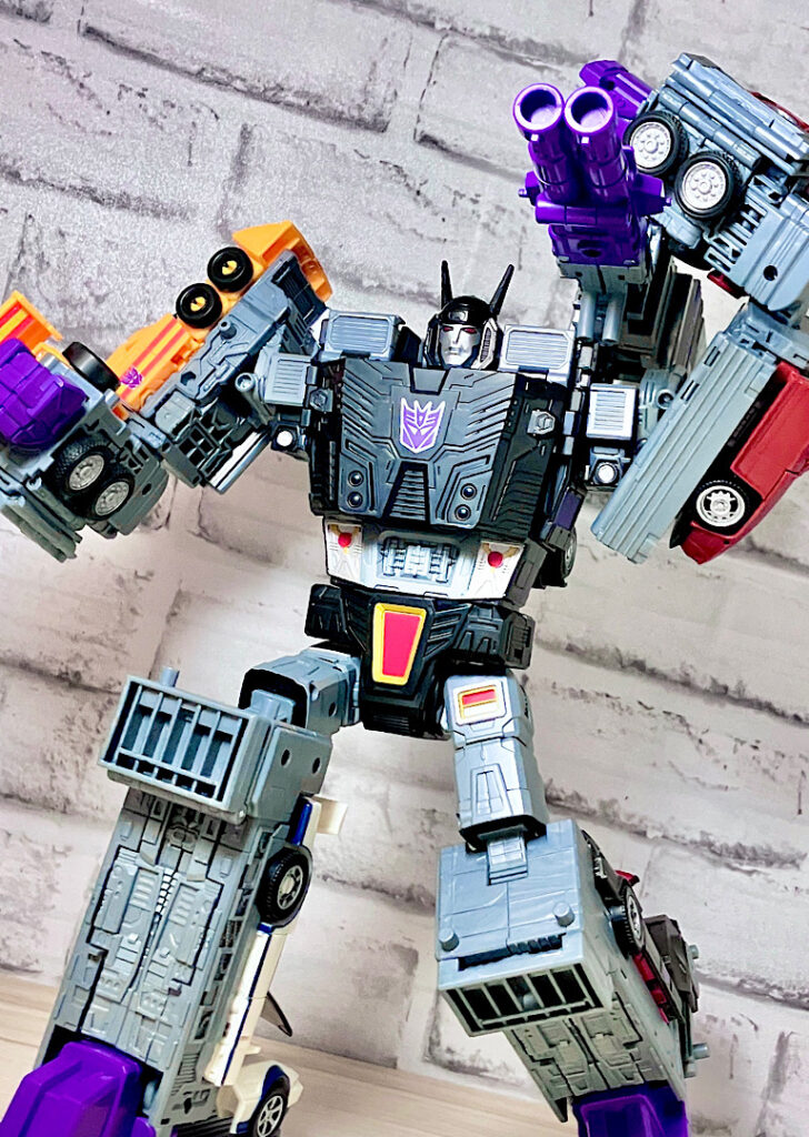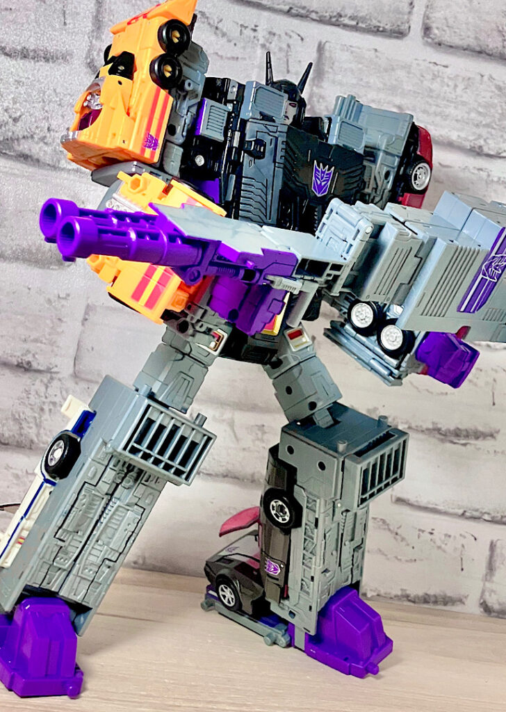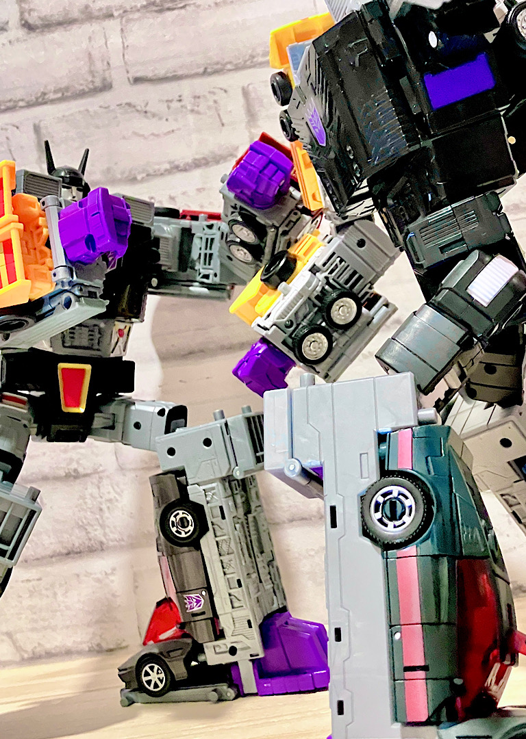 いきなり合体!UW/CWメナゾールは、5体のロボをそれぞれ合体モードに変形させ、モーターマスターの胴体に残り4体を手足として接続していくオーソドックスなTF5体合体スタイルです。