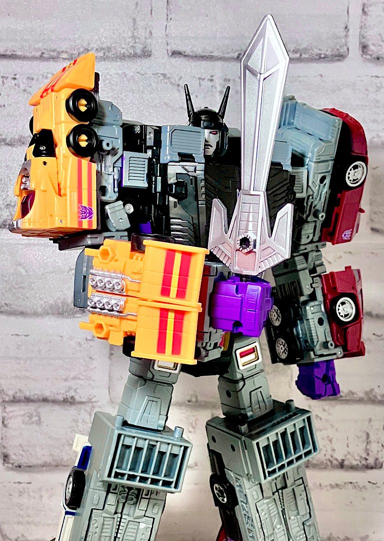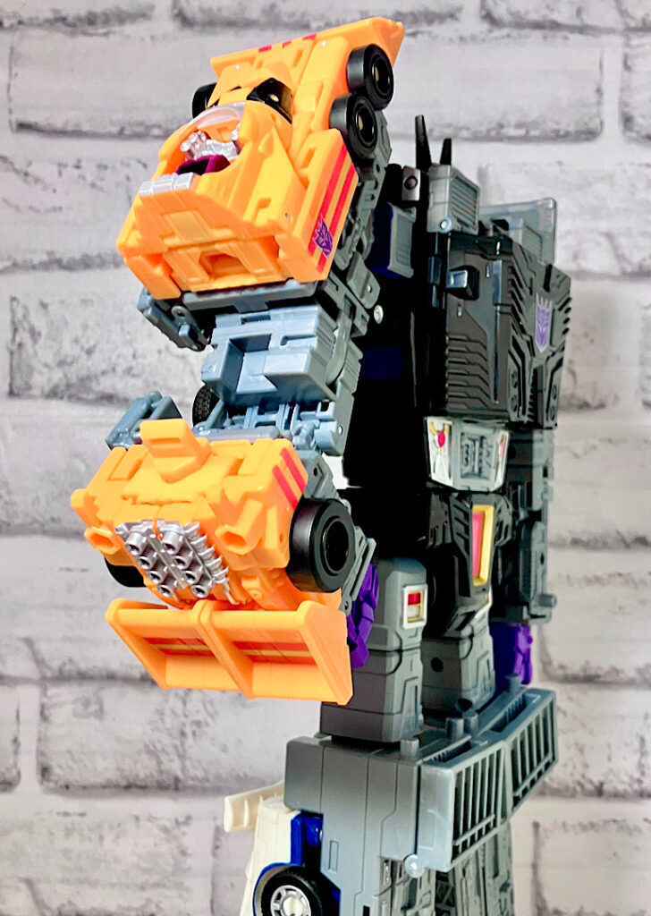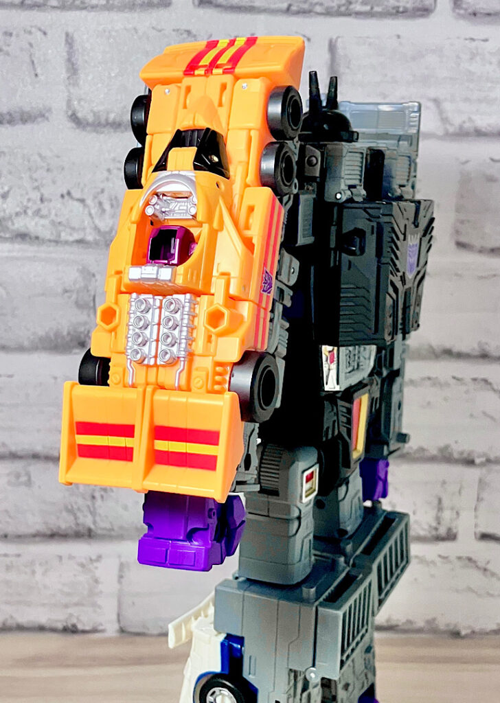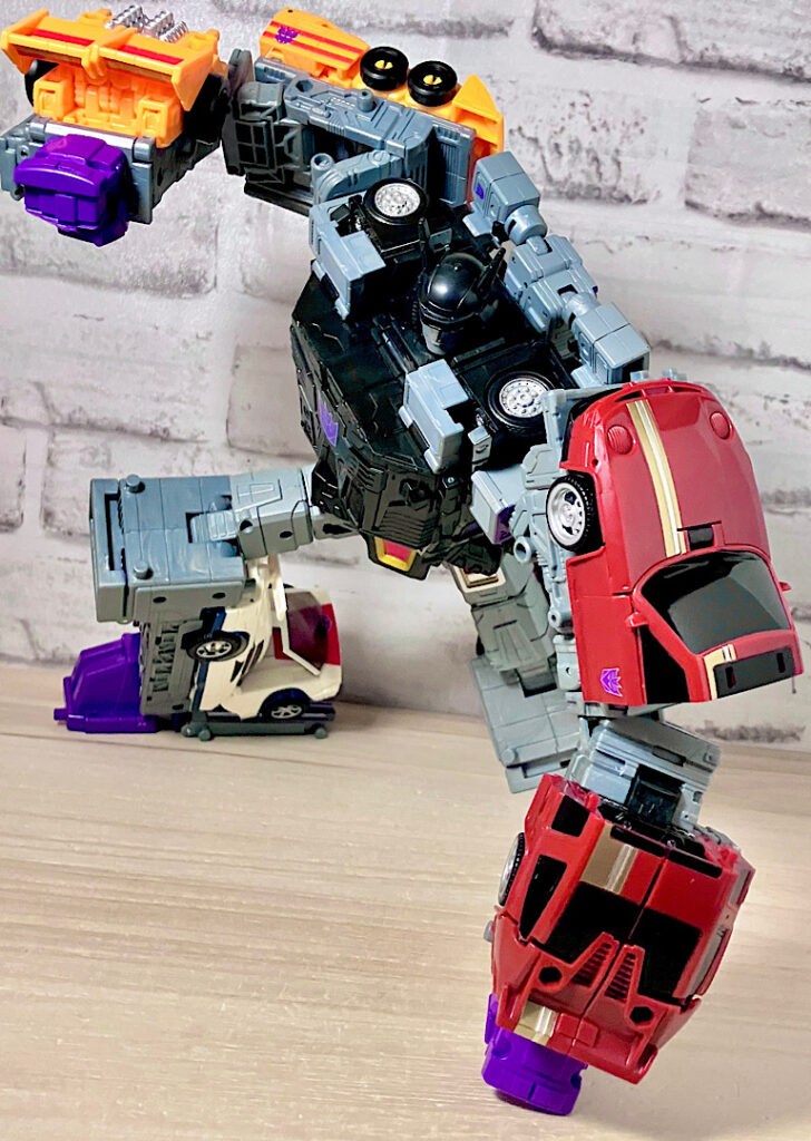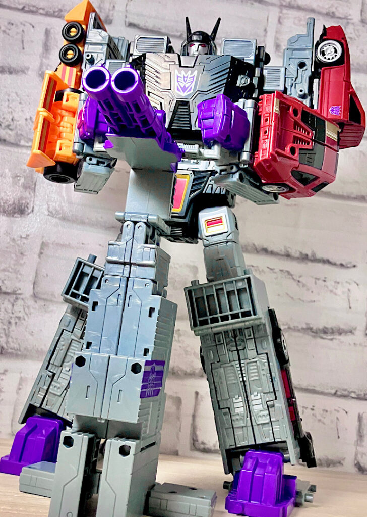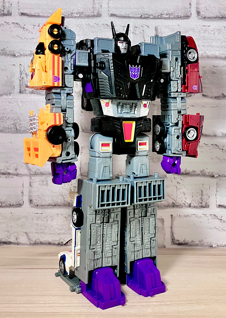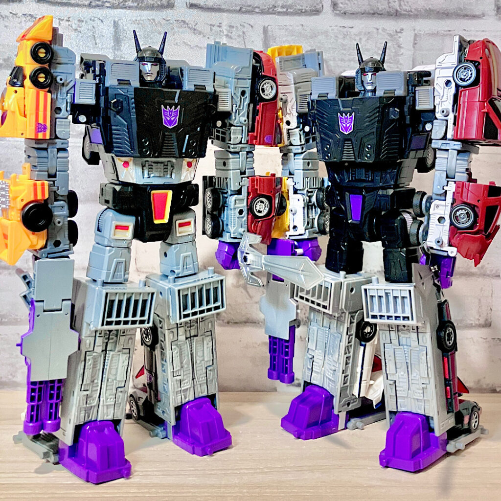いきなり合体!UW/CWメナゾールは、5体のロボをそれぞれ合体モードに変形させ、モーターマスターの胴体に残り4体を手足として接続していくオーソドックスなTF5体合体スタイルです。