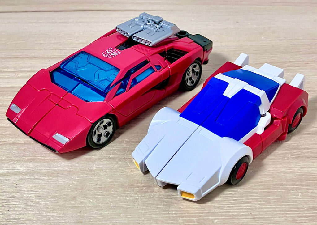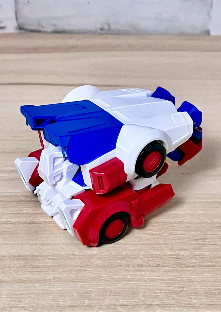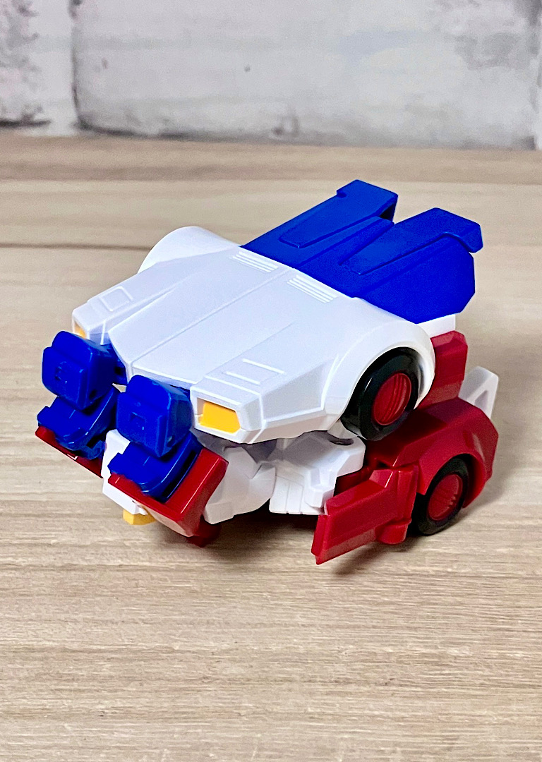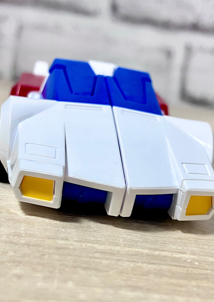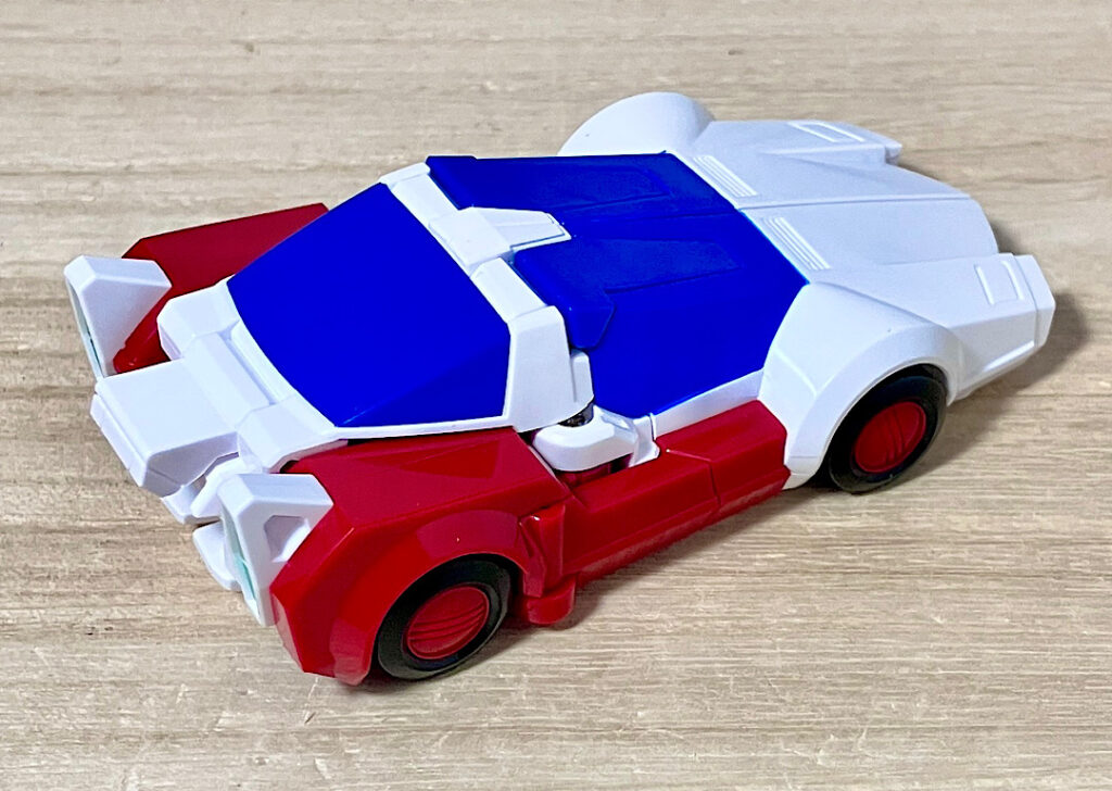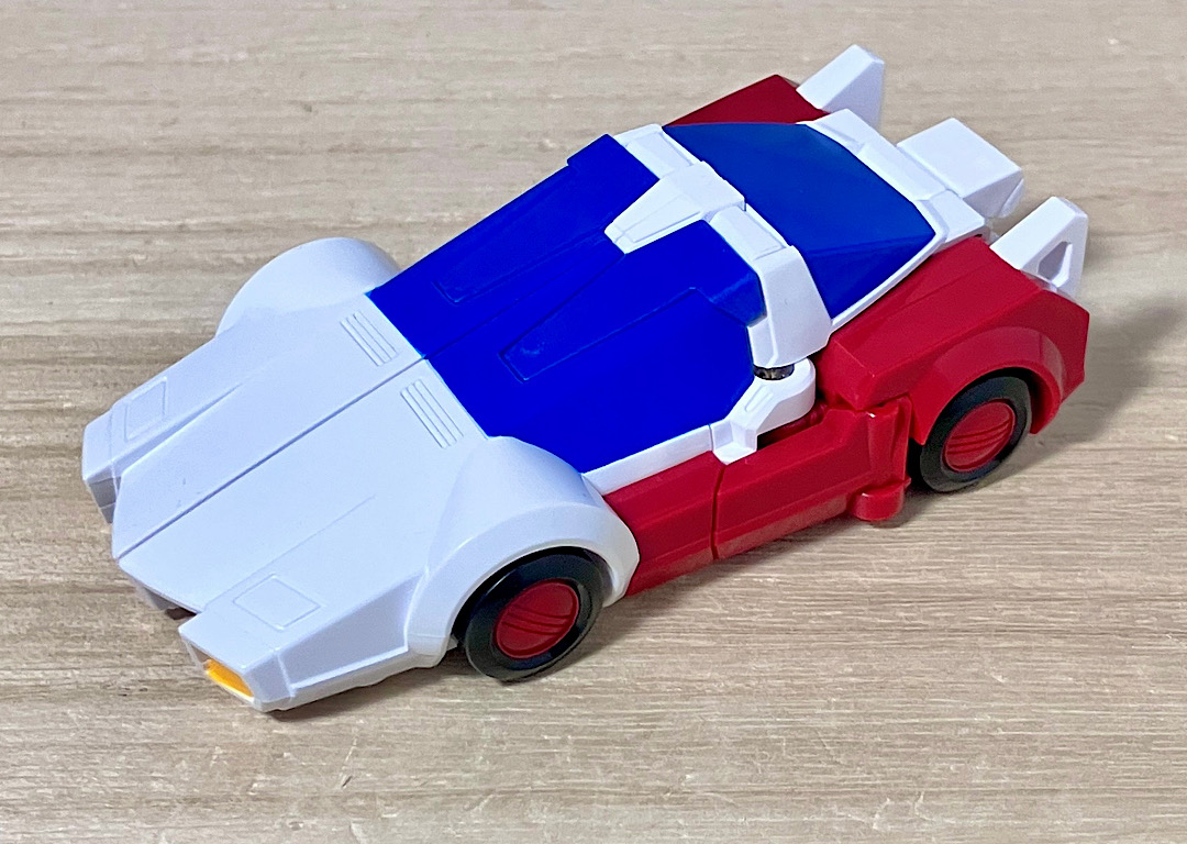 【ビークルモード】まずは「中のロボ」であるエクスカイザーを見てみましょう。ビークルモードはSFスーパーカーで、対象年齢層を感じるシンプルなシルエット。配色も王道の白×赤青黄トリコロールカラーです。