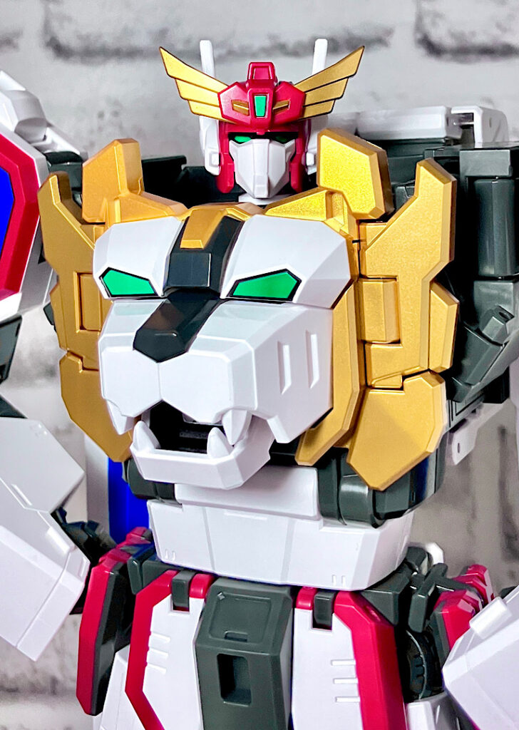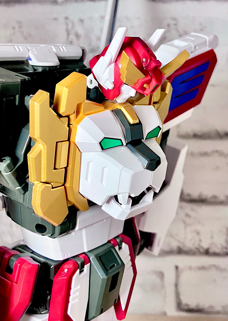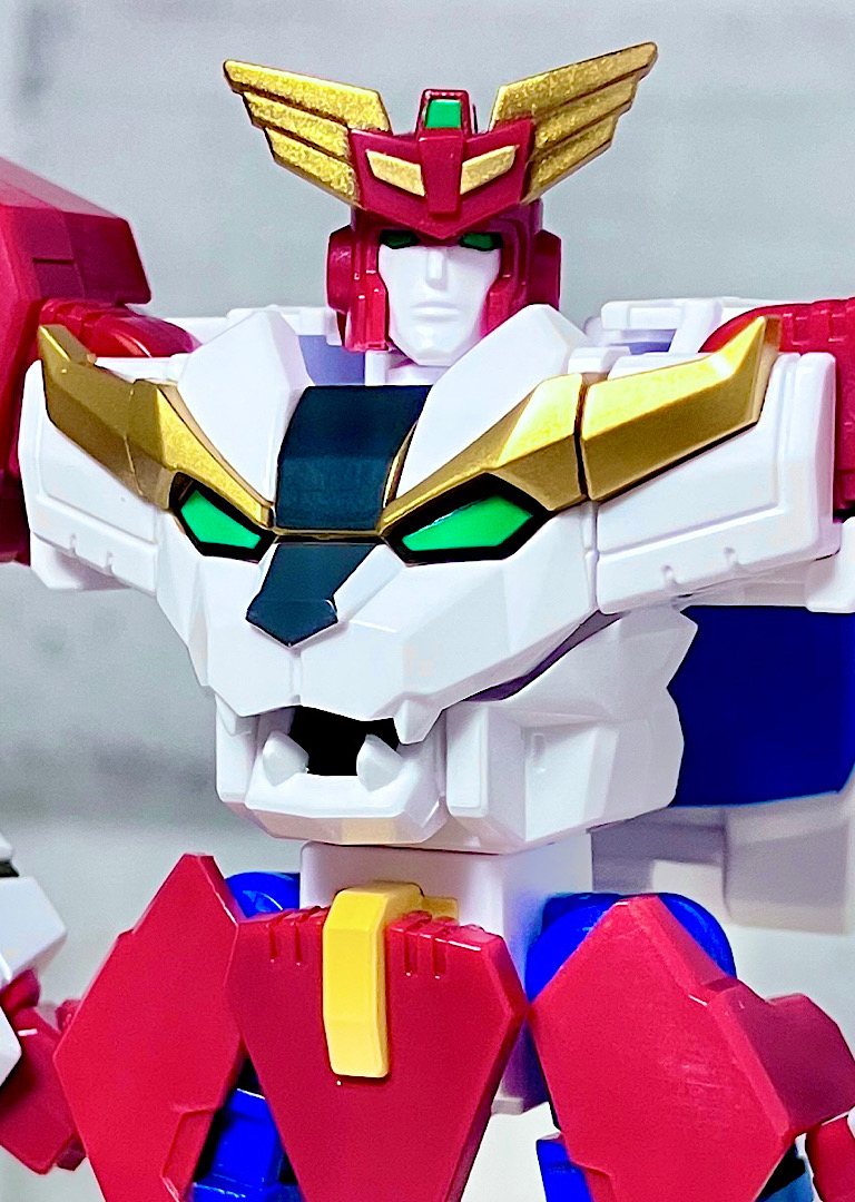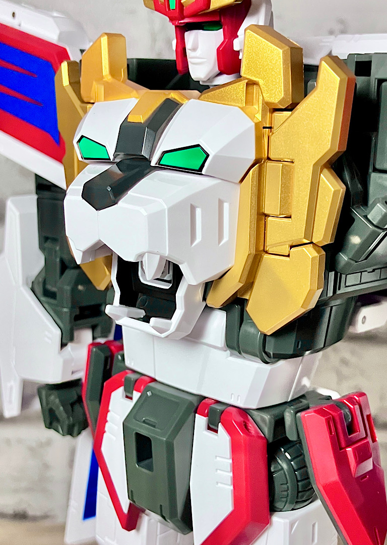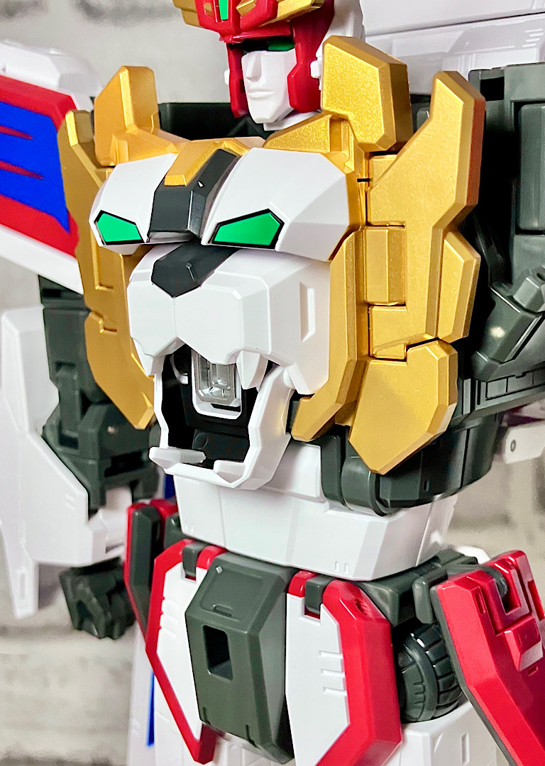 【アップ】頭部造形も塗り分けもバッチリでイケメン。胸のライオンは、当時品の反転ギミック(顔の有り・無しを選べる)をオミットすることで自然な仕上がりになっています。