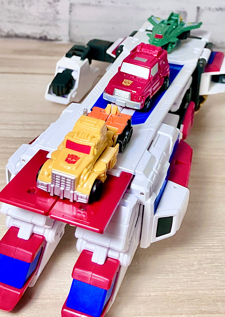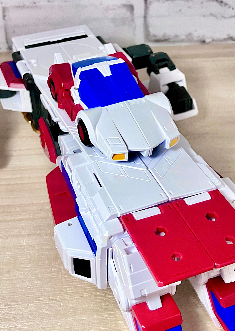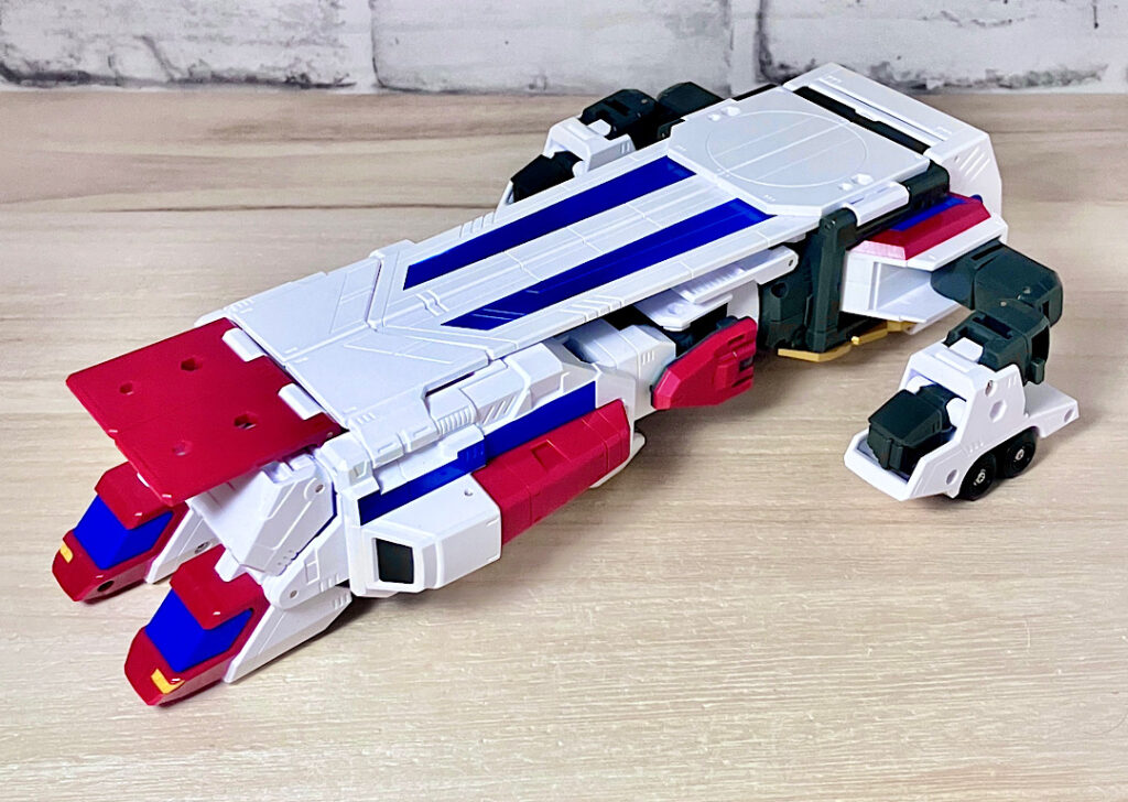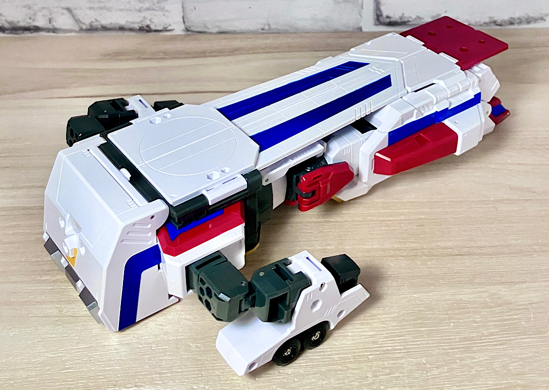 【ビークルモード】これはSFトレーラーみたいな感じでしょうか。エクスカイザーの支援メカです。ビークルありきではなく、ロボットから変形できる形状という流れで設定されたであろう見立てデザインですね。この辺はTFとの如実な違いを見てとれます。