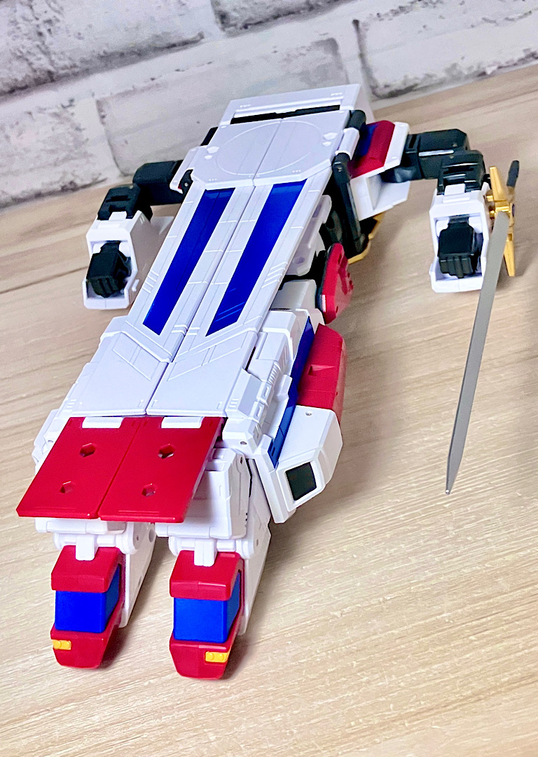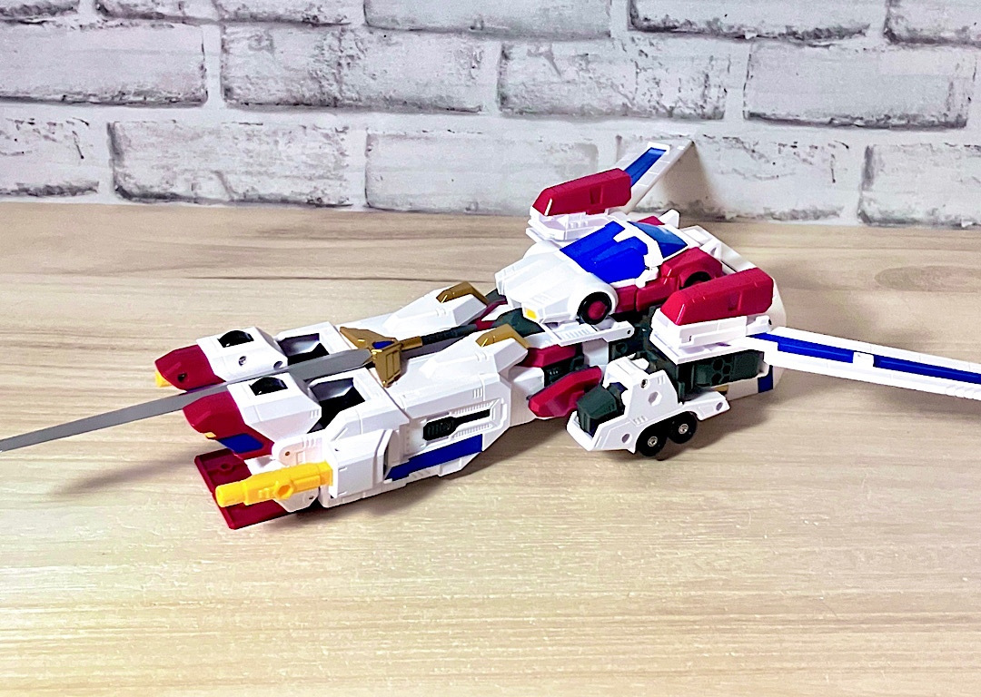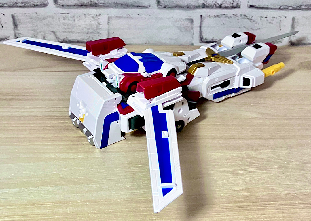 【ジェットモード】こちらは今回あらためて設定されたジェットモード。ウイングを広げるなどして変形させたキングローダーに、ビークル状態のエクスカイザーをドッキングさせます。機首は剣による見立て。