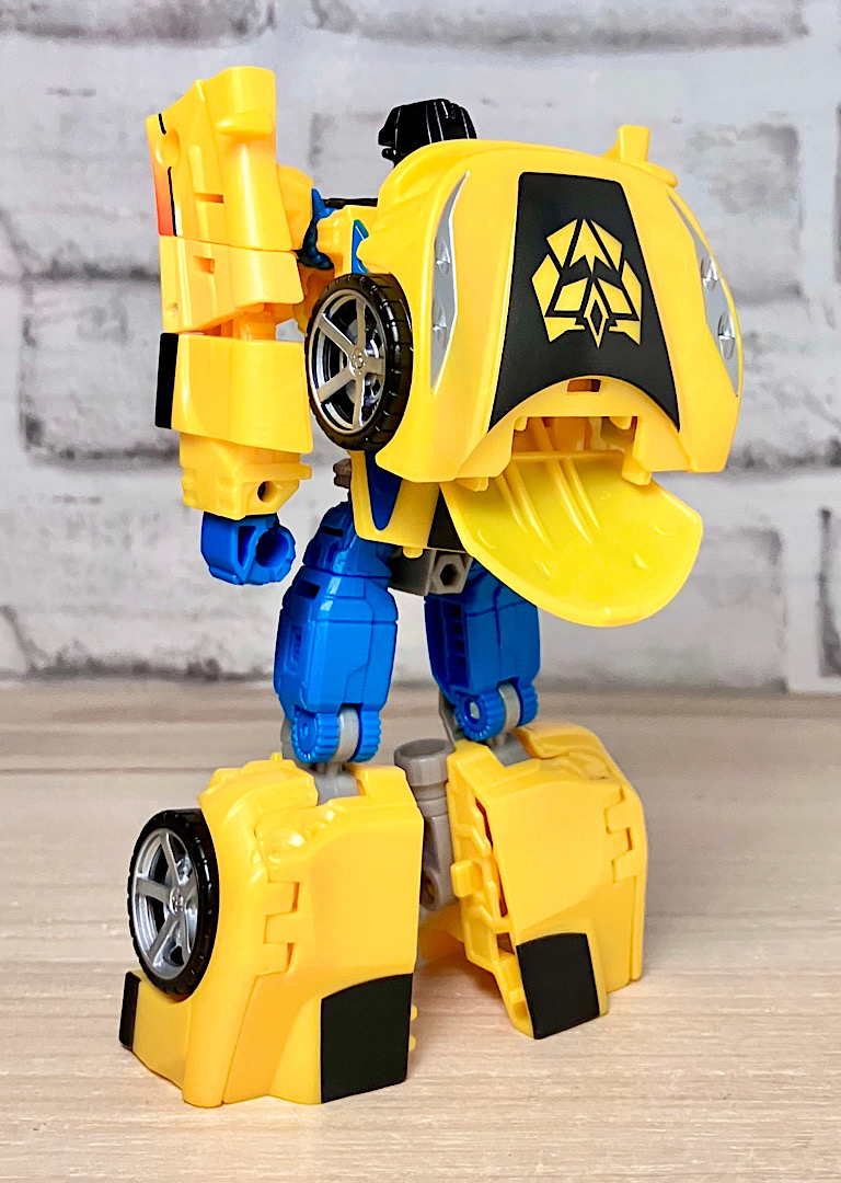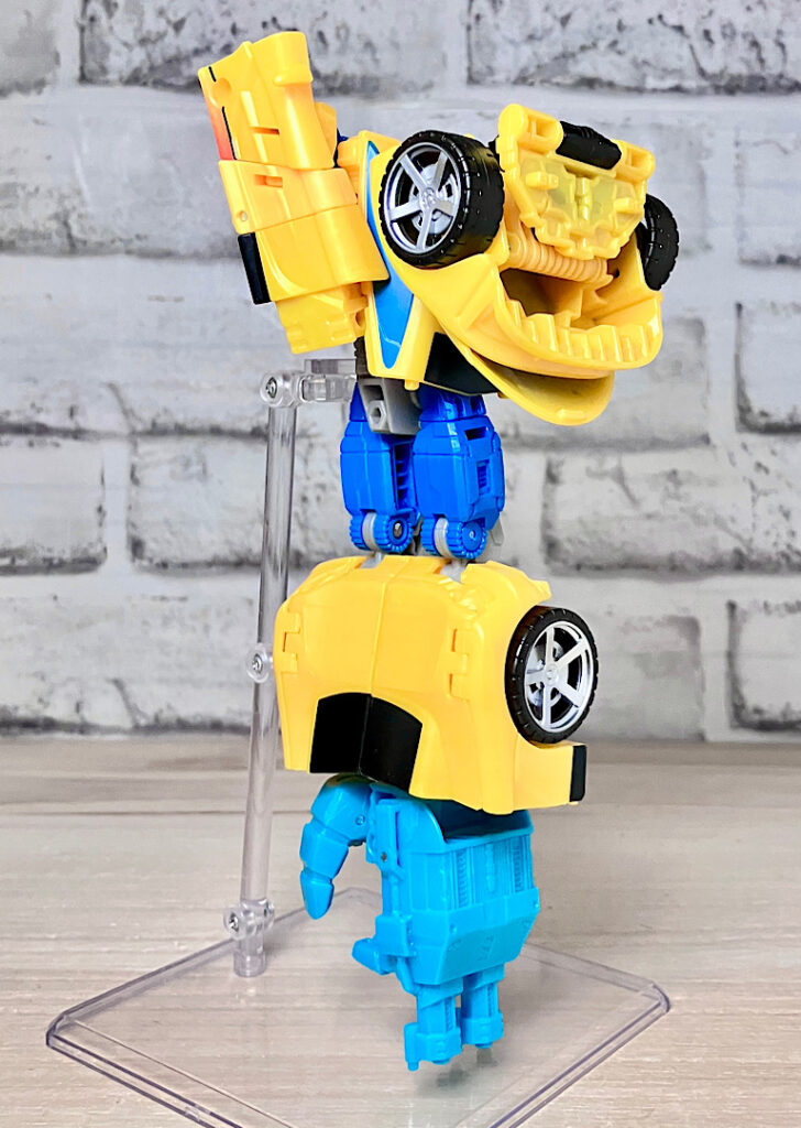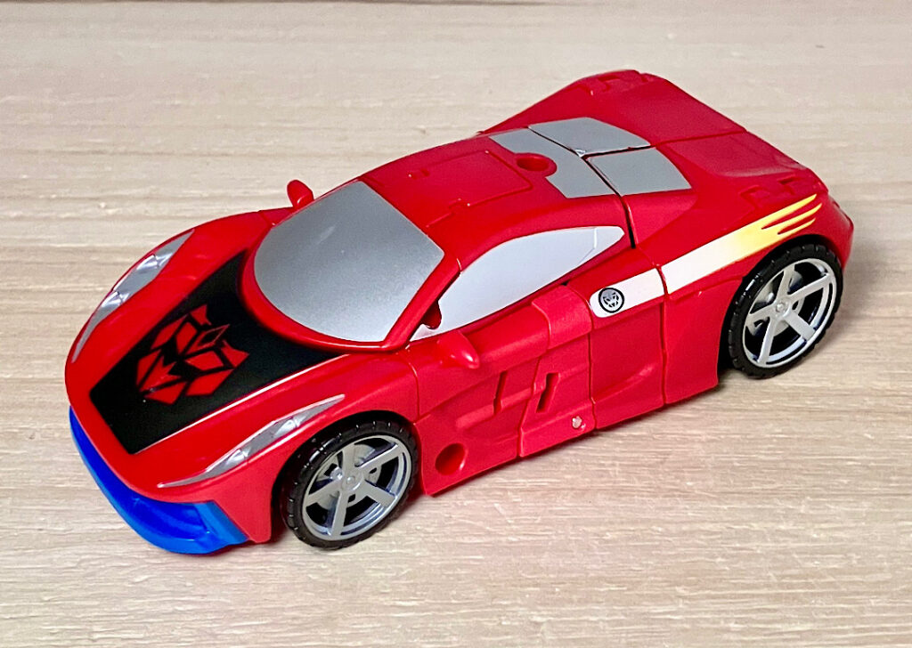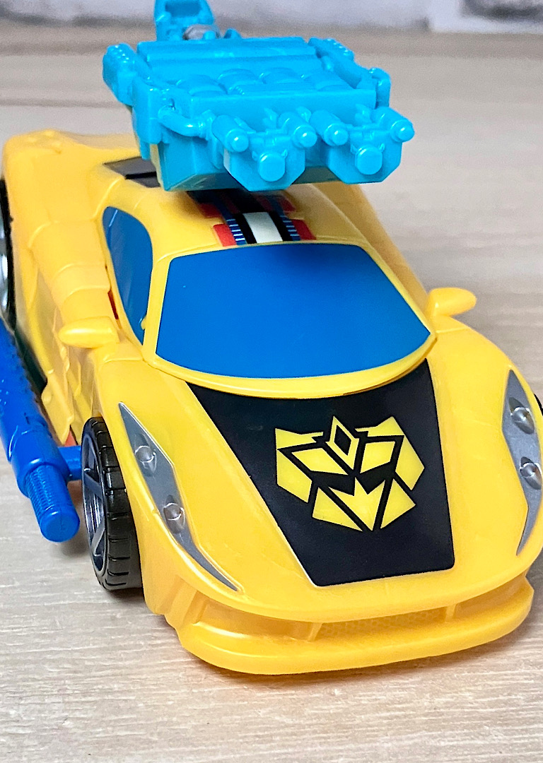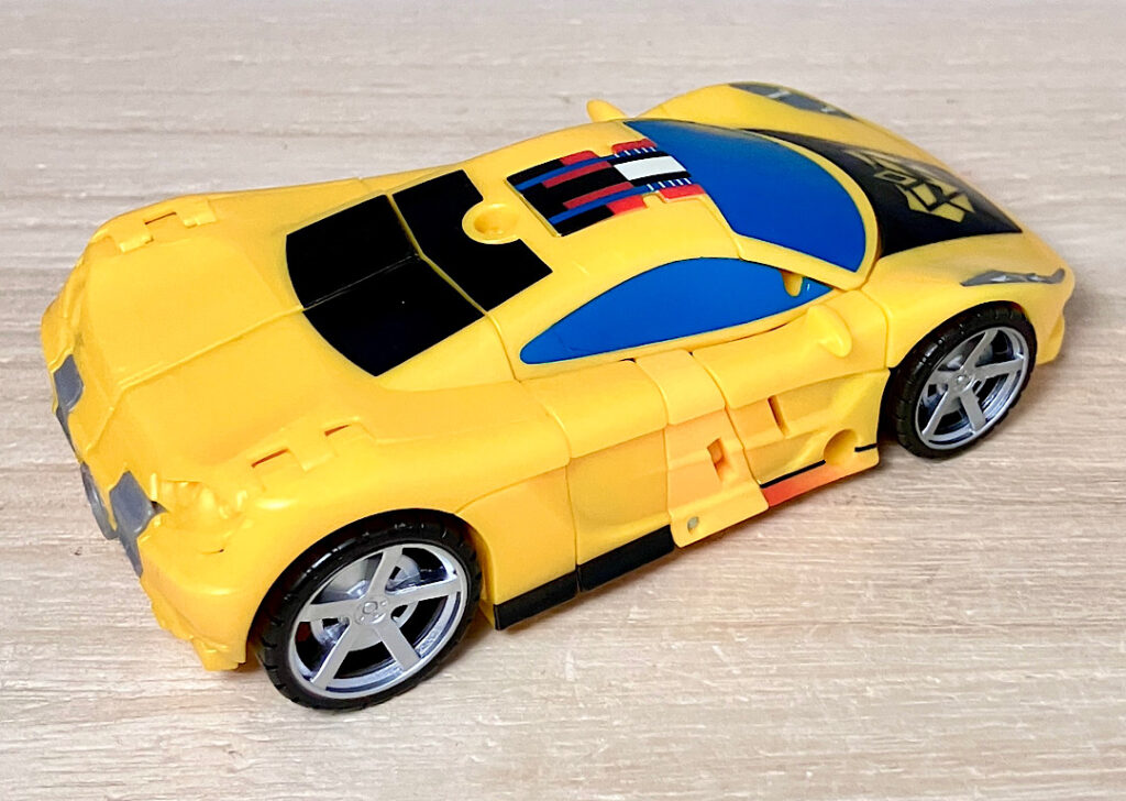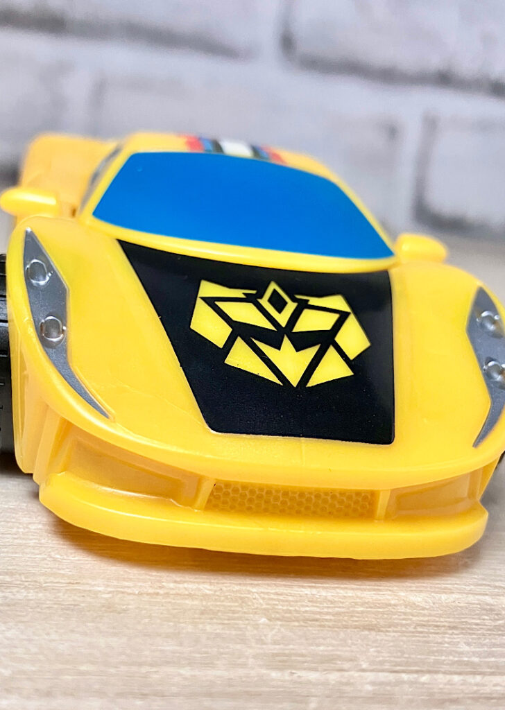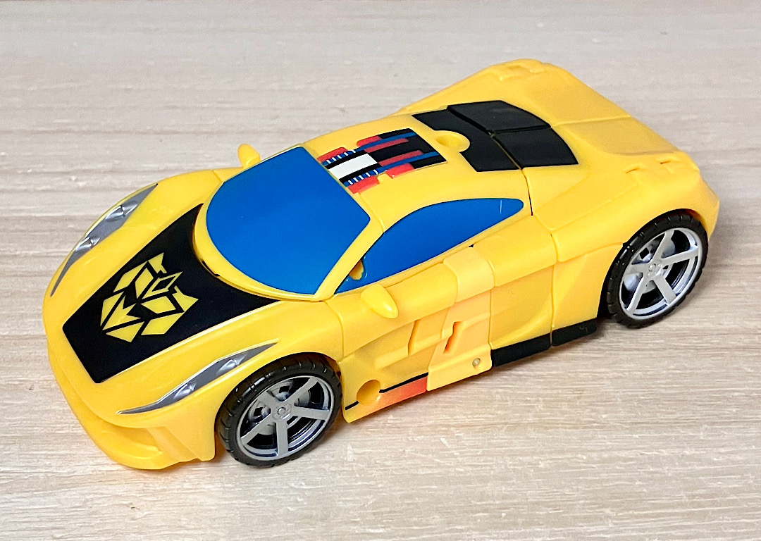 【ビークルモード】これまた目にも鮮やかな黄色のスポーツカー。ボンネットにデカデカとプリントされたエンブレムがいいですね。