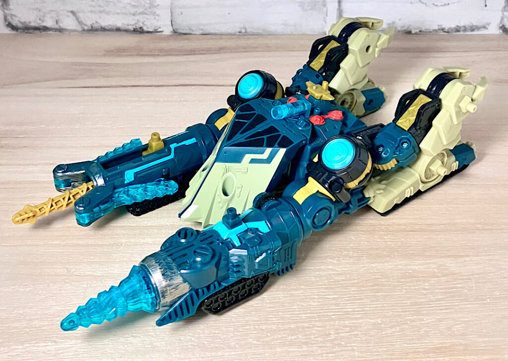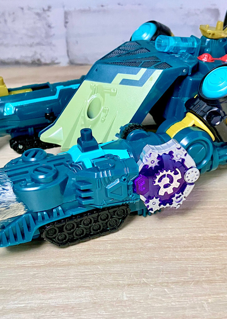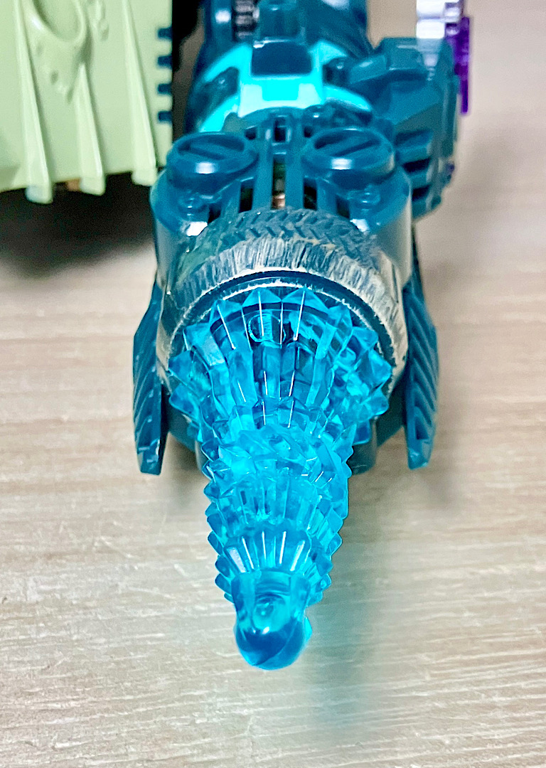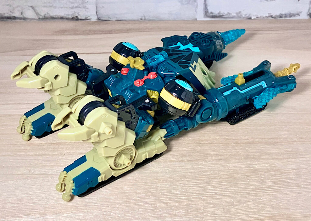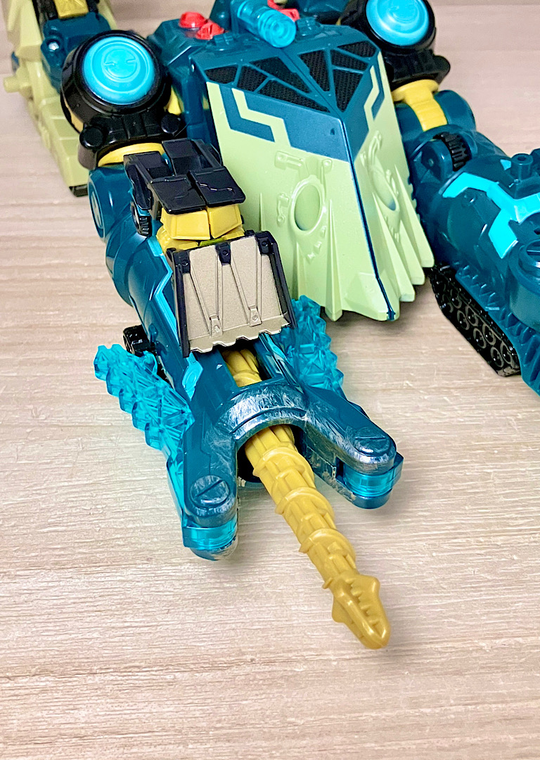 【ビークルモード】ビークルからいきましょう。他のギガンティオンTFと同じように、SF掘削マシーンに変形。中央の巨大なブレードと2つのドリルというケレン味たっぷりのデザインが最高です。ここまで「ドリル」に真っ向から向き合ったTFというのも珍しいのではないでしょうかw