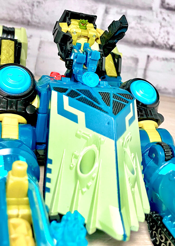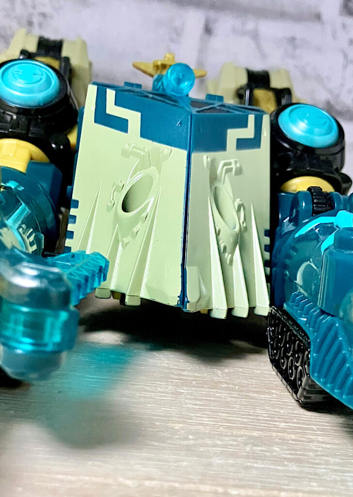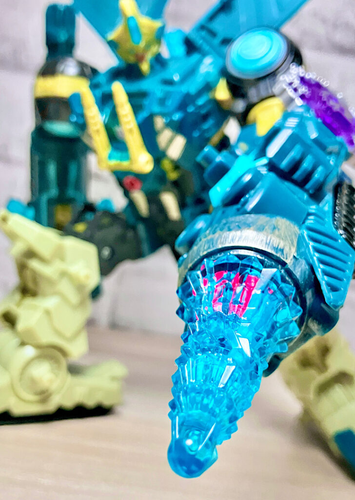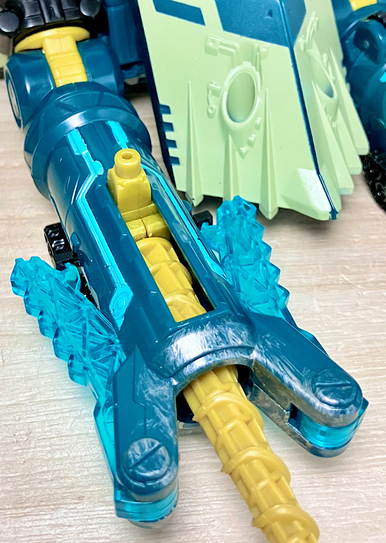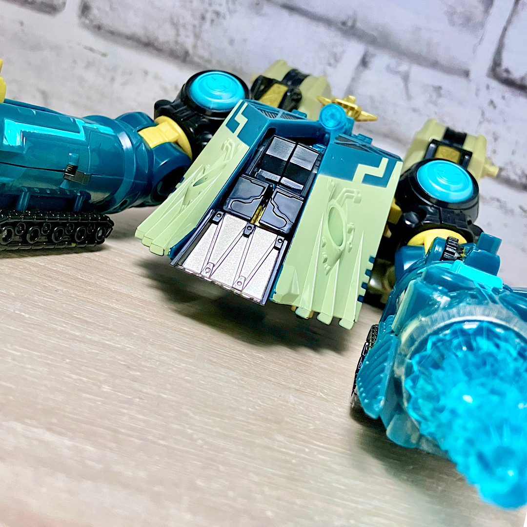 【ビークルモード】ビークルからいきましょう。他のギガンティオンTFと同じように、SF掘削マシーンに変形。中央の巨大なブレードと2つのドリルというケレン味たっぷりのデザインが最高です。ここまで「ドリル」に真っ向から向き合ったTFというのも珍しいのではないでしょうかw