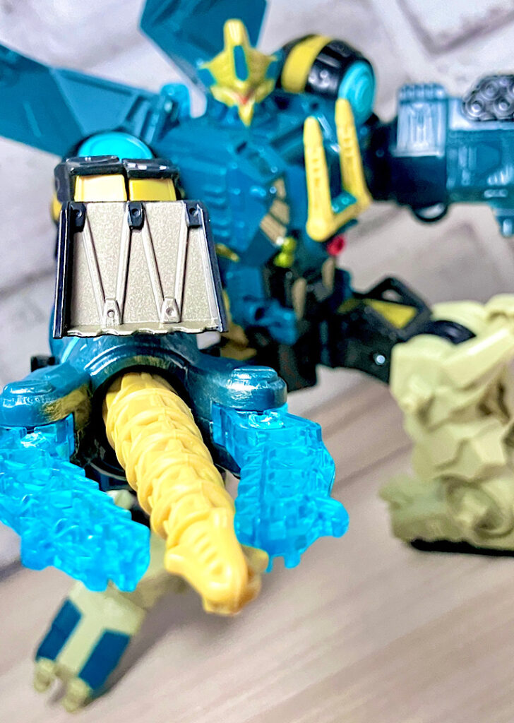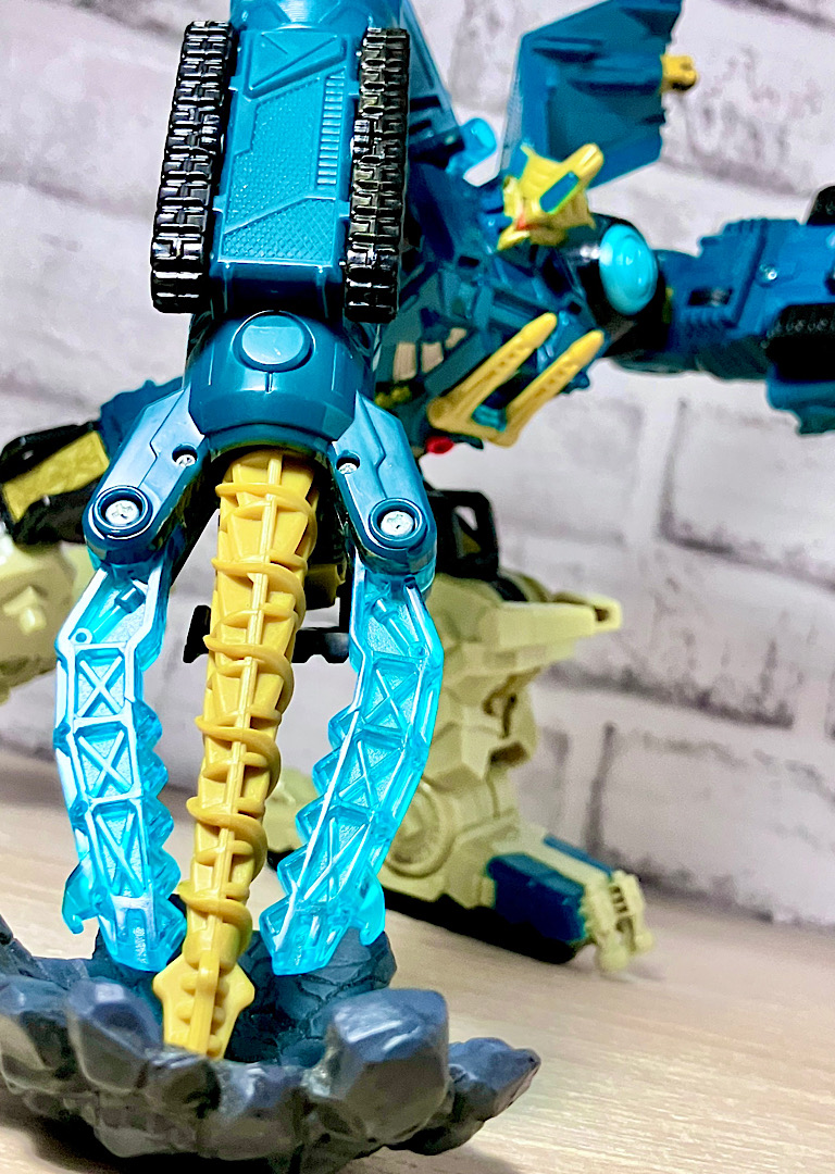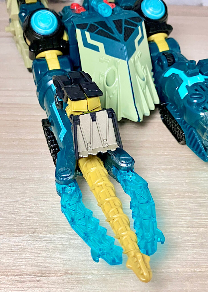 【ワークモード】ブレードをパカっと割って全体を立たせ、腕を下げればワークモードに。ギガンティオンTFに設定されている中間形態です。
