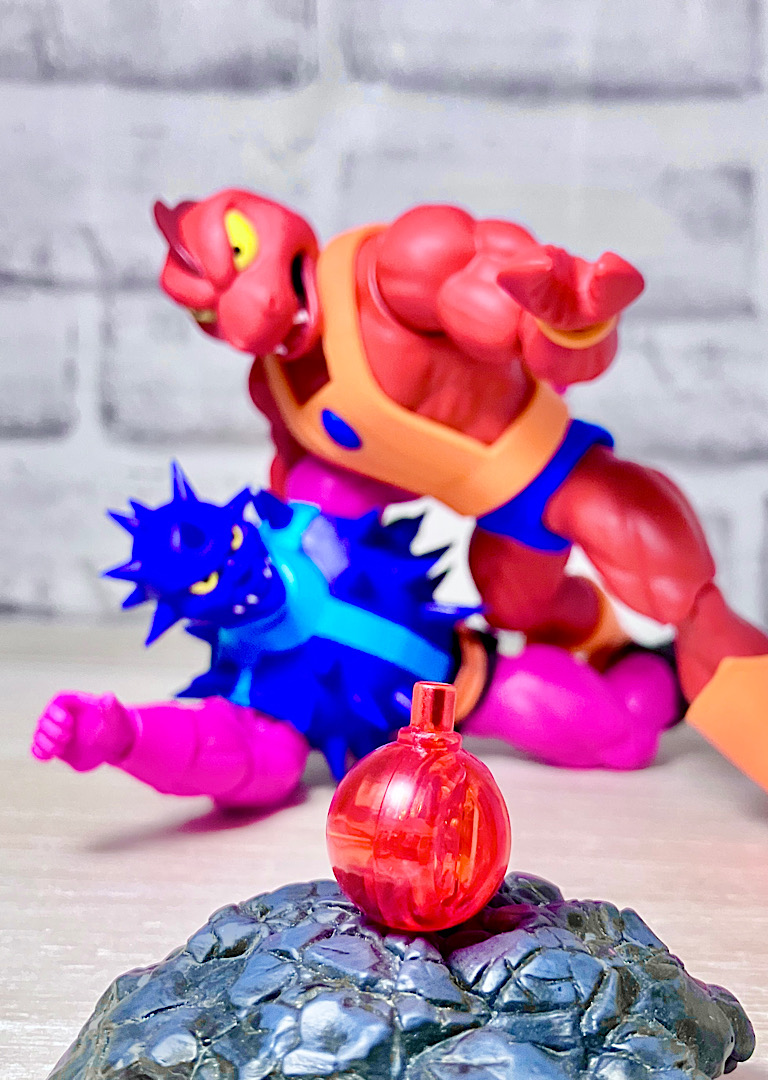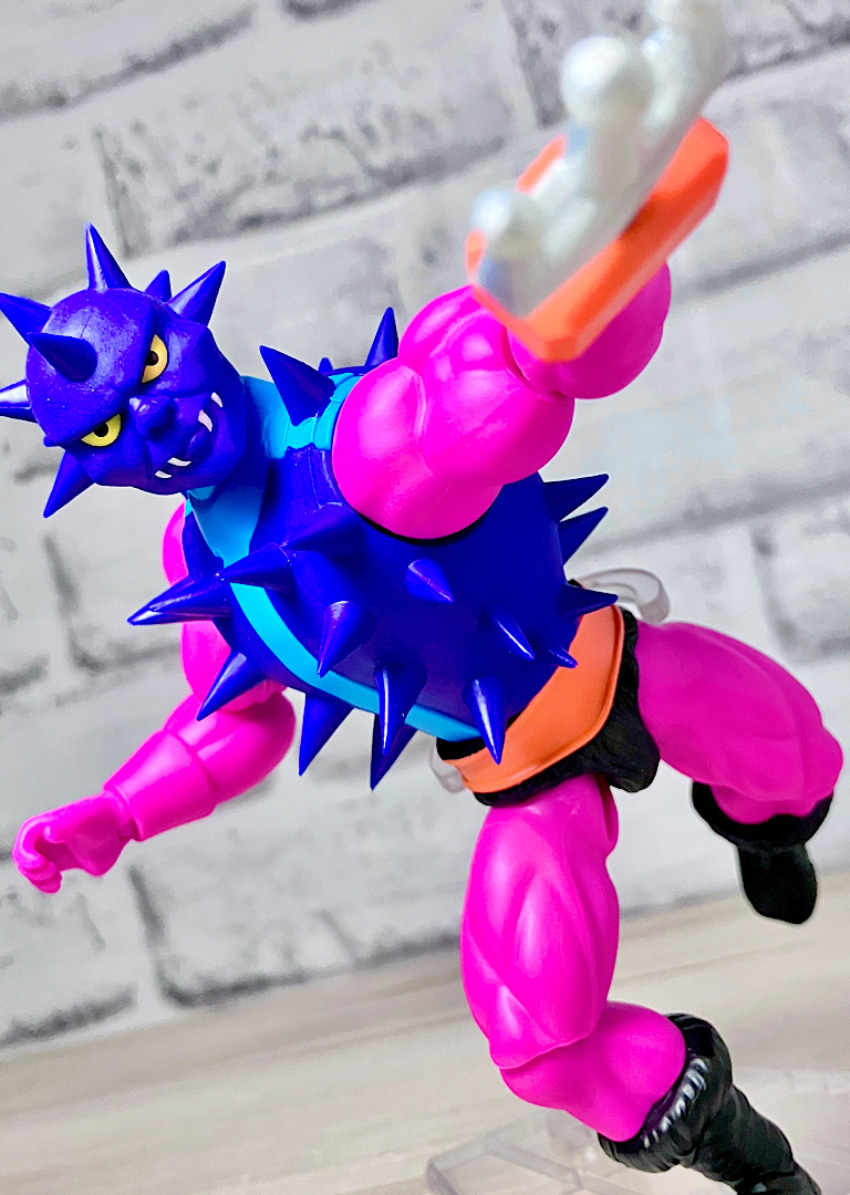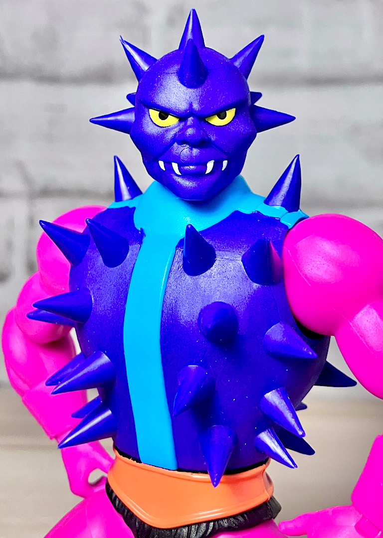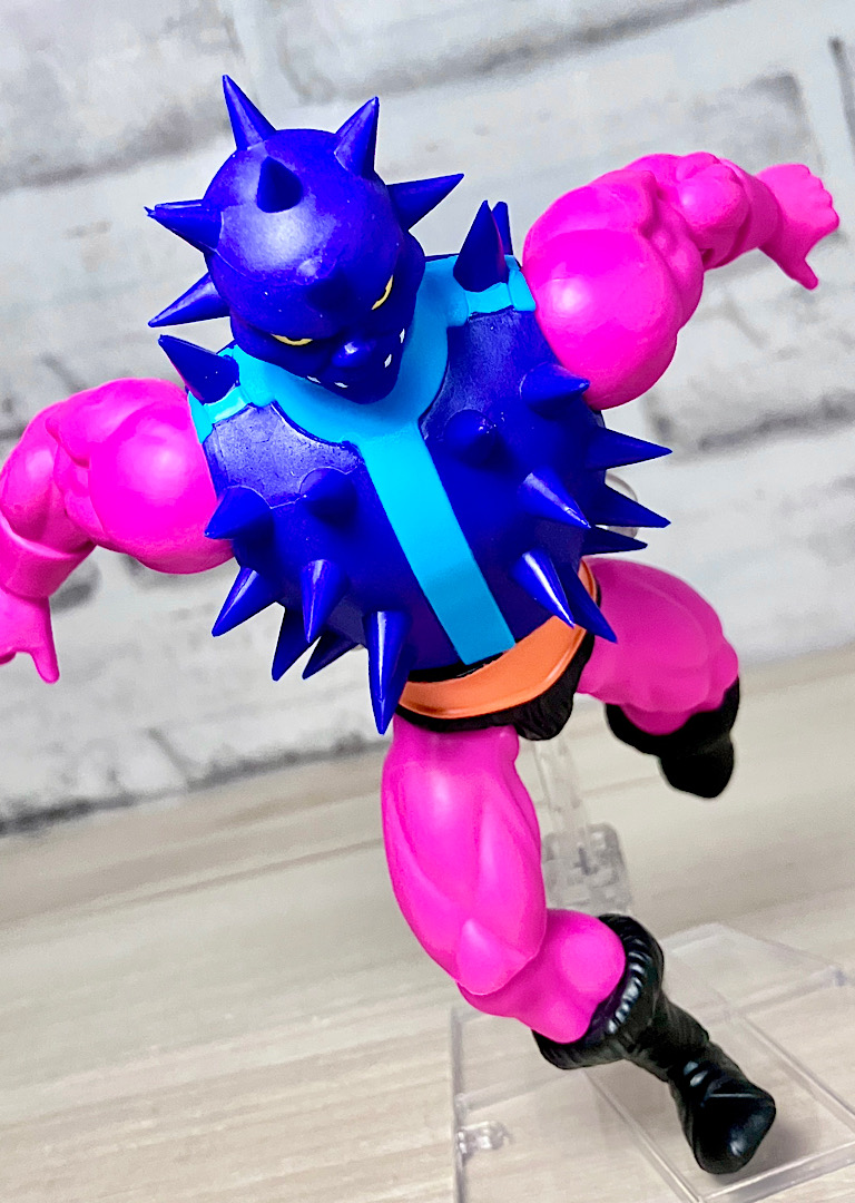 【アップ】怪我をしないように軟質でできたトゲトゲ。オリジナルトイは爬虫類系の顔をしていましたが、CC版はもっと人間味のある鬼みたいな顔です。