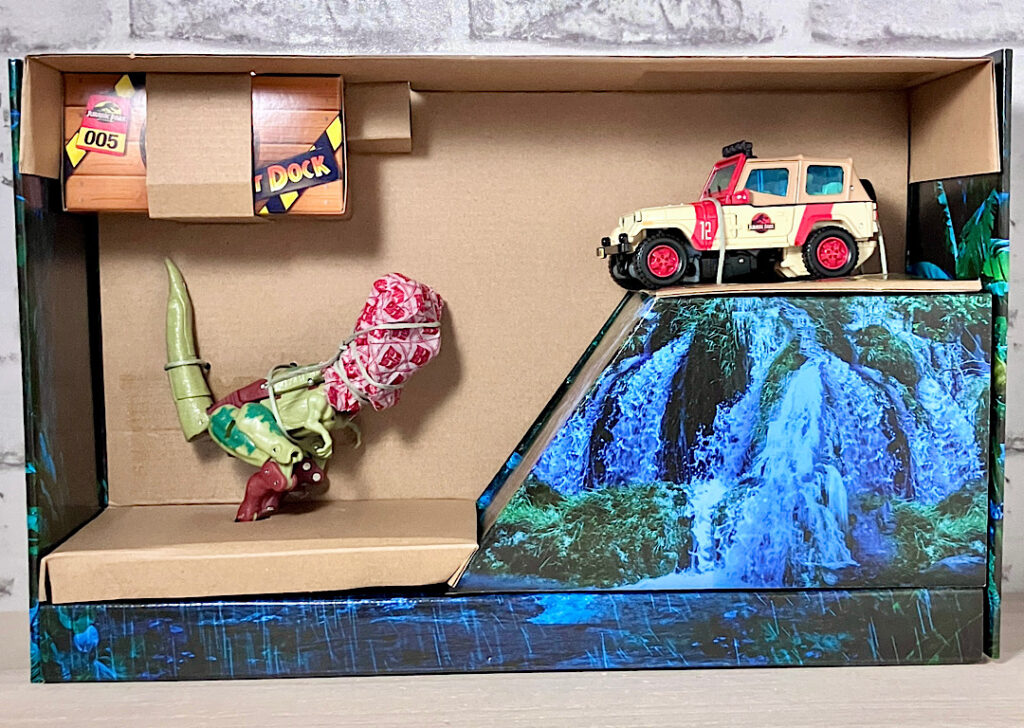余計なものを取り除いた状態。嵐の中スタックしてしまったネドリーのジープと、崖の下に潜むディロフォコンというジオラマになっています。