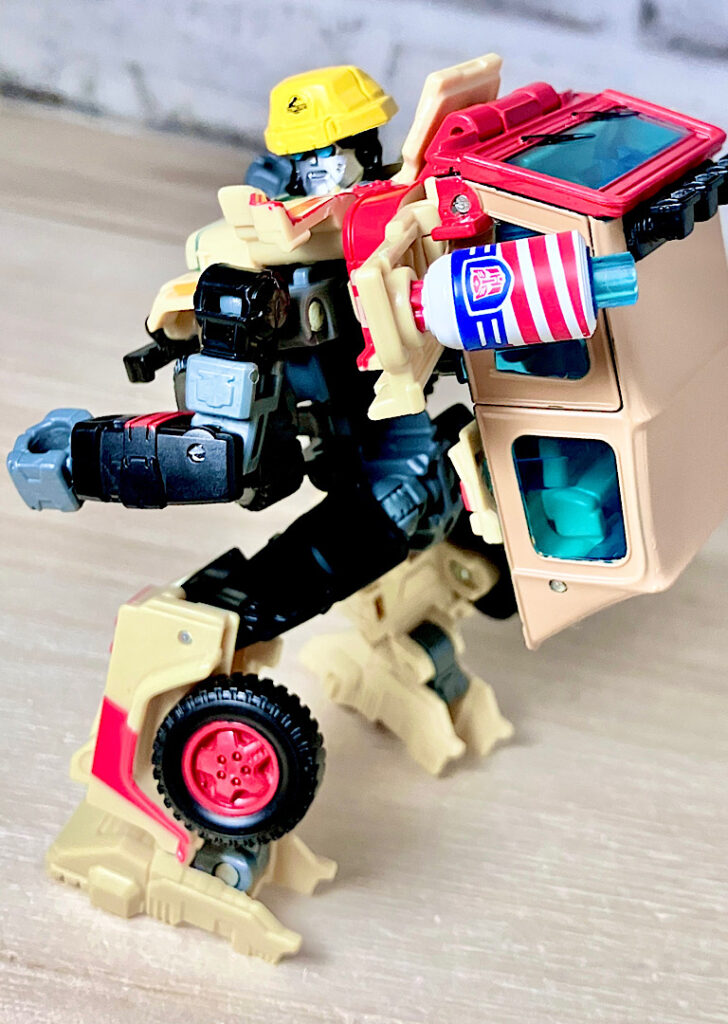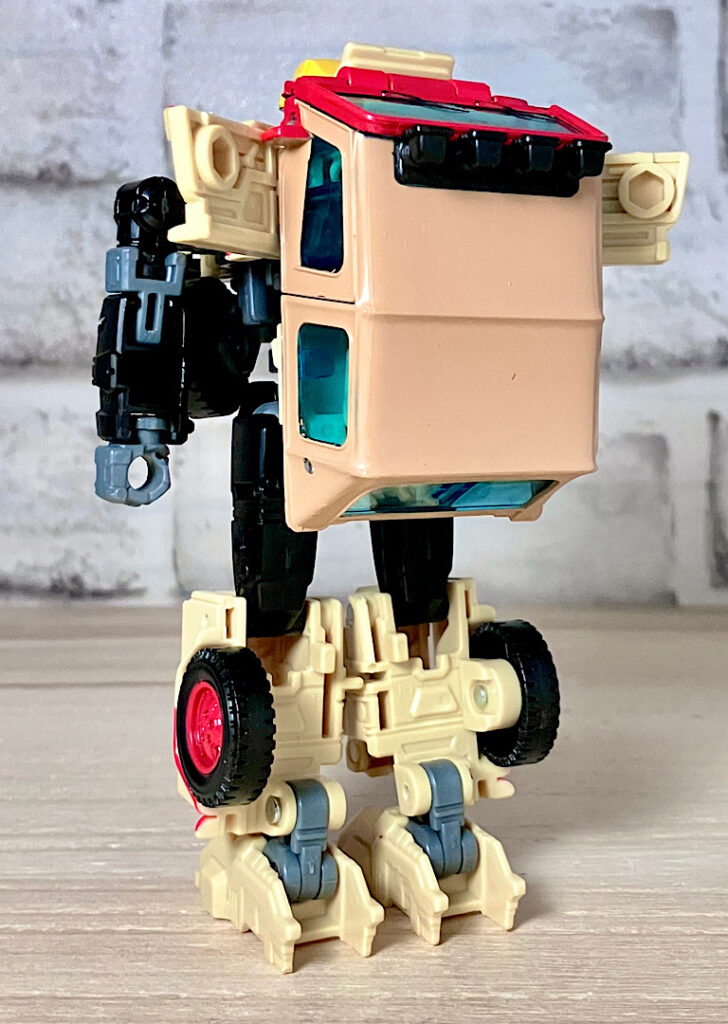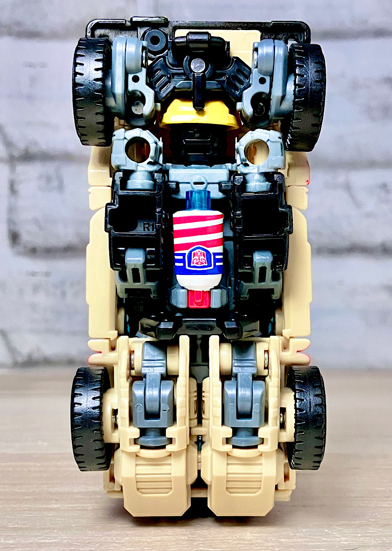 【ロボットモード】ネドリーを模したロボットモード。なんというか、彼のキャラの「ずんぐりむっくり」をちゃんと再現したなかなか挑戦的なデザインです。お腹に配置されたタイヤなんかは、でっぷりお腹の表現でしょうね(TFだと以前にもこんなキャラがいました)。そもそも劇中では印象のあまり良くないキャラをヒーロー側オートボットのロボットに選んじゃうというセンスがアメトイだよなーw