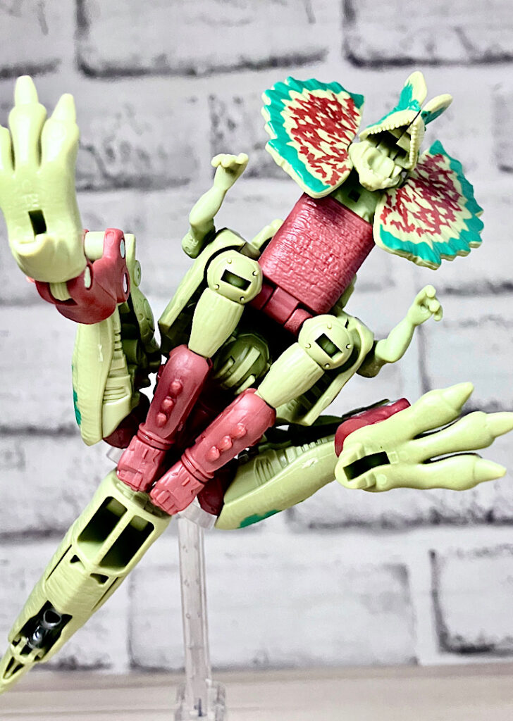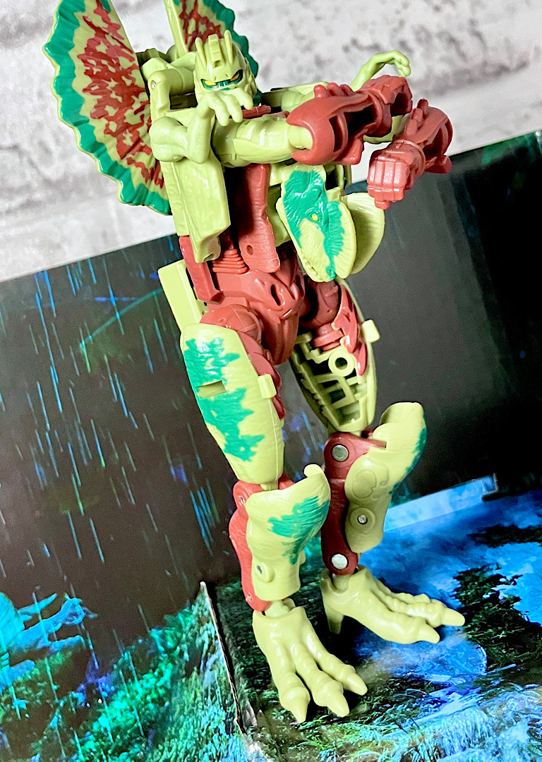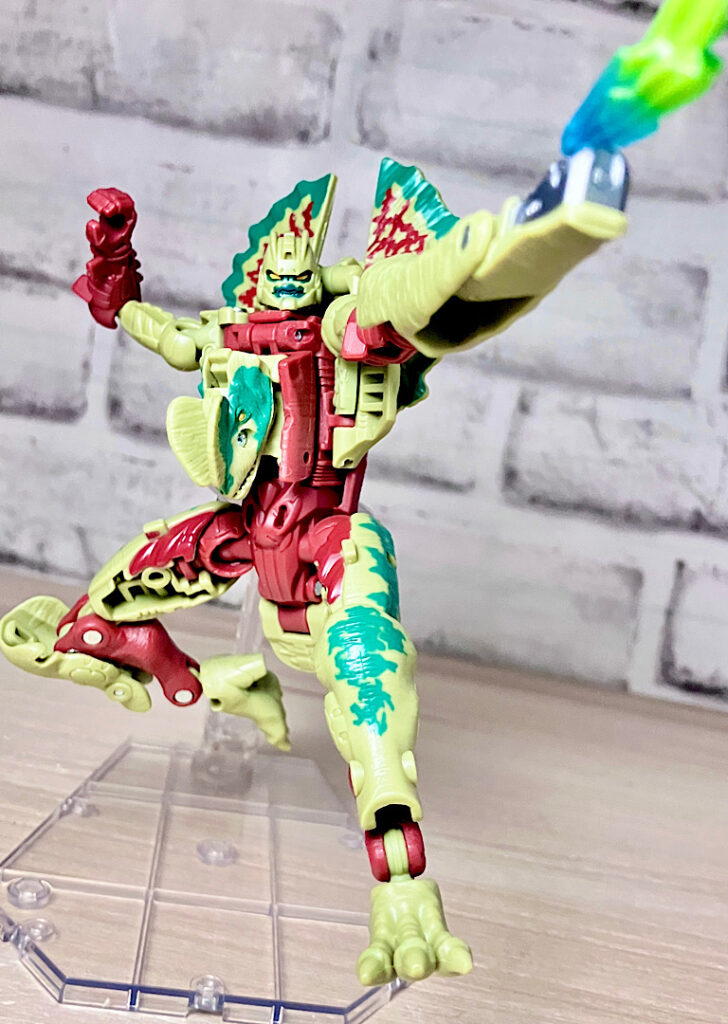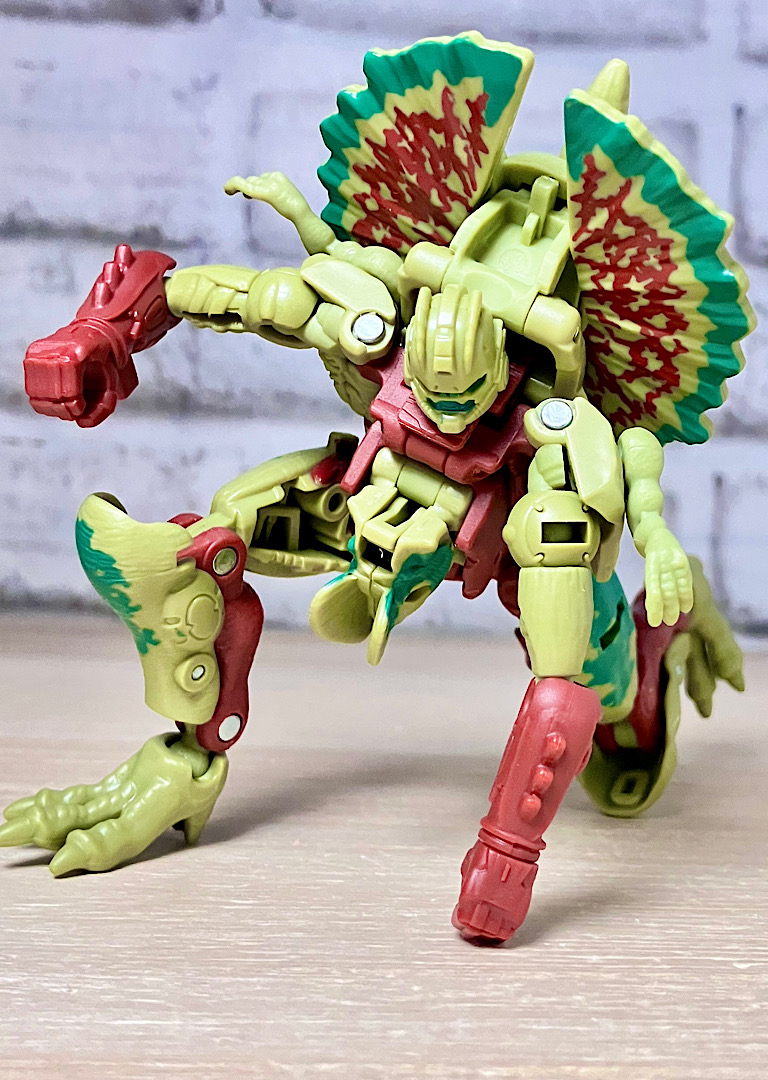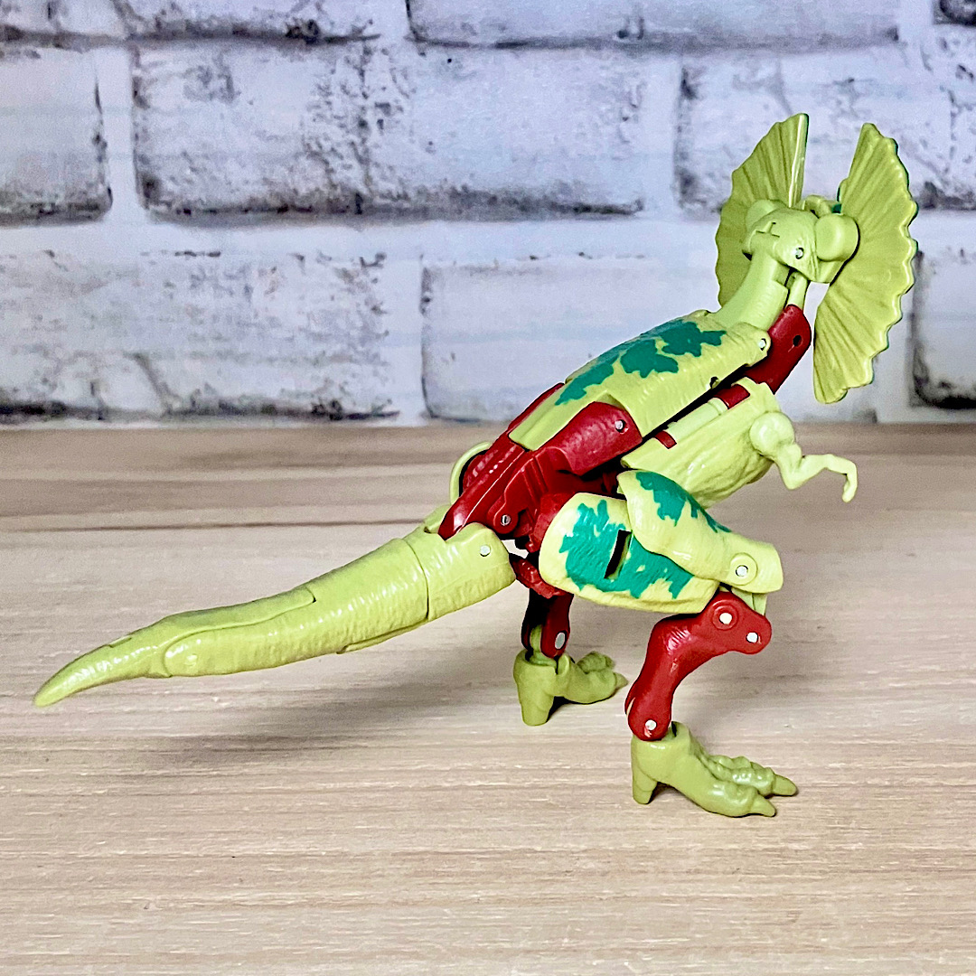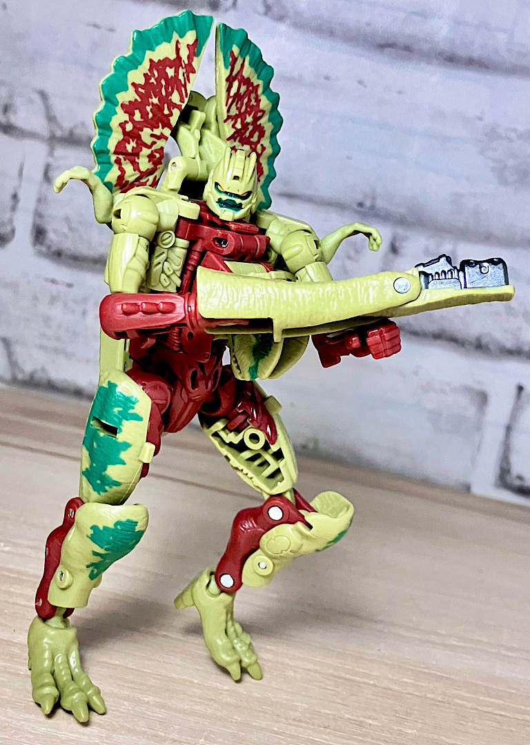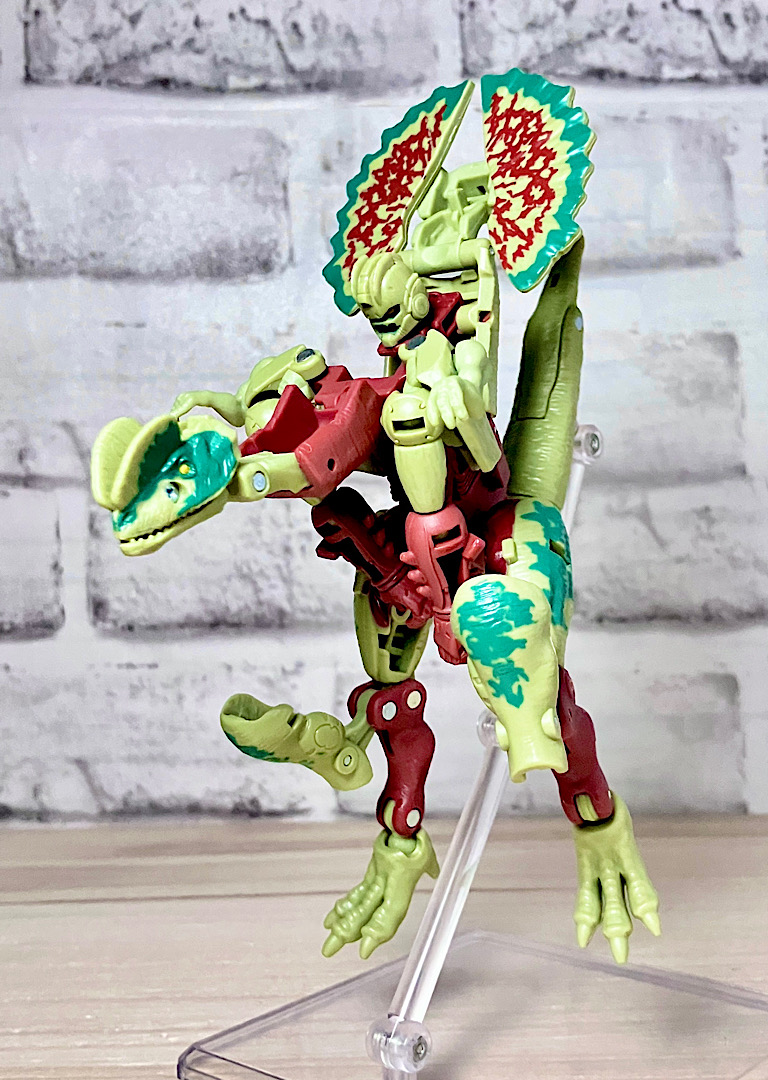 【ビーストモード】ディロフォサウルスに変形。ジュラ期の北アメリカに生息していた獣脚類。型としては完全新規で、往年のビーストウォーズアイテムを思わせる構造と姿は、20年ぶりくらいの新ビースト戦士として話題になりました。