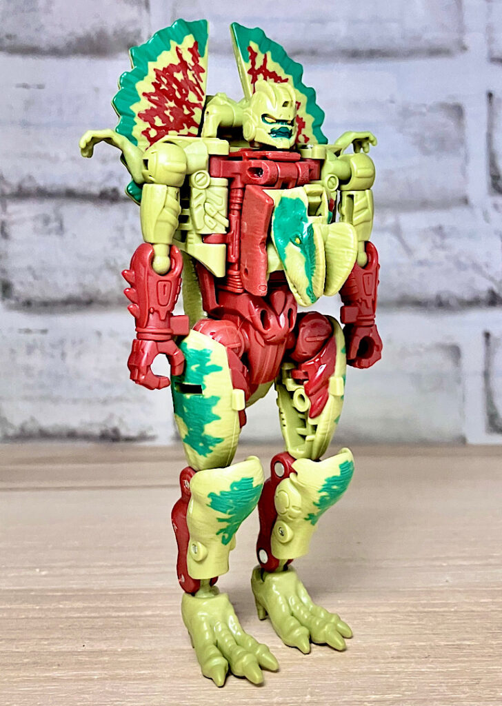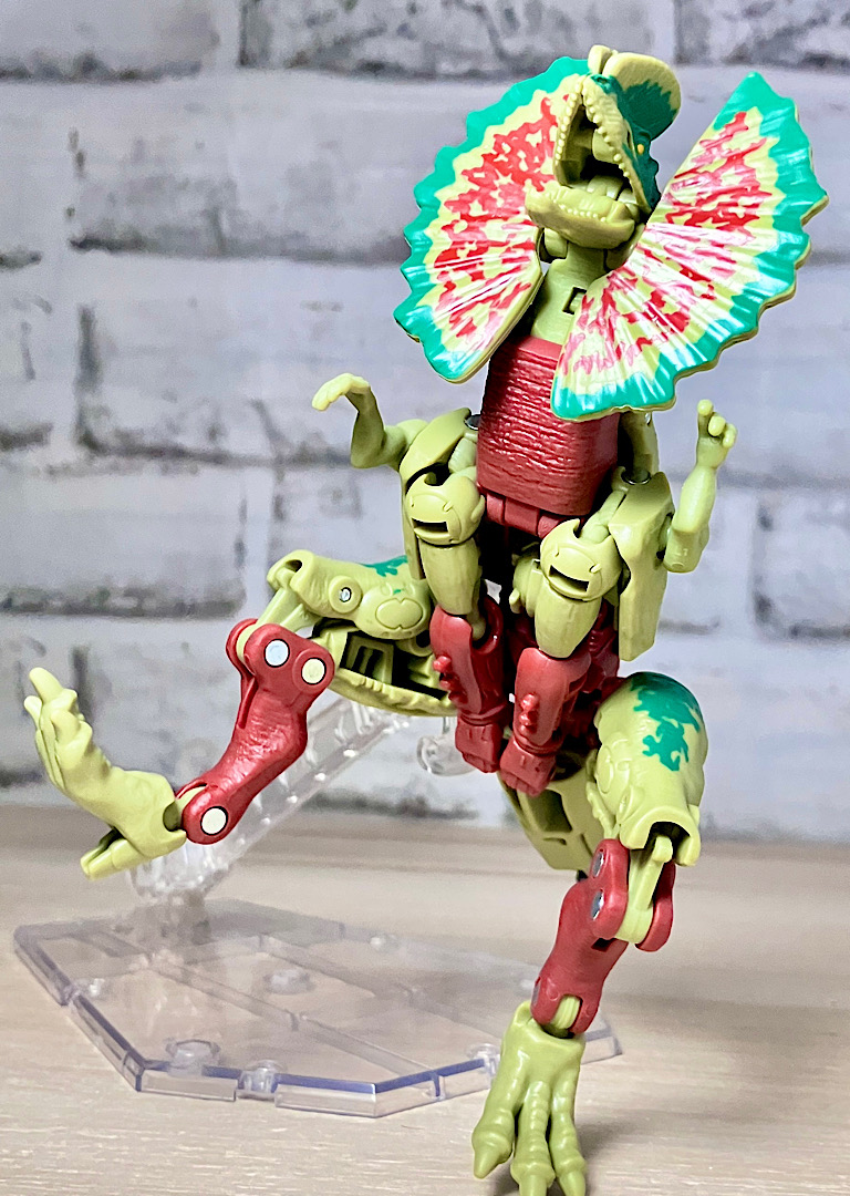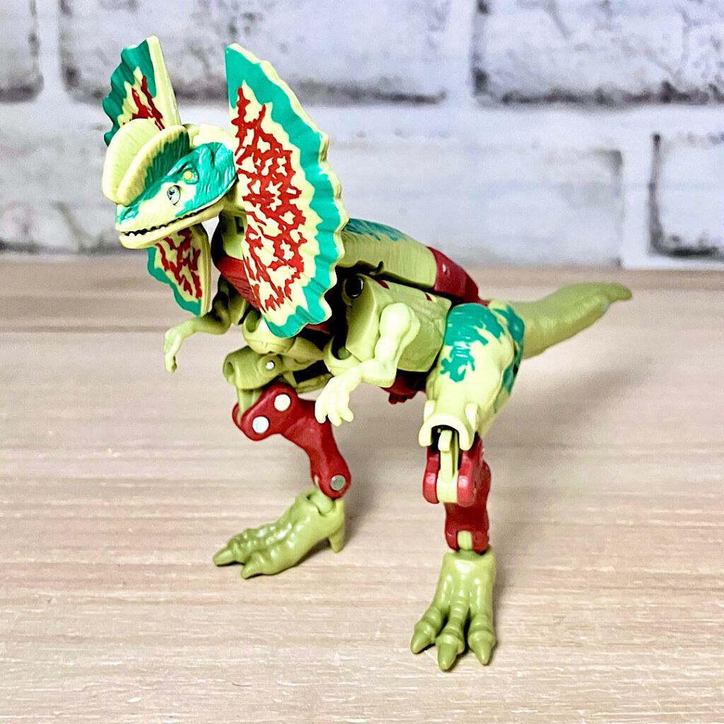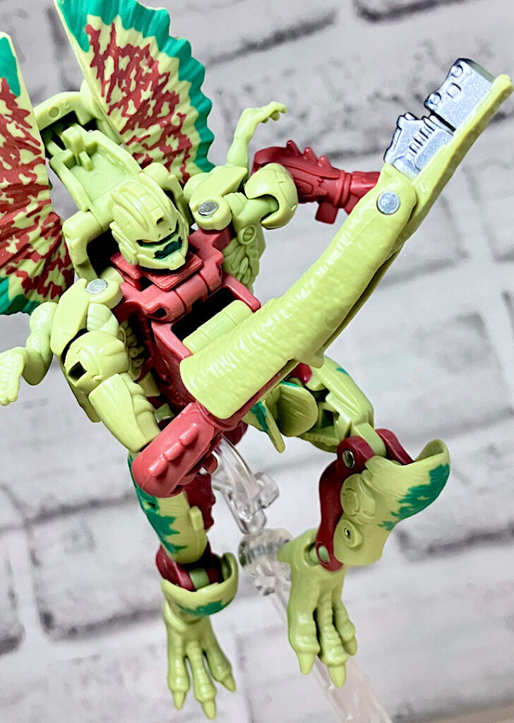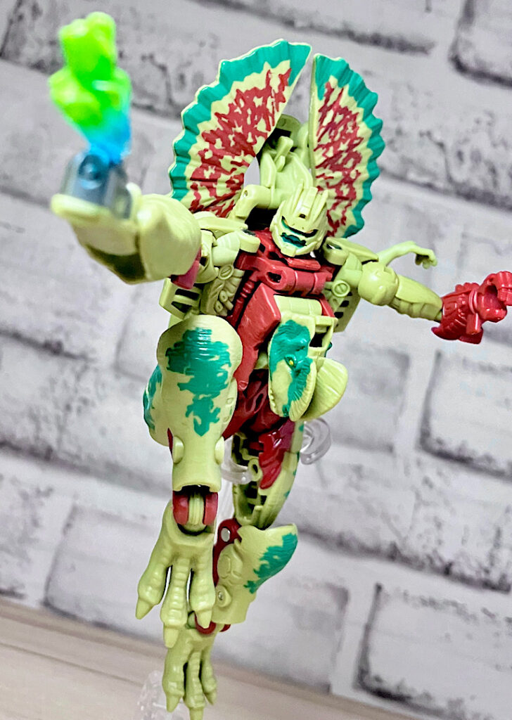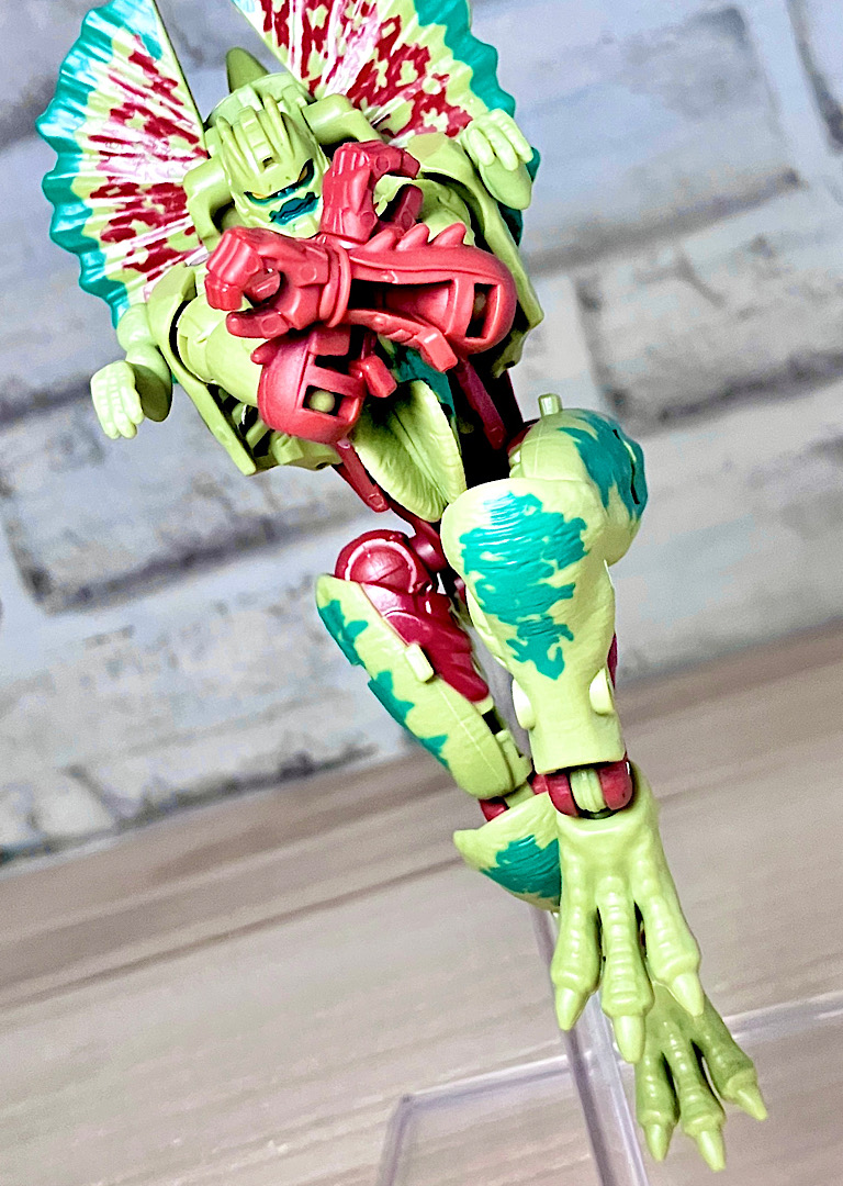 【ビーストモード】ディロフォサウルスに変形。ジュラ期の北アメリカに生息していた獣脚類。型としては完全新規で、往年のビーストウォーズアイテムを思わせる構造と姿は、20年ぶりくらいの新ビースト戦士として話題になりました。