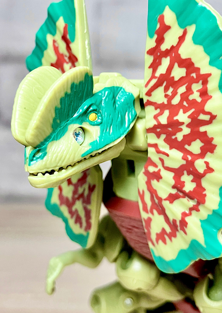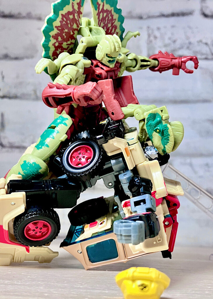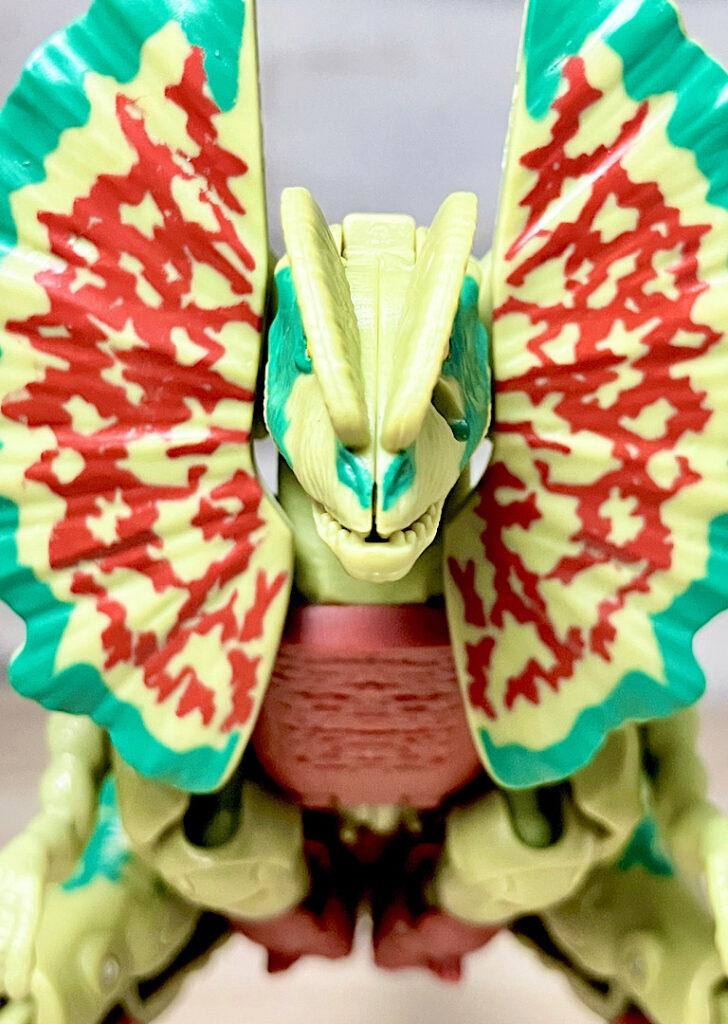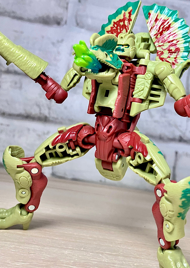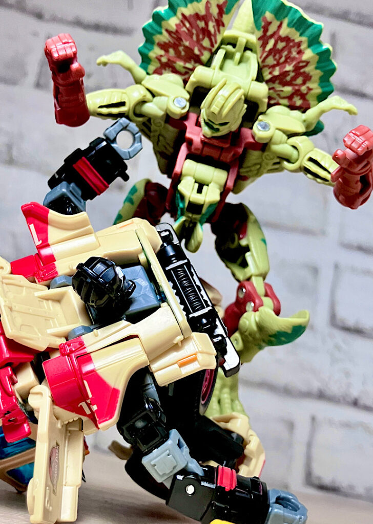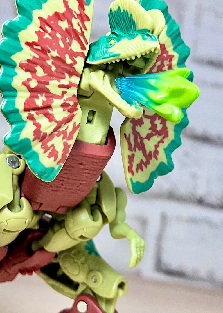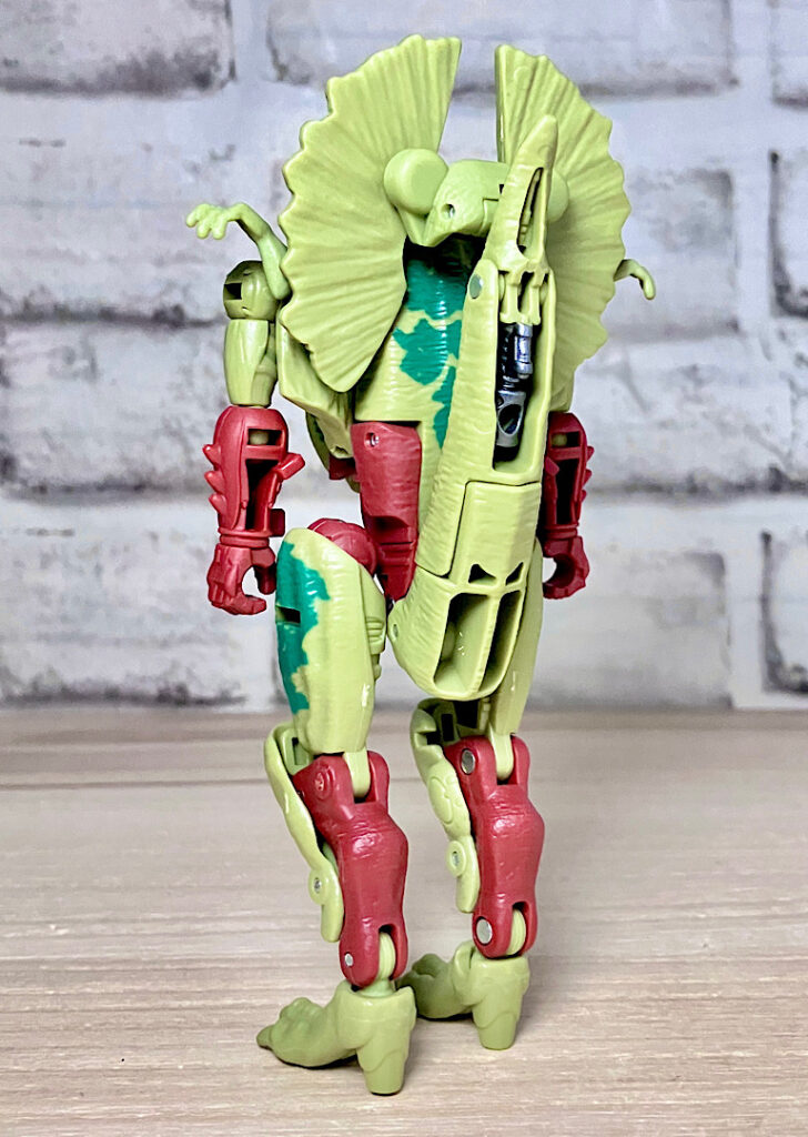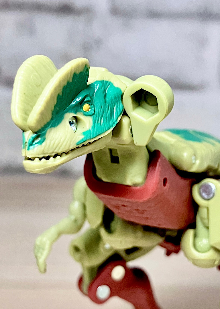 【ビーストモード】ディロフォサウルスに変形。ジュラ期の北アメリカに生息していた獣脚類。型としては完全新規で、往年のビーストウォーズアイテムを思わせる構造と姿は、20年ぶりくらいの新ビースト戦士として話題になりました。