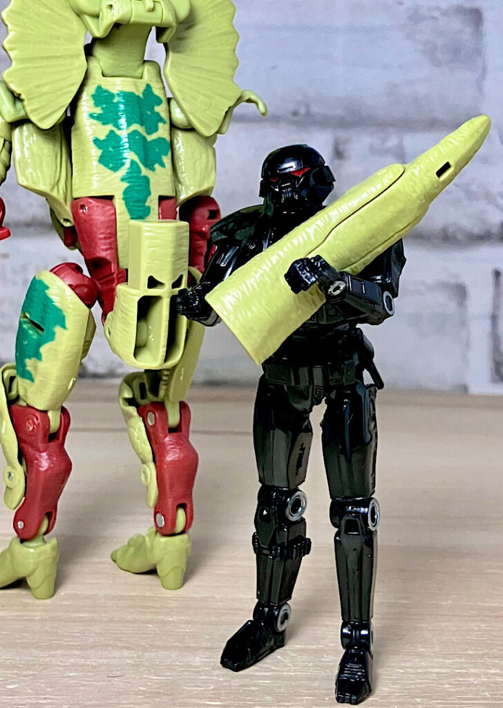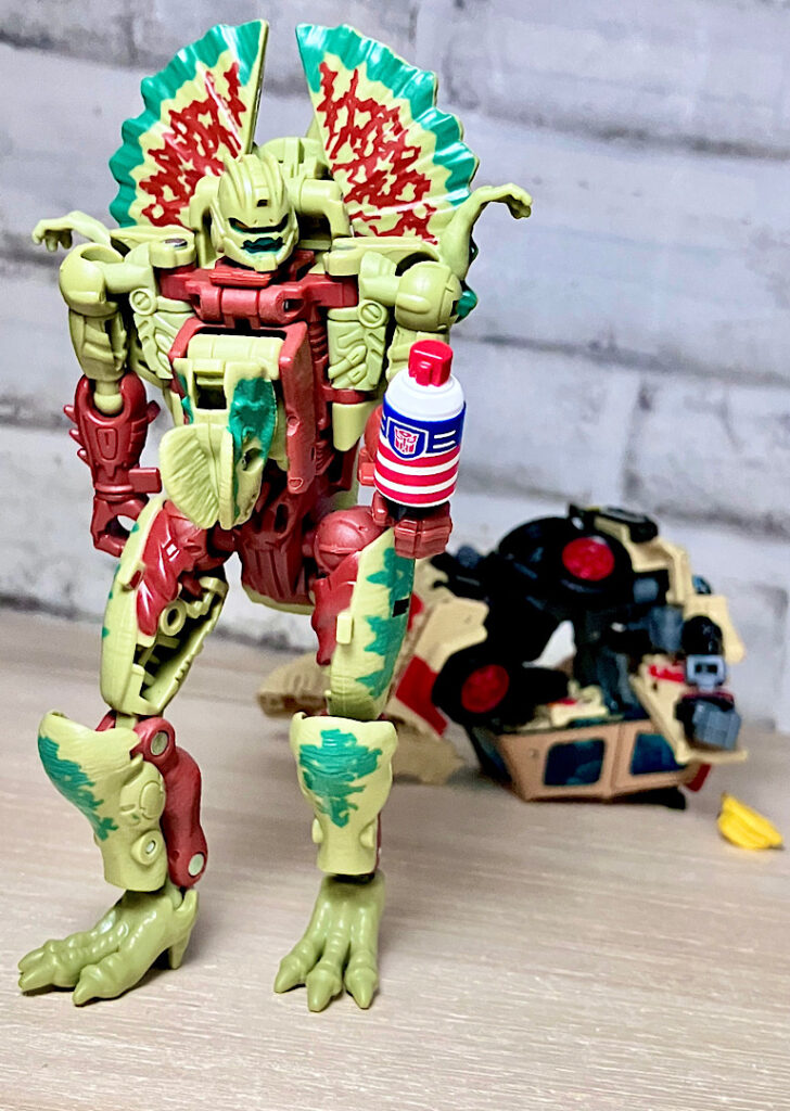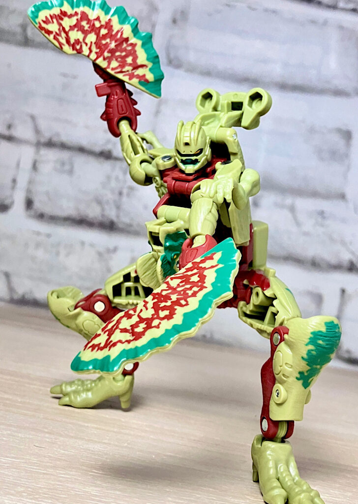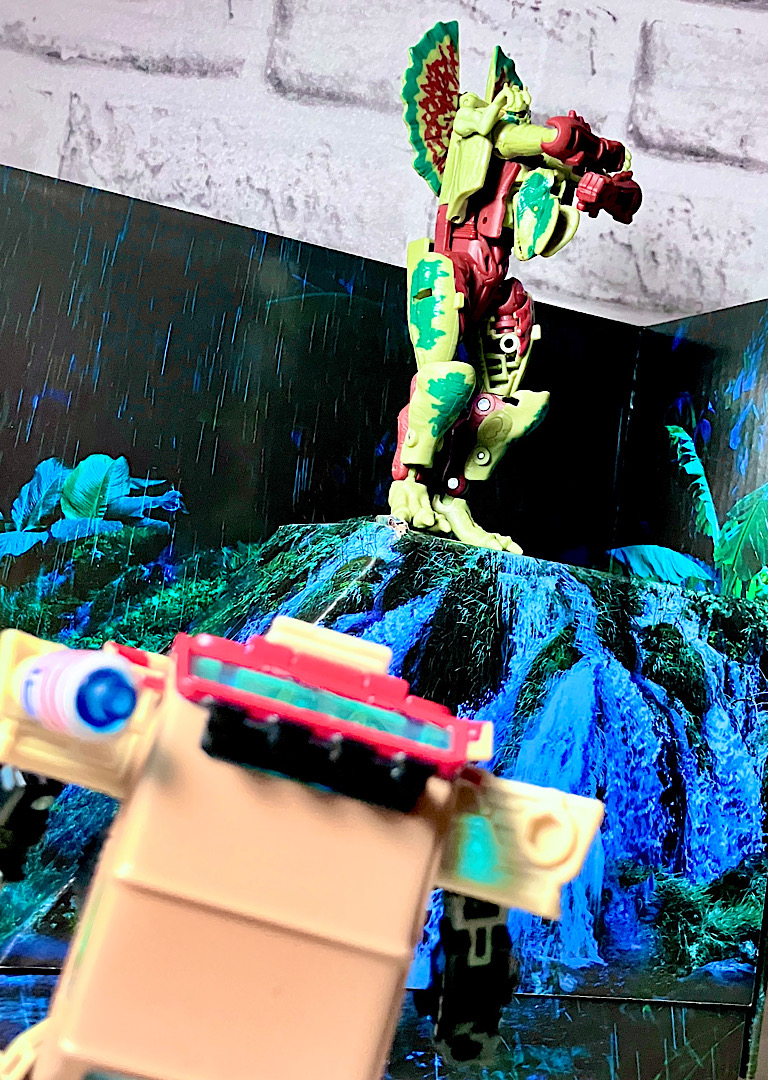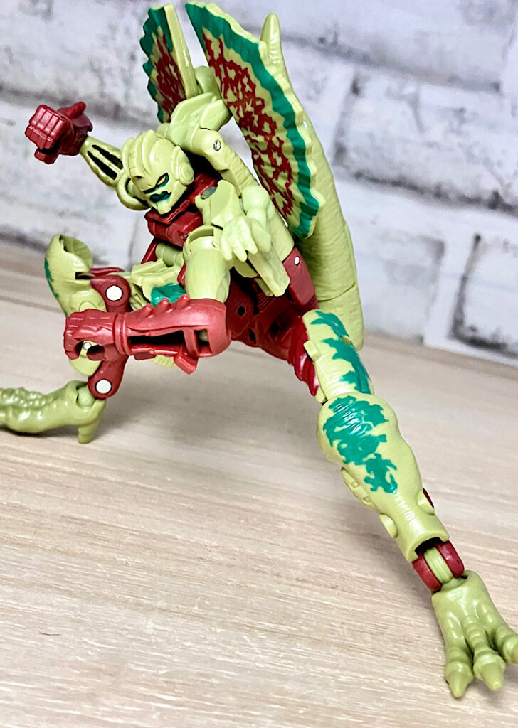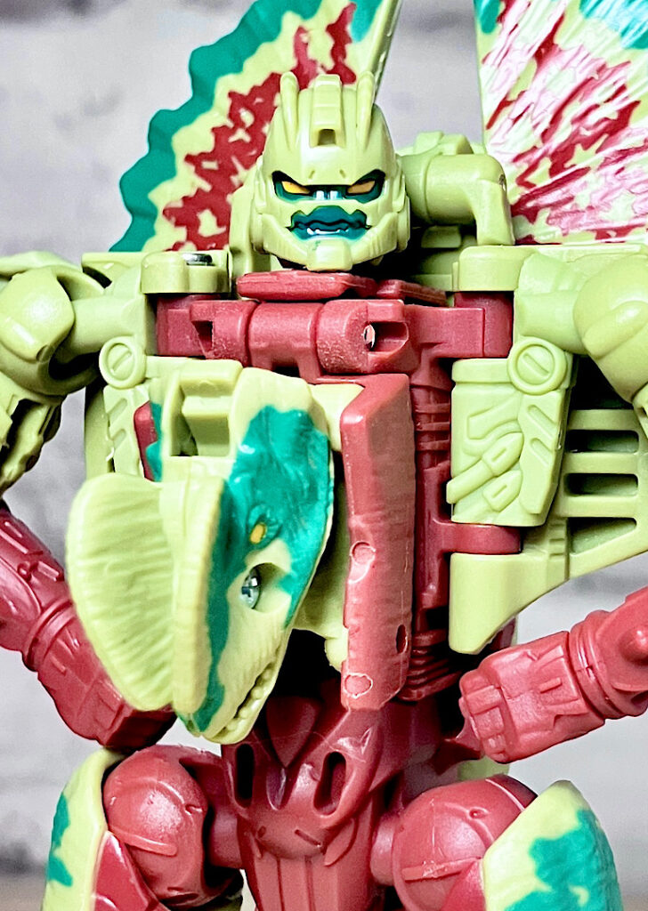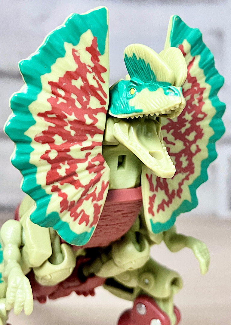 【ビーストモード】ディロフォサウルスに変形。ジュラ期の北アメリカに生息していた獣脚類。型としては完全新規で、往年のビーストウォーズアイテムを思わせる構造と姿は、20年ぶりくらいの新ビースト戦士として話題になりました。