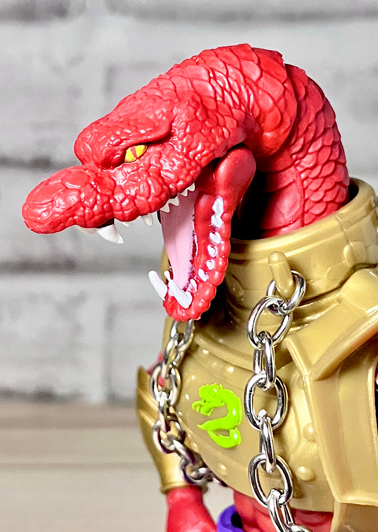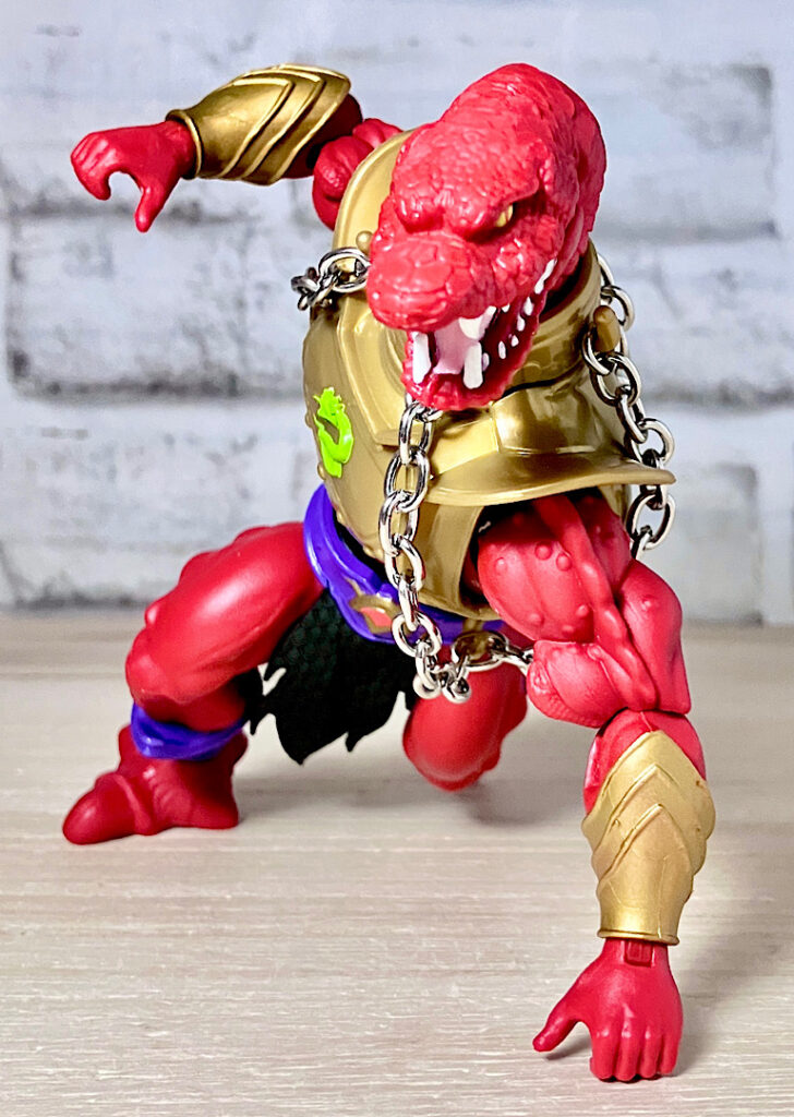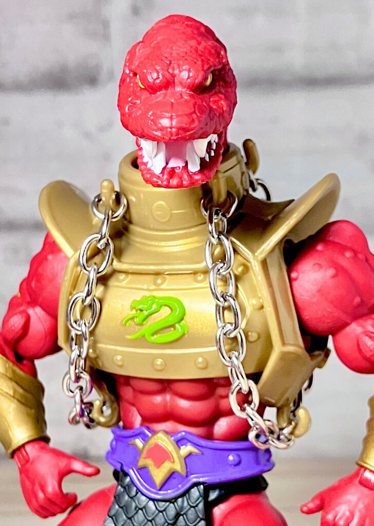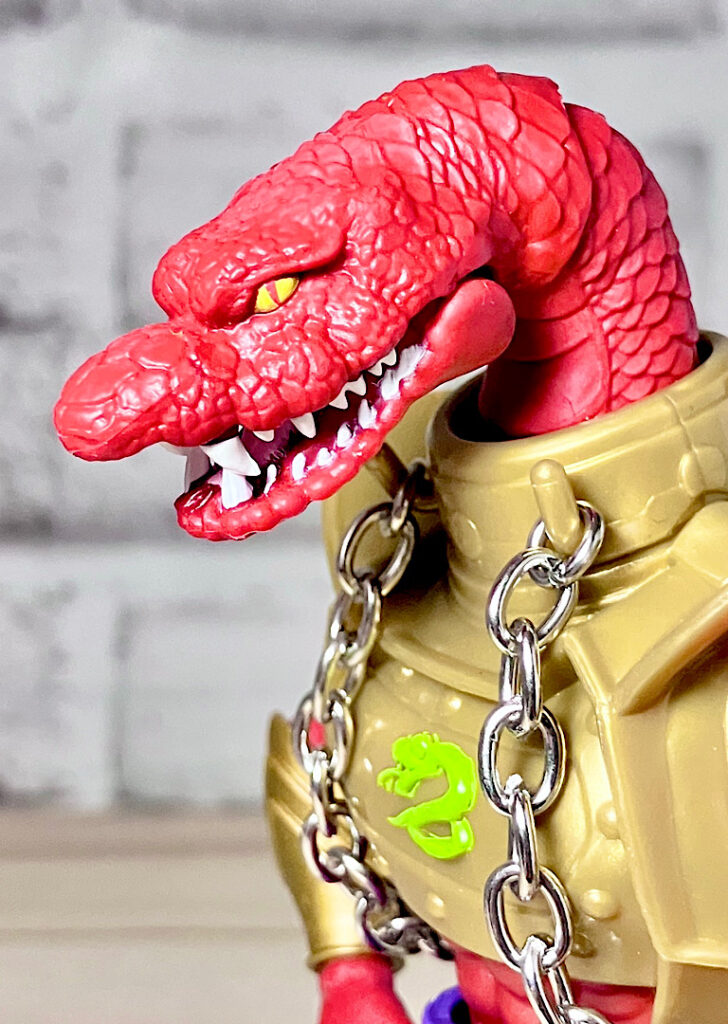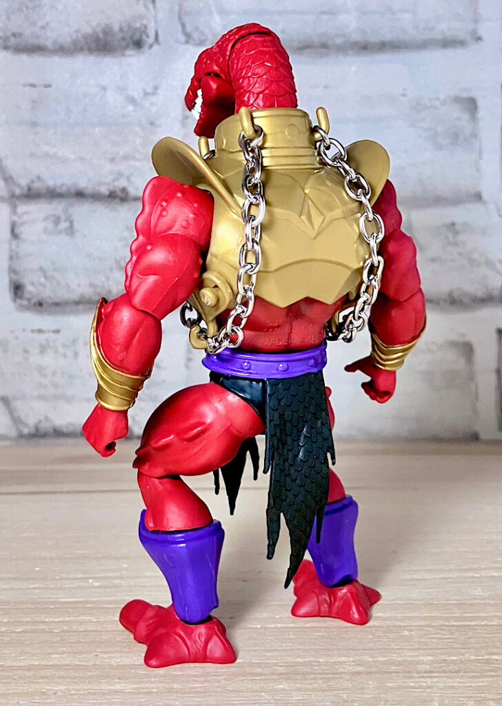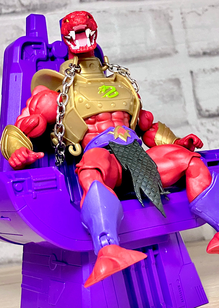 【フロント&リア】スネークマンなのでもちろんヘビをモチーフにしたデザインなのですが、明らかにいつもとは雰囲気の異なる解像度の高いディテールをしています。アーマーも線の多い複雑な形状ですし、チェーンは本物の金属。MOTUじゃなくて別のファンタジーフィギュアみたいです。