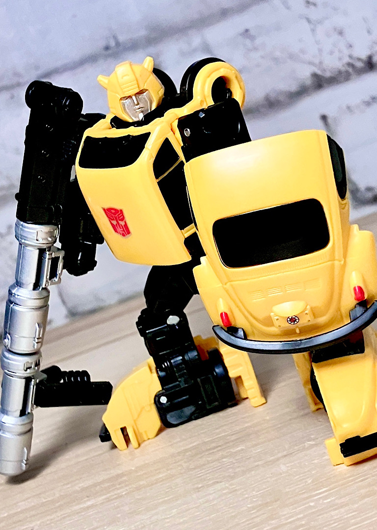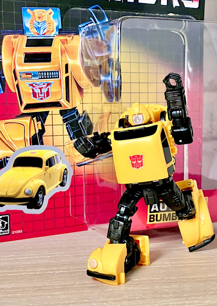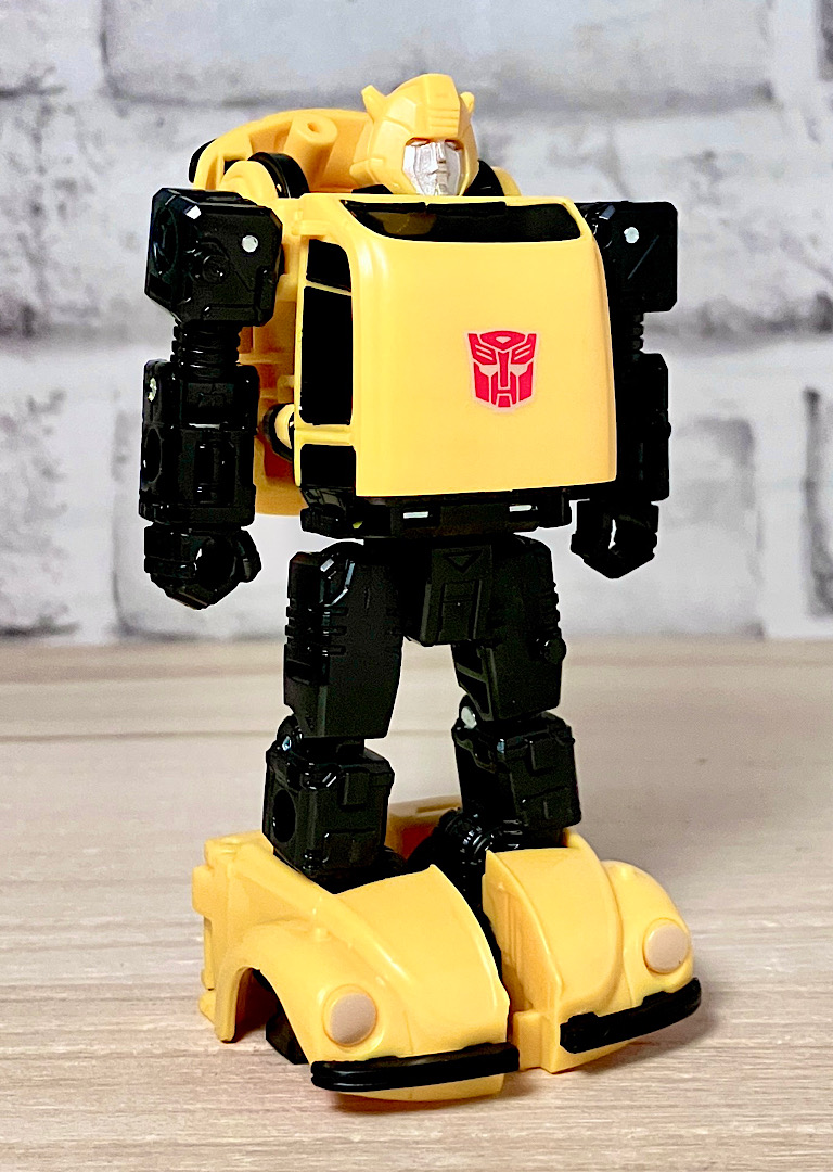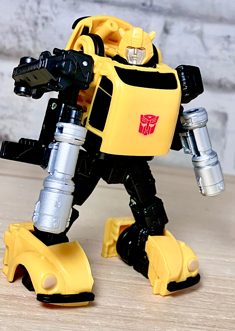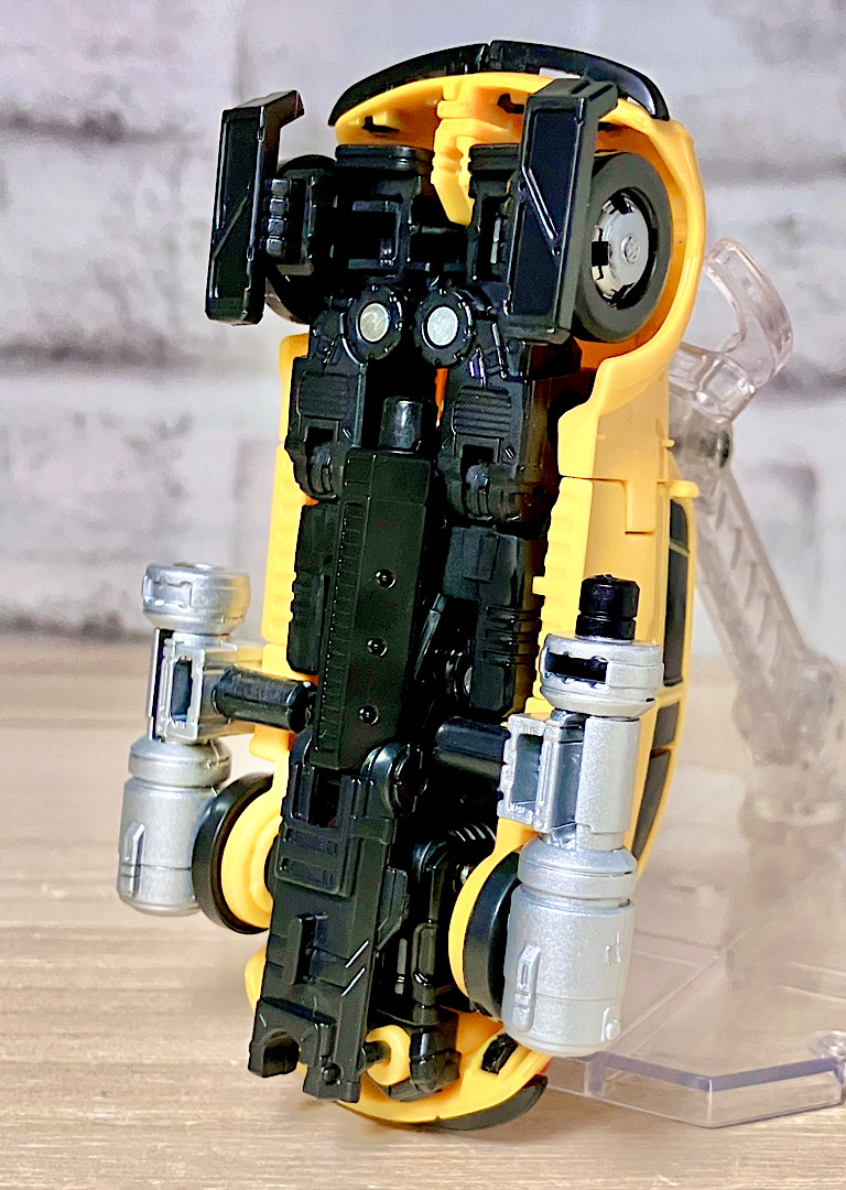 【ロボットモード】使われている型はなんと2020年WFCトリロジー(Netflix)版バンブルビー。フォルクスワーゲンのライセンスをとったジェネ系ビーのひとつの決定版でしたが、販路限定だったため出回った数が少なく、市場価格がすぐに高騰してしまったいわくつきのアイテムです。こんな形ではありますが待望の再販という意味も込められているんでしょうか。