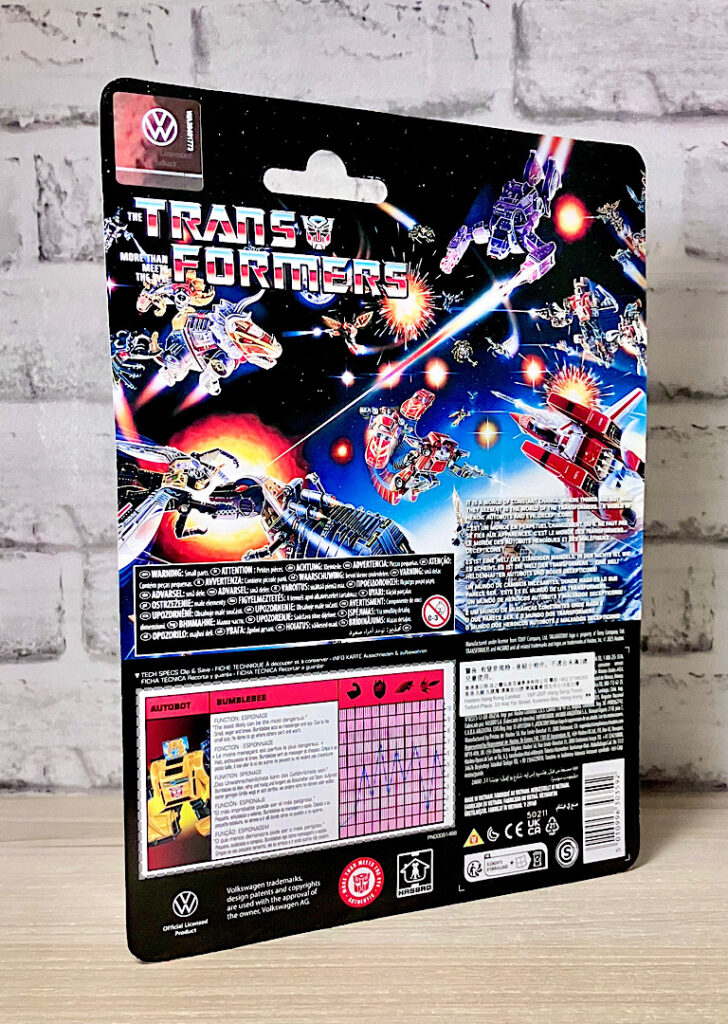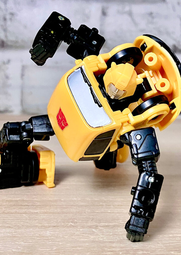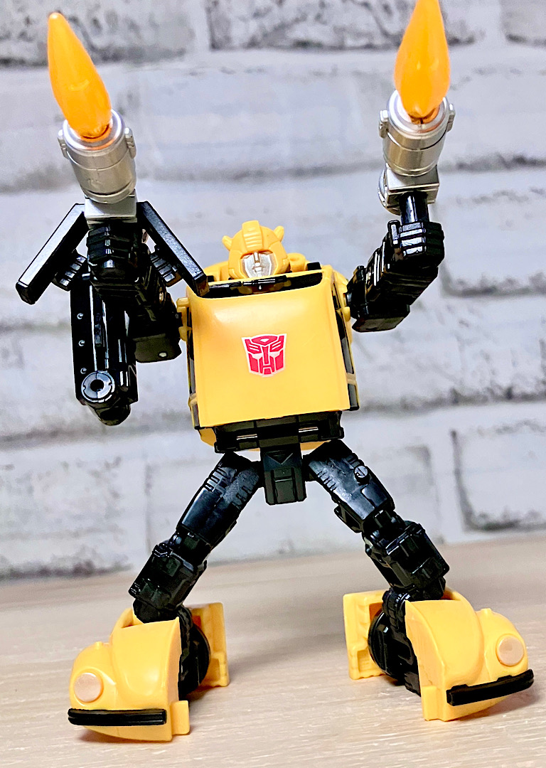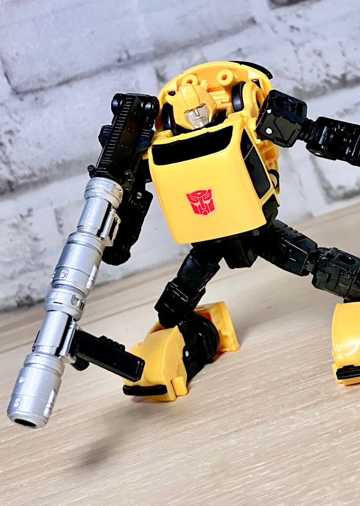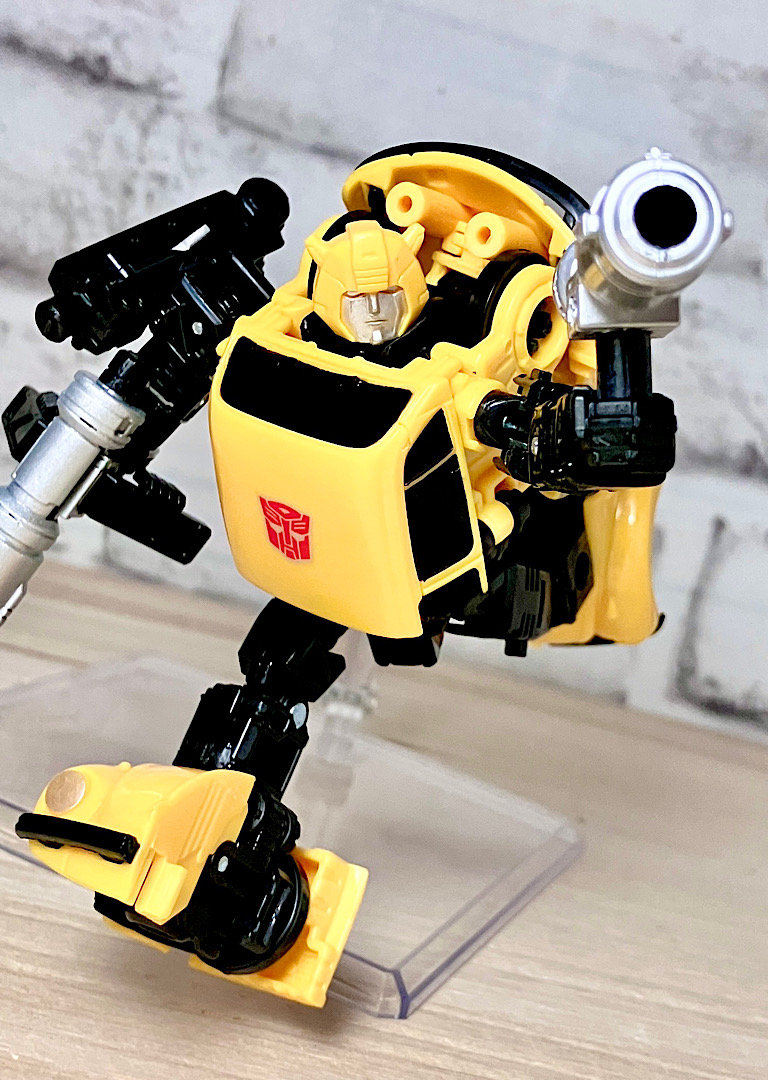 【ロボットモード】使われている型はなんと2020年WFCトリロジー(Netflix)版バンブルビー。フォルクスワーゲンのライセンスをとったジェネ系ビーのひとつの決定版でしたが、販路限定だったため出回った数が少なく、市場価格がすぐに高騰してしまったいわくつきのアイテムです。こんな形ではありますが待望の再販という意味も込められているんでしょうか。