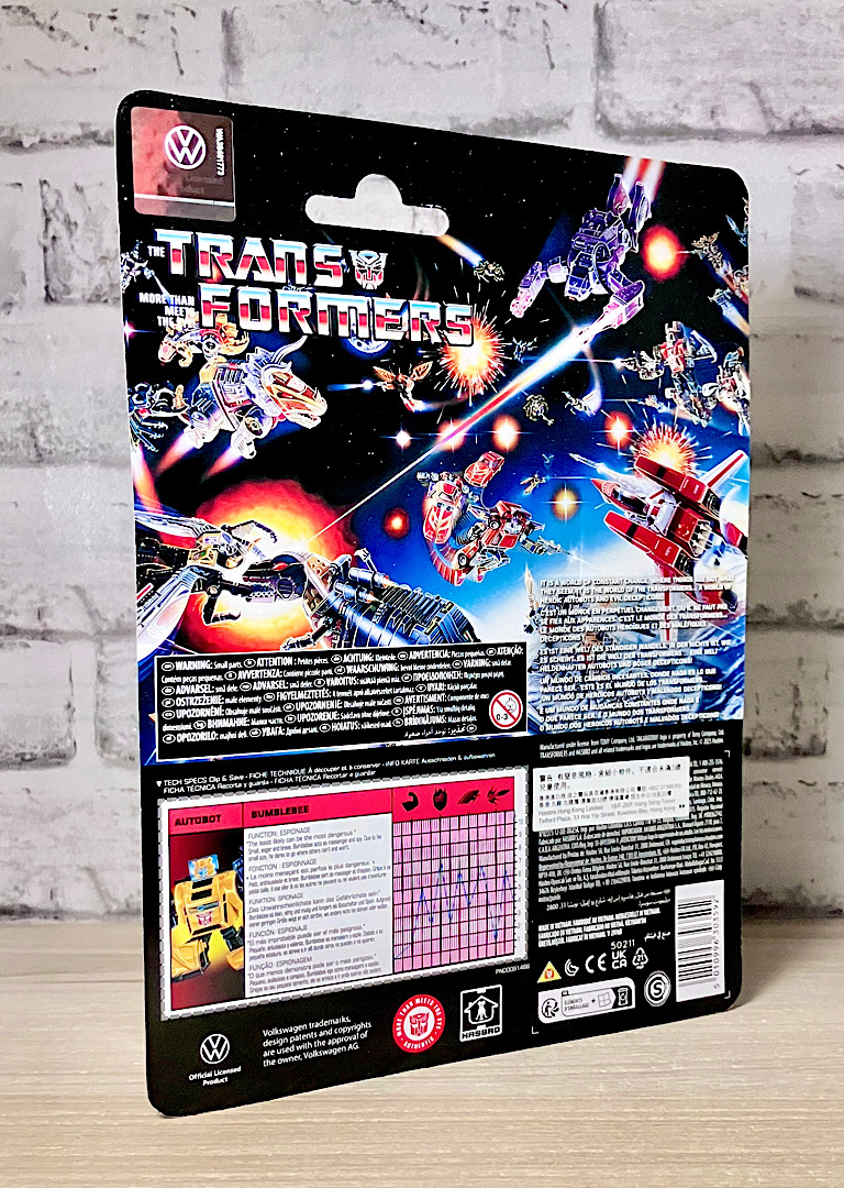 【パッケージ】「トランスフォーマーレトロ」は、2023年から続く米ウォルマート限定シリーズ。もともとはG1ビンテージトイを現代風解釈のアニメ風カラーにリペイントしたいわゆる復刻シリーズの一種でしたが、2025年になって突如、近年のジェネレーションズ系アイテムをG1ビンテージトイ風にリデコするという逆パターン路線が始まりました。第1弾はこちらバンブルビーとギアーズ。パッケージは1980年代のブリスターを模した凝ったもので、裏面には懐かしの群像イラストやテックスペックチャートまで再現されております。